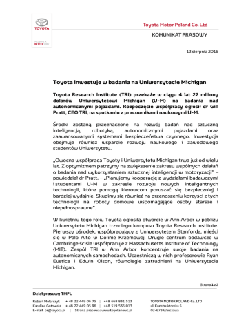 12 sierpnia 2016 Toyota inwestuje w badania na Uniwersytecie Michigan Toyota Research Institute (TRI) przekaże w ciągu 4 lat 22 miliony dolarów Uniwersytetowi Michigan (U-M) na badania nad autonomicznymi pojazdami. Rozpoczęcie współpracy ogłosił dr Gill Pratt, CEO TRI, na spotkaniu z pracownikami naukowymi U-M. Środki zostaną przeznaczone na rozwój badań nad sztuczną inteligencją, robotyką, autonomicznymi pojazdami oraz zaawansowanymi systemami bezpieczeństwa czynnego. Inwestycja obejmuje również wsparcie rozwoju naukowego i zawodowego studentów Uniwersytetu. „Owocna współpraca Toyoty i Uniwersytetu Michigan trwa już od wielu lat. Z optymizmem patrzymy na zwiększenie zakresu wspólnych działań o badania nad wykorzystaniem sztucznej inteligencji w motoryzacji” – powiedział dr Pratt. – „Planujemy kooperację z wydziałami badawczymi i studentami U-M w zakresie rozwoju nowych inteligentnych technologii, które pomogą kierowcom poruszać się bezpieczniej i bardziej wydajnie. Skupimy się również na przenoszeniu korzyści z tych technologii na roboty domowe wspomagające osoby starsze i niepełnosprawne”. W kwietniu tego roku Toyota ogłosiła otwarcie w Ann Arbor w pobliżu Uniwersytetu Michigan trzeciego kampusu Toyota Research Institute. Pierwszy ośrodek, współpracujący z Uniwersytetem Stanforda, mieści się w Palo Alto w Dolinie Krzemowej. Drugie centrum badawcze w Cambridge ściśle współpracuje z Massachusetts Institute of Technology (MIT). Zespół TRI w Ann Arbor koncentruje swoje badania na autonomicznych samochodach. Uczestniczą w nich profesorowie Ryan Eustice i Edwin Olson, równolegle zatrudnieni na Uniwersytecie Michigan. Strona 1 z 2 Toyota współpracuje z Uniwersytetem Michigan na kilku płaszczyznach. Jest m.in. fundatorem ośrodka badawczego Mobility Transformation Center (MTC), który prowadzi prace nad stworzeniem systemu komunikacji między pojazdami, umożliwiającego komercjalizację autonomicznych samochodów. Do ośrodka należy unikalne sztuczne miasto, w którym na powierzchni 13 hektarów testowane są najnowsze technologie pojazdów autonomicznych w bezpiecznym i kontrolowanym środowisku. Toyota wspiera także badania nad zaawansowanymi technologiami bezpieczeństwa czynnego pojazdów, prowadzonymi w uniwersyteckim ośrodku Transportation Research Institute. „W laboratoriach Uniwersytetu Michigan doskonalimy roboty w rozpoznawaniu i rozumieniu otoczenia. TRI zajmuje się natomiast wdrażaniem naszych rozwiązań do produktów, które mogą być wykorzystywane przez rzeczywistych użytkowników” – powiedział prof. Eustice. „Wyzwania, przed którymi stają specjaliści TRI w swojej pracy, stanowią dla nas impuls do coraz bardziej zaawansowanych badań nad złożonymi zachowaniami robotów, wykorzystywanych w pojazdach” – dodał prof. Olson. Toyota Research Institute został założony przez Toyotę w 2015 roku. Jego zadaniem jest wdrażanie wyników badań do projektowania i rozwoju produktów. Japoński koncern przeznaczył na jego rozwój w ciągu 5 lat miliard dolarów. TRI ma za zadanie realizację 4 celów. Pierwszy to poprawa bezpieczeństwa samochodów i stworzenie pojazdu, który uniknie wypadku w każdych okolicznościach, bez względu na umiejętności kierowcy. Drugim celem jest umożliwienie korzystania z samochodów osobom starszym i niepełnosprawnym. TRI zajmuje się także przenoszeniem technologii opracowywanych na potrzeby samochodów do robotów domowych. Czwartym celem jest zastosowanie wiedzy z dziedziny sztucznej inteligencji oraz uczenia się maszyn w pracach nad nowymi materiałami. Koncert Toyota chce w ten sposób przyspieszyć realizację wizji nowoczesnego transportu. Strona 2 z 2