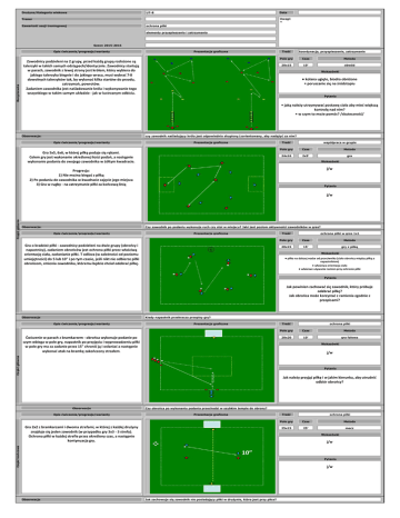 Drużyna/Kategoria wiekowa U7-8 Data Uwagi: « Trener Zawartość sesji treningowej ochrona piłki elementy przyspieszenia i zatrzymania Sezon 2015-2016 Rozgrzewka Opis ćwiczenia/progresja/warianty Prezentacja graficzna Zawodnicy podzieleni na 2 grupy, przed każdą grupą rozłożone są talerzyki w takich samych odstępach/identycznie. Zawodnicy startują w parach, zawodnik z lewej strony jest królem, który wybiera do jakiego talerzyka biegnie i do jakiego wraca, musi wybrać 7-8 dowolnych talerzyków tak, by wykonać kilka startów do przodu, zatrzymań, powrotów. Zadaniem zawodnika jest naśladowanie króla i wykonywanie tego wszystkiego w takim samym układzie - jak w lustrzanym odbiciu. Treść koordynacja, przyspieszenie, zatrzymanie Pole gry Czas 20x15 10' Metoda obwód Wskazówki ● kolana ugięte, biodra obniżone • poruszanie się na śródstopiu Pytania • jaką należy utrzymywać postawę ciała aby mieć większą kontrolę nad nim? • w czym to może pomóc? /skuteczność/ Obserwacje: czy zawodnik naśladujący króla jest odpowiednio skupiony/zorientowany, aby nadążyć za nim? Opis ćwiczenia/progresja/warianty Prezentacja graficzna Gra 5x5, 6x6, w której piłkę podaje się rękami. Celem gry jest wykonanie określonej ilości podań, a następnie wykonanie podania do swojego zawodnika w żółtym kwadracie. Treść współpraca w grupie Pole gry Czas 24x16 2x5' Metoda gra Wskazówki j/w Progresja: 1) Nie można biegać z piłką 2) Po podaniu do zawodnika w kwadracie zajęcie jego miejsca 3) Gra w rugby - na zatrzymanie piłki za końcową linią Pytania Część główna j/w Obserwacje: Czy zawodnik po podaniu wykonuje ruch czy stoi w miejscu? Jaki jest poziom aktywności zawodników w grze? Opis ćwiczenia/progresja/warianty Prezentacja graficzna Gra o kradzież piłki - zawodnicy podzieleni na dwie grupy (obrońcy i napastnicy), zadaniem obrońców jest ochrona piłki przez właściwą orientację ciała, zasłanianie piłki. T odlicza (w zależności od poziomu umiejętności) do 5 lub 10" i po tym czasie, jeśli nikt nie odbierze piłki obrońcom, zmienia zawodnika, któremu będzie chciał odebrać piłkę. Treść ochrona piłki w grze 1x1 Pole gry Czas Metoda 20x15 15' gry z piłką Wskazówki ● piłka na dalszej nodze od przeciwnika (ciało obrońcy między piłką a napastnikiem) ● właściwa orientacja ciała ● właściwe używanie ramion przy ochronie piłki Pytania Jak powinien zachować się zawodnik, który próbuje odebrać piłkę? Jak obrońca może korzystać z ramienia zgodnie z przepisami? Obserwacje Kiedy napastnik przekracza przepisy gry? Opis ćwiczenia/progresja/warianty Prezentacja graficzna Ćwiczenie w parach z bramkarzem - obrońca wykonuje podanie po czym wbiega w pole gry, napastnik po przyjęciu i wyprowadzeniu piłki w pole gry ma za zadanie przez 15" chronić ją i osłaniać a następnie wykonać atak na bramkę zakończony strzałem. Treść ochrona piłki Pole gry Czas Metoda 20x20 10' gra falowa Wskazówki Część główna j/w Pytania Jak należy przyjąć piłkę i w jakim kierunku, aby utrudnić odbiór obrońcy? Obserwacje Opis ćwiczenia/progresja/warianty Czy obrońca po wykonaniu podania przechodzi w szybkim tempie do obrony? Prezentacja graficzna Gra 2x2 z bramkarzami i dwoma strefami, w której z każdej drużyny znajduje się jeden zawodnik (w przypadku gry 3x3 - 3 strefy). Ochrona piłki w każdej strefie przez określony czas, a następnie kontynuacja gry. Treść ochrona piłki Pole gry Czas 25x15 25' Metoda mecz Wskazówki Część końcowa j/w Pytania j/w Obserwacje Jak zachowuje się zawodnik nie posiadający piłki w drużynie, która jest przy piłce?