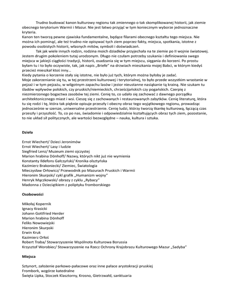 Trudno budować kanon kulturowy regionu tak zmiennego o tak skomplikowanej historii, jak ziemie obecnego terytorium Warmii i Mazur. Nie jest łatwo przyjąć w tym koniecznym wyborze jednoznaczne kryteria. Kanon ten tworzą pewne zjawiska fundamentalne, będące filarami obecnego kształtu tego miejsca. Nie można ich pominąć, ale też trudno nie opisywać tych ziem poprzez fakty, miejsca, spotkania, istotne z powodu osobistych historii, własnych mitów, symboli i doświadczeń. Tak jak wiele innych rodzin, rodzina moich dziadków przyjechała na te ziemie po II wojnie światowej. Jestem drugim pokoleniem tutaj urodzonym. Długo nie czułam potrzeby szukania i definiowania swego miejsca w jakiejś ciągłości tradycji, historii, osadzania się w tym miejscu, sięgania do korzeni. Po prostu byłam tu i to było oczywiste, tak, jak napis „Briefe” na drzwiach mieszkania mojej Babci, w którym kiedyś przecież mieszkał ktoś inny… Kiedy pytania o korzenie stały się istotne, nie było już tych, którym można byłoby je zadać. Moje zakorzenianie się tu, w tej przestrzeni kulturowej i terytorialnej, to było przede wszystkim wrastanie w pejzaż i w tym pejzażu, w wilgotnym zapachu lasów i jezior nieustanne nasiąkanie tą krainą. Nie szukam tu śladów wpływów polskich, czy pruskich/niemieckich, chrześcijańskich czy pogańskich. Czerpię z niezmierzonego bogactwa zasobów tej ziemi. Cenię to, co udało się zachować z dawnego porządku architektonicznego miast i wsi. Cieszę się z zachowanych i restaurowanych zabytków. Cenię literaturę, która tu się rodzi i tę, która tak pięknie opisuje przeszły i obecny obraz tego wyjątkowego regionu, prowadząc jednocześnie w szersze, uniwersalne przestrzenie. Cenię ludzi, którzy tworzą tkankę kulturową, łączącą czas przeszły i przyszłość. To, co po nas, świadomie i odpowiedzialnie kształtujących obraz tych ziem, pozostanie, to nie układ sił politycznych, ale wartości bezwzględne – nauka, kultura i sztuka. Dzieła Ernst Wiechert/ Dzieci Jeronimów Ernst Wiechert/ Lasy i ludzie Siegfried Lenz/ Muzeum ziemi ojczystej Marion hrabina Dönhoff/ Nazwy, których nikt już nie wymienia Konstanty Ildefons Gałczyński/ Kronika olsztyńska Kazimierz Brakoniecki/ Ziemiec, Światologia Mieczysław Orłowicz/ Przewodnik po Mazurach Pruskich i Warmii Hieronim Skurpski/ cykl grafik „Humanizm wojny” Henryk Mączkowski/ obrazy z cyklu „Rybacy” Madonna z Dzieciątkiem z poliptyku fromborskiego Osobowości Mikołaj Kopernik Ignacy Krasicki Johann Gottfried Herder Marion hrabina Dönhoff Feliks Nowowiejski Hieronim Skurpski Erwin Kruk Kazimierz Orłoś Robert Traba/ Stowarzyszenie Wspólnota Kulturowa Borussia Krzysztof Worobiec/ Stowarzyszenie na Rzecz Ochrony Krajobrazu Kulturowego Mazur „Sadyba” Miejsca Sztynort, założenie parkowo-pałacowe oraz inne pałace arystokracji pruskiej Frombork, wzgórze katedralne Święta Lipka, Stoczek Klasztorny, Krosno, Gietrzwałd, sanktuaria Kadyny, rezydencja cesarska i wieś Ukta, Wojnowo, Gałkowo, wsie starowierców Kętrzyn, kompleks stajni w Stadzie Ogierów dzielnica Zatorze w Olsztynie Wielkie Jeziora Mazurskie, jezioro Śniardwy stare aleje przydrożne, te, które jeszcze się zachowały... lasy, Puszcza Piska, Puszcza Napiwodzko-Ramucka, Puszcza Borecka, Puszcza Romincka i... niebo gwiaździste nad nami... nigdzie nie ma takich wrześniowych chmur... Wydarzenia chrystianizacja ziem Prusów i utworzenie państwa Zakonu Krzyżackiego utworzenie biskupstwa warmińskiego Bitwa pod Grunwaldem przejście wojsk napoleońskich przez tereny dzisiejszej Warmii i Mazur rozwój linii kolejowych I wojna światowa, Bitwa pod Tannenbergiem II wojna światowa, zakończenie wojny i przejście Armii Czerwonej przez ziemie dawnych Prus Wschodnich wysiedlenia ludności niemieckiej, mazurskiej po II wojnie światowej przesiedlenia ludności z południa w ramach akcji „Wisła” na tereny Warmii i Mazur przesiedlenia ludności ze wschodnich granic przedwojennej Polski