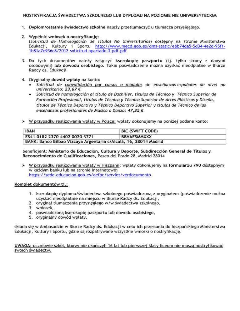 NOSTRYFIKACJA ŚWIADECTWA SZKOLNEGO LUB DYPLOMU NA POZIOMIE NIE UNIWERSYTECKIM 1. Dyplom/ostatnie świadectwo szkolne należy przetłumaczyć u tłumacza przysięgłego. 2. Wypełnić wniosek o nostryfikację: (Solicitud de Homologación de Títulos No Universitarios) dostępny na stronie Ministerstwa Edukacji, Kultury i Sportu http://www.mecd.gob.es/dms-static/ebb74da5-5d34-4e2d-95f11b81a7e936c8/2012-solicitud-apartado-3-pdf.pdf 3. Do tych dokumentów należy załączyć kserokopię paszportu (tj. tylko strony z danymi osobowymi) lub dowodu osobistego. Takie poświadczenie można uzyskać nieodpłatne w Biurze Radcy ds. Edukacji. 4. Oryginalny dowód wpłaty na konto: Solicitud de convalidación por cursos o módulos de enseñanzas españoles de nivel no universitario: 23,67 € Solicitud de homologación al título de Bachiller, títulos de Técnico y Técnico Superior de Formación Profesional, títulos de Técnico y Técnico Superior de Artes Plásticas y Diseño, títulos de Técnico Deportivo y Técnico Deportivo Superior y títulos de Técnico de las enseñanzas profesionales de Música o Danza: 47,35 € W przypadku realizowania wpłaty w Polsce: wpłaty dokonujemy na poniżej podane konto: IBAN BIC (SWIFT CODE) ES41 0182 2370 4402 0020 3771 BBVAESMMXXX BANK: Banco Bilbao Vizcaya Argentaria c/Alcalá, 16, 28014 Madrid beneficjent: Ministerio de Educación, Cultura y Deporte, Subdirección General de Títulos y Reconocimiento de Cualificaciones, Paseo del Prado 28, Madrid 28014 W przypadku realizowania wpłaty w Hiszpanii: wpłaty dokonujemy na formularzu 790 dostępnym w każdym banku lub na stronie internetowej https://sede.educacion.gob.es/aefpc/servlet/verdocumento Komplet dokumentów tj.: 1. kserokopię dyplomu/świadectwa szkolnego poświadczoną z oryginałem (poświadczenie można uzyskać nieodpłatnie na miejscu w Biurze Radcy ds. Edukacji, 2. oryginał tłumaczenia przysięgłego w/w świadectwa szkolnego, 3. wniosek, 4. poświadczoną kserokopię paszportu lub dowodu osobistego, 5. oryginalny dowód wpłaty, składa się w Ambasadzie w Biurze Radcy ds. Edukacji w celu ich przesłania do hiszpańskiego Ministerstwa Edukacji, Kultury i Sportu, gdzie są rozpatrywane wszystkie wnioski o nostryfikację. UWAGA: uczniowie szkół, którzy nie ukończyli 16 lat lub pierwszej klasy liceum nie muszą nostryfikować swoich świadectw.