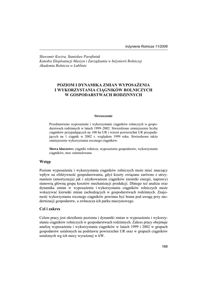 ¦InŜynieria Rolnicza 11/2006 Sławomir Kocira, Stanisław Parafiniuk Katedra Eksploatacji Maszyn i Zarządzania w InŜynierii Rolniczej Akademia Rolnicza w Lublinie POZIOM I DYNAMIKA ZMIAN WYPOSAśENIA I WYKORZYSTANIA CIĄGNIKÓW ROLNICZYCH W GOSPODARSTWACH RODZINNYCH Streszczenie Przedstawiono wyposaŜenie i wykorzystanie ciągników rolniczych w gospodarstwach rodzinnych w latach 1999–2002. Stwierdzono zmniejszenie liczby ciągników przypadających na 100 ha UR i wzrost powierzchni UR przypadających na 1 ciągnik w 2002 r. względem 1999 roku. Stwierdzono takŜe zmniejszenie wykorzystania rocznego ciągników. Słowa kluczowe: ciągniki rolnicze, wyposaŜenie gospodarstw, wykorzystanie ciągników, moc zainstalowana Wstęp Poziom wyposaŜenia i wykorzystania ciągników rolniczych moŜe mieć znaczący wpływ na efektywność gospodarowania, gdyŜ koszty związane zarówno z utrzymaniem (amortyzacja) jak i uŜytkowaniem ciągników (nośniki energii, naprawy) stanowią główną grupę kosztów mechanizacji produkcji. Dlatego teŜ analiza oraz dynamika zmian w wyposaŜeniu i wykorzystaniu ciągników rolniczych moŜe wskazywać kierunki zmian zachodzących w gospodarstwach rodzinnych. Znajomość wykorzystania rocznego ciągników powinna być brana pod uwagę przy modernizacji gospodarstw, a zwłaszcza ich parku maszynowego. Cel i zakres Celem pracy jest określenie poziomu i dynamiki zmian w wyposaŜeniu i wykorzystaniu ciągników rolniczych w gospodarstwach rodzinnych. Zakres pracy obejmuje analizę wyposaŜenia i wykorzystania ciągników w latach 1999 i 2002 w grupach gospodarstw ustalonych na podstawie powierzchni UR oraz w grupach ciągników ustalonych wg ich mocy wyraŜonej w kW. $),¦ FÄTjb`\e¦>bV\eTþ¦FgTa\fÄTj¦CTeTY\a\h^¦¦ ¦ Metodyka badań i analizy Analizie poddano 43 gospodarstwa rodzinne w których przeprowadzono badania w 1999 i 2002 roku w ramach projektów badawczych KBN Nr 5P06F 01216 i KBN Nr 3 P06R 03722. Gospodarstwa podzielono na podstawie powierzchni uŜytków rolnych wg typologii Unii Europejskiej. Gospodarstwa małe do 10 ha UR, gospodarstwa średnio małe od 10 do 20 ha UR, gospodarstwa średnio duŜe od 20 do 30 ha UR, gospodarstwa duŜe od 30 do 50 ha UR i gospodarstwa bardzo duŜe powyŜej 50 ha UR [Polski FADN 2004]. Ciągniki rolnicze pogrupowano wg mocy tworząc 4 grupy. Roczne wykorzystanie ciągników rolniczych określono osobno w produkcji gospodarstwa oraz poza produkcją. Dodatkowo określono strukturę upraw obliczając ich procentowy udział w powierzchni uŜytków rolnych, obsadę zwierząt w duŜych jednostkach przeliczeniowych (DJP) oraz produkcję towarową netto w jednostkach zboŜowych (JZ). Obliczono takŜe średnią liczbę osób zatrudnionych w gospodarstwie oraz nakłady pracy ludzi przypadające na 1 JZ produkcji towarowej netto (rbh/JZ). Charakterystyka badanych gospodarstw Łączna powierzchnia analizowanych gospodarstw w 1999 roku wyniosła 1743,07 ha UR, a w 2002 roku 1994,35 ha UR. W strukturze zasiewów w obu analizowanych okresach największy udział miały zboŜa i rzepak (odpowiednio 72,3% i 73,1%). Udział roślin okopowych w 2002 r. zmniejszył się i wynosił 78% powierzchni tych roślin w 1999 r. W 2002 r. powierzchnia kukurydzy uprawianej na kiszonkę wzrosła względem 1999 r. o 83,9%, natomiast powierzchnia trwałych uŜytków zielonych zmniejszyła się. Obsada zwierząt w 2002 roku określona na za pomocą DJP wzrosła o 7,3% względem roku 1999. Średnie zatrudnienie osób (osób/gosp.) oraz nakłady pracy (rbh/JZ) zmalały w 2002 w porównaniu z 1999 rokiem (tab. 1). Wyniki analizy i dyskusja WyposaŜenie gospodarstw w ciągniki rolnicze w analizowanych latach uległo zmianie. Najwięcej ciągników w przeliczeniu na 100 ha UR było w gospodarstwach małych w 1999 roku. Najmniej natomiast w gospodarstwach bardzo duŜych w roku 2002. Największa zmiana względem 1999 roku wynosząca 249,6% wystąpiła w wyposaŜeniu gospodarstw w ciągniki o mocy powyŜej 100 kW. W analizowanych latach wystąpiło zróŜnicowanie średniej mocy ciągników w przeliczeniu na ciągnik (kW/ciągnik) pomiędzy grupami gospodarstw (tab. 2). $*#¦ ¦Cbm\b`¦\¦WlaT`\^T¦m`\Ta!!!¦ Tabela 1. Ogólna charakterystyka badanych gospodarstw Table 1. General characteristics of the analyzed farmsteads Wyszczególnienie rok 1999 rok 2002 zmiana gdy 1999=100% Powierzchnia UR [ha] ZboŜa i rzepak [ha] % Rośliny okopowe [ha] % Kukurydza i inne na kiszonkę [ha] % Warzywa, sady i jagodniki [ha] % Trwałe ukrytki zielone [ha] % Inne uprawy [ha] % Obsada zwierząt DJP/100 ha UR Produkcja towarowa netto [JZ/gosp.] Liczba osób zatrudnionych w gospodarstwie [osób/gosp.] Nakłady pracy [rbh/JZ produkcji towarowej netto] 1743,07 1253,10 72,3 120,60 7,0 33,41 1,9 17,81 1,0 264,32 15,2 44,70 2,6 82,67 1994,35 1456,98 73,1 94,05 4,7 61,45 3,1 34,89 1,7 248,61 12,5 98,37 4,9 88,70 114,4 2076,5 2544,7 122,5 2,70 2,53 94,0 2,05 1,54 74,9 116,3 78,0 183,9 195,9 94,1 220,1 107,3 Średnie wykorzystanie roczne ciągników rolniczych w produkcji gospodarstwa w analizowanych grupach ciągników w 1999 roku wzrastało wraz ze wzrostem ich mocy od 340 h/ciągnik w grupie < 30 kW do 840 h/ciągnik w grupie > 100 kW. W 2002 roku najmniej przepracowały ciągniki o mocy od 50 do 100 kW (339 h/ciągnik) (tab. 3). W gospodarstwach pogrupowanych wg powierzchni UR zarówno w 1999 r. jak i 2002 r. wraz ze wzrostem powierzchni gospodarstw rosło wykorzystanie ciągników. W 2002 roku prawie we wszystkich grupach gospodarstw średnie wykorzystanie roczne ciągników zmalało względem 1999 roku. Wyjątkiem jest grupa gospodarstw małych gdzie odnotowano wzrost wykorzystania o 19,2%. $*$¦ FÄTjb`\e¦>bV\eTþ¦FgTa\fÄTj¦CTeTY\a\h^¦¦ ¦ Tabela 2. WyposaŜenie gospodarstw w ciągniki rolnicze Table 2. Outfitting farmsteads with farm tractors Wyszczególnienie WyposaŜenie w ciągniki rolnicze w latach 1999 i 2002 zmiana gdy 1999 2002 1999 = 100% [sztuk/100 ha UR