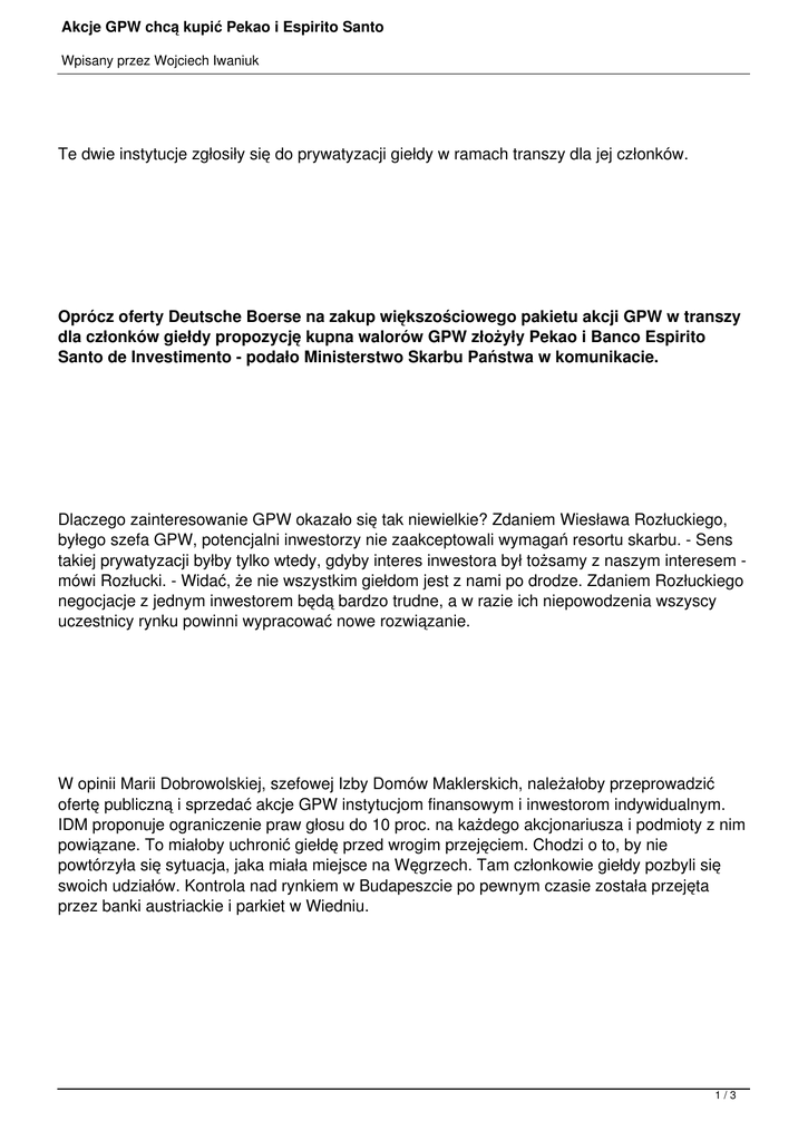 Akcje GPW chcą kupić Pekao i Espirito Santo Wpisany przez Wojciech Iwaniuk Te dwie instytucje zgłosiły się do prywatyzacji giełdy w ramach transzy dla jej członków. Oprócz oferty Deutsche Boerse na zakup większościowego pakietu akcji GPW w transzy dla członków giełdy propozycję kupna walorów GPW złożyły Pekao i Banco Espirito Santo de Investimento - podało Ministerstwo Skarbu Państwa w komunikacie. Dlaczego zainteresowanie GPW okazało się tak niewielkie? Zdaniem Wiesława Rozłuckiego, byłego szefa GPW, potencjalni inwestorzy nie zaakceptowali wymagań resortu skarbu. - Sens takiej prywatyzacji byłby tylko wtedy, gdyby interes inwestora był tożsamy z naszym interesem mówi Rozłucki. - Widać, że nie wszystkim giełdom jest z nami po drodze. Zdaniem Rozłuckiego negocjacje z jednym inwestorem będą bardzo trudne, a w razie ich niepowodzenia wszyscy uczestnicy rynku powinni wypracować nowe rozwiązanie. W opinii Marii Dobrowolskiej, szefowej Izby Domów Maklerskich, należałoby przeprowadzić ofertę publiczną i sprzedać akcje GPW instytucjom finansowym i inwestorom indywidualnym. IDM proponuje ograniczenie praw głosu do 10 proc. na każdego akcjonariusza i podmioty z nim powiązane. To miałoby uchronić giełdę przed wrogim przejęciem. Chodzi o to, by nie powtórzyła się sytuacja, jaka miała miejsce na Węgrzech. Tam członkowie giełdy pozbyli się swoich udziałów. Kontrola nad rynkiem w Budapeszcie po pewnym czasie została przejęta przez banki austriackie i parkiet w Wiedniu. 1/3 Akcje GPW chcą kupić Pekao i Espirito Santo Wpisany przez Wojciech Iwaniuk Plan prywatyzacji GPW zakładał dotąd sprzedaż minimum 51 proc. akcji inwestorowi strategicznemu oraz około 23 proc. akcji członkom giełdy. 25 proc. plus jedna akcja miały zostać w rękach rządu i być sprzedane w ciągu dwóch, trzech lat od zakończenia pierwszego etapu prywatyzacji. Pytania do... Joanny Schmid, wiceminister skarbu państwa Dlaczego zainteresowanie prywatyzacją GPW było tak małe? Ze względu na wagę i znaczenie prywatyzacji warszawskiej giełdy dla całej polskiej gospodarki postawiliśmy określone wymagania inwestorom - naszym zdaniem zupełnie naturalne. Jasno sprecyzowaliśmy oczekiwania wobec potencjalnych inwestorów strategicznych - muszą oni przedstawić strategię rozwoju GPW jako centrum regionalnego i zagwarantować realizację tej strategii w przyszłości. Uwzględniliśmy znaczenie i wagę tej prywatyzacji, wymagania dotyczyły kwestii kluczowych dla przyszłości giełdy i polskiego rynku kapitałowego. Oczekiwaliśmy od inwestorów programu rozwoju giełdy, który byłby ukierunkowany na wzrost szeroko rozumianej wartości tej instytucji zarówno poprzez umocnienie jej pozycji na rynku, jak i w regionie. Czy ministerstwo skarbu zawiesi proces prywatyzacji lub zacznie go od nowa? Proces jest kontynuowany. Jesteśmy w trakcie analizy formalnej i merytorycznej, która zakończy się jeszcze w listopadzie. 2/3 Akcje GPW chcą kupić Pekao i Espirito Santo Wpisany przez Wojciech Iwaniuk Ale może warto już teraz rozważyć inny model prywatyzacji, np. sprzedaż giełdy jej członkom? Jeśli chodzi o zainteresowanie polskiego sektora finansowego inwestycją w GPW, to do uczestnictwa w procesie zaprosiliśmy wszystkich członków giełdy. Zdecydowana większość z nich nie chce z tego zaproszenia skorzystać. Chciałabym również przypomnieć, że przy poprzedniej formule prywatyzacji zainteresowanie inwestorów finansowych również było ograniczone. 3/3