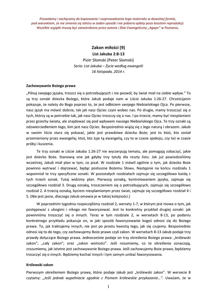 Pozwalamy i zachęcamy do kopiowania i rozprowadzania tego materiału w dowolnej formie, pod warunkiem, że nie zmienia się tekstu w żaden sposób i nie pobiera opłaty poza kosztem reprodukcji. Wszelkie wyjątki muszą być zatwierdzone przez autora i Zbór Ewangeliczny „Agape” w Poznaniu. Zakon miłości (9) List Jakuba 2:8-13 Piotr Słomski (Peter Slomski) Seria: List Jakuba – Życie według ewangelii 16 listopada, 2014 r. Zachowywanie Bożego prawa „Pilnuj swojego języka, troszcz się o potrzebujących i nie pozwól, by świat miał na ciebie wpływ.” To są trzy oznaki dziecka Bożego, które Jakub podaje nam w Liście Jakuba 1:26-27. Chrześcijanin pokazuje, że należy do Boga poprzez to, że jest odbiciem swojego Niebiańskiego Ojca. Po pierwsze, nasz język ma mówić dobrze, tak jak nasz Ojciec czyni wobec nas. Po drugie, mamy troszczyć się o tych, którzy są w potrzebie tak, jak nasz Ojciec troszczy się o nas. I po trzecie, mamy być niesplamieni przez grzechy świata, ale znajdować się pod wpływem naszego Niebiańskiego Ojca. Te trzy oznaki są odzwierciedleniem tego, kim jest nasz Ojciec. Bezpośrednio wiążą się z Jego naturą i obrazem. Jakub w swoim liście stara się pokazać, jakie jest prawdziwe dziecko Boże; jest to ktoś, kto został przemieniony przez ewangelię; ktoś, kto żyje tą ewangelią, czy to w czasie spokoju, czy też w czasie próby i kuszenia. Te trzy oznaki w Liście Jakuba 1:26-27 nie wyczerpują tematu, ale pomagają zobaczyć, jakie jest dziecko Boże. Stanowią one jak gdyby trzy tytuły dla reszty listu. Jak już powiedzieliśmy wcześniej, Jakub miał plan w tym, co pisał. W rozdziale 1 mówił ogólnie o tym, jak dziecko Boże powinno wytrwać i dojrzewać, będąc posłuszne Bożemu Słowu. Następnie na końcu rozdziału 1 wspomniał te trzy specyficzne oznaki. W pozostałych rozdziałach zajmuje się szczegółowo każdą z tych trzech oznak. Tutaj widzimy plan. Pierwszą oznaką, kontrolowaniem języka, zajmuje się szczegółowo rozdział 3. Drugą oznaką, troszczeniem się o potrzebujących, zajmuje się szczegółowo rozdział 2. A trzecią oznaką, byciem niesplamionym przez świat, zajmuje się szczegółowo rozdział 4 i 5. (Nie jest jasne, dlaczego Jakub omawia je w takiej kolejności.) W poprzednim tygodniu rozpoczęliśmy rozdział 2, wersety 1-7, w którym jest mowa o tym, jak postępować z ubogimi i nikogo nie faworyzować. Jest to konkretny przykład drugiej oznaki: jak powinniśmy troszczyć się o innych. Teraz w tym rozdziale 2, w wersetach 8-13, po podaniu konkretnego przykładu pokazuje on, w jaki sposób faworyzowanie kogoś odnosi się do Bożego prawa. To, jak traktujemy innych, nie jest po prostu kwestią tego, jak się czujemy. Bezpośrednio odnosi się to do tego, czy zachowujemy Boże prawo czyli zakon. W wersetach 8-13 Jakub podaje trzy prawdy dotyczące Bożego prawa. Jednocześnie podaje on trzy określenia Bożego prawa: „królewski zakon”; „cały zakon”; oraz „zakon wolności”. Jeśli rozumiemy, co te określenia oznaczają, zrozumiemy, jak istotne jest zachowywanie Bożego prawa. Jeśli zachowujemy Boże prawo, będziemy troszczyć się o innych. Będziemy kochać innych i tym samym unikać faworyzowania. Królewski zakon Pierwszym określeniem Bożego prawa, które podaje Jakub jest „królewski zakon”. W wersecie 8 czytamy: „Jeśli jednak wypełniacie zgodnie z Pismem królewskie przykazanie…”. Uważam, że w 1 miejscu, w którym Biblia Warszawska podaje „królewskie przykazanie”, lepszym tłumaczeniem byłoby „królewski zakon”. To samo słowo tłumaczone jest jako „zakon” w wersetach 9, 10, 11 i 12, i wszystkie pozostałe polskie tłumaczenia tłumaczą to greckie słowo jako „zakon” lub „prawo”. (W grece w każdym wypadku używane jest to samo słowa nomos.) Niezależnie jednak, czy jest to „królewski zakon”, czy „królewskie przykazanie” pytanie brzmi, co Jakub przez to rozumie? Przeczytajmy werset 8 w całości: „Jeśli jednak wypełniacie zgodnie z Pismem królewskie przykazanie: Będziesz miłował bliźniego swego jak siebie samego, dobrze czynicie.” Królewski zakon to kochanie swojego bliźniego jak siebie samego. To właśnie oznacza troszczenie się o będących w potrzebie. Naszym bliźnim jest każdy w potrzebie. Jeśli zachowujemy to przykazanie, to tym samym nie będziemy faworyzować. Jak bardzo ważne są ostatnie słowa tego przykazania. „Będziesz miłował bliźniego swego jak siebie samego.” Czy jest tu mowa o tym, że mamy kochać samego siebie? Nie! Nie chodzi o to, że mamy kochać samego siebie, ale raczej, że naszą naturalną skłonnością jest troska o samego siebie. Miłość do samego siebie jest faktem. Niekoniecznie dotyczy emocji, ale dotyczy zajmowania się, dbania i zainteresowania własną osobą. Na przykład, co się dzieje, gdy z samego rana widzimy swoją twarz w lustrze? Z naszych ust wydobywa się „bleh”. Jednak gdy zabierzemy tę odpychającą twarz do łazienki, umyjemy ją i zadbamy o nią, będzie ona dzięki temu wyglądała na tyle dobrze, na ile pozwala na to natura. I tak jest przez cały dzień: miłość do samego siebie oznacza okazywanie troskliwej dbałości i uwagi. To jest model, na którym mamy oprzeć nasze relacje z innymi. Zgodnie z Pismem miłość do innych dotyczy troszczenia się o innych. Ale dlaczego Jakub nazywa ten zakon „królewskim”? I jak praktycznie wygląda okazywanie tej troski i zainteresowania? Niektórzy uważają, że jest on „królewskim” zakonem, ponieważ Jezus jest naszym królem, który zainaugurował nowe królestwo. Mówią oni, że Jakub cytuje Jezusa i jest to nowy zakon w nowym przymierzu. Jednakże faktem jest, że ten królewski zakon istniał już w Starym Testamencie. Nie jest to nowy zakon. Jakub nie tylko cytuje Jezusa, ale również Mojżesza ze Starego Testamentu. Pozwól, że przeczytam werset, który cytuje Jakub. 