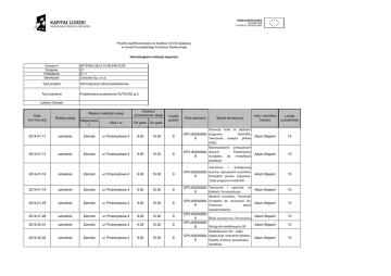 Projekt współfinansowany ze środków Unii Europejskiej w ramach Europejskiego Funduszu Społecznego Harmonogram realizacji wsparcia Umowa nr Działanie Podziałanie Beneficjent 661/POKL.08.01.01-06-549/12-00 8.1 8.1.1 Consultor Sp. z o.o. Tytuł projektu Informatyzacja mikroprzedsiębiorstw Tytuł szkolenia Projektowanie przestrzenne AUTOCAD gr.2 Lokalny Ośrodek Data (rrrr-mm-dd) Miejsce realizacji usługi Rodzaj usługi Miejscowoś ć Ulica i nr Godziny prowadzenia usługi Od godz. Do godz. Liczba godzin 2014-01-11 szkolenie Zamość ul. Przemysłowa 4 9.00 15.30 8 2014-01-12 szkolenie Zamość ul. Przemysłowa 4 9.00 15.30 8 2014-01-18 szkolenie Zamość ul. Przemysłowa 4 9.00 15.30 8 2014-01-19 szkolenie Zamość ul. Przemysłowa 4 9.00 15.30 8 2014-01-25 szkolenie Zamość ul. Przemysłowa 4 9.00 15.30 8 2014-01-26 szkolenie Zamość ul. Przemysłowa 4 9.00 15.30 8 2014-02-01 szkolenie Zamość ul. Przemysłowa 4 9.00 15.30 8 2014-02-02 szkolenie Zamość ul. Przemysłowa 4 9.00 15.30 8 Kod szkolenia Moduł tematyczny Pierwsze kroki w obsłudze AutoCAD, CPV-80530000- programu 8 Tworzenie nowych plików DWG, Wprowadzanie precyzyjnych Podstawowe CPV-80530000- danych, 8 narzędzia do modyfikacji obiektów Tworzenie i konfiguracja CPV-80530000- warstw, opisywanie rysunków, 8 Narzędzia panelu Zapytania, Tryby programu AutoCAD CPV-80530000- Tworzenie i operacje na 8 blokach, Personalizacja Wydruk rysunków, Pozostałe CPV-80530000- narzędzia do rysowania 2D, 8 Polecenia edycji zaawansowanej CPV-80530000Bloki dynamiczne, Personalizac 8 CPV-80530000Wstęp do modelowania 3D 8 Modelowanie 3D – siatki, CPV-80530000- edycja brył, tworzenie bloków, 8 Światła, kamery, wizualizacja obiektów Imię i nazwisko trenera Liczba uczestników Adam Stępień 15 Adam Stępień 15 Adam Stępień 15 Adam Stępień 15 Adam Stępień 15 Adam Stępień 15 Adam Stępień 15 Adam Stępień 15