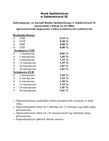 Bank Spółdzielczy w Ząbkowicach Śl. Informujemy, że Zarząd Banku Spółdzielczego w Ząbkowicach Śl. wprowadził z dniem 24.10.2006r. oprocentowanie depozytów i lokat terminowych walutowych: Rachunki bieżące USD EUR GBP CHF Terminowe USD 1 miesięczne 3 miesięczne 6 miesięczne 12 miesięczne 24 miesięczne 36 miesięczne Terminowe EUR 1 miesięczne 3 miesięczne 6 miesięczne 12 miesięczne 24 miesięczne 36 miesięczne 0,15 % 0,30 % 0,00 % 0,00 % 0,85 % 1,05 % 1,25 % 1,55 % 1,65 % 1,65 % 1,20 % 1,25 % 1,30 % 1,35 % 1,45 % 1,45 % Oprocentowanie rachunków lokat terminowych wyrażone w skali roku, Oprocentowanie lokat od 1 miesiąca do 12 miesięcy wg stałej stopy procentowej, Oprocentowanie lokat 24 i 36 miesięcznych wg zmiennej stopy procentowej, Kapitalizacja po upływie okresu umowy.