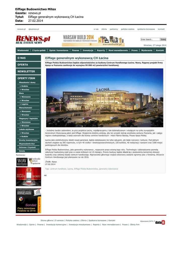 Eiffage Budownictwo Mitex Gazeta: renews.pl Tytu³: Eiffage generalnym wykonawc¹ CH £acina Data: 27.02.2014 renews.pl qbusiness.pl o nas oferta partnerzy polityka cookies spotkania biznesowe Enter Search... kontakt Szukaj Wrocław, 27 lutego 2014 Wiadomości Z życia spółek Opinie i komentarze Finanse Inwestycje Raporty Nowi menedżerowie Prawo Wydarzenia Kontakt O NAS Eiffage generalnym wykonawcą CH Łacina OFERTA Eiffage Polska Budownictwo będzie odpowiedzialne za budowę Centrum Handlowego Łacina. Nowy, flagowy projekt firmy Apsys w Poznaniu zaoferuje do wynajmu 99 000 m2 powierzchni handlowej. NEWSLETTER OFERTY FIRM Mieszkania i domy > Kraków > Wrocław Biura > Warszawa > Wrocław > Legnica Nieruchomości > Warszawa > Wrocław Magazyny i logistyka > Warszawa > Wrocław Lokale użytkowe > Wrocław > Kraków Grunty inwestycyjne Wyposażenie biur - Jesteśmy bardzo zadowoleni, że przy projekcie Łaciny, współpracujemy z tak doświadczonym i wiodącym na rynku europejskim Generalnym Wykonawcą jakim jest Eiffage. Wzajemnie dzielimy ambicję, aby ten projekt stał się wizytówka zarówno Poznania, jak i całego regionu wielkopolskiego, a także wzorcem dla branży centrów handlowych - mówi Fabrice Bansay, Prezes Apsys Polska. Łacina jako wielofunkcyjny obiekt nowej generacji, będzie dedykowane nie tylko zakupom, ale także rozrywce i kulturze. Pod jednym dachem znajdzie się 300 najemców, w tym 40 wielko- i średniopowierzchniowych, 220 butików, 40 restauracji i kawiarni oraz 3300 miejsc parkingowych dla klientów. Ochrona i Czystość Hotele Partnerzy: Eiffage Polska Budownictwo, jako generalny wykonawca , rozpocznie prace wiosną tego roku. Technologia i doświadczenie pozwolą zakończyć budowlaną część prac w czasie krótszym niż 15 miesięcy. Proces budowy będzie składał się z postawienia kamiennej elewacji budynku oraz szklanej fasady centrum handlowego. Naprzeciwko głównego wejścia stworzony zostanie ogromny plac z fontanną. Otwarcie Centrum Handlowego jest planowane na rok 2016. Źródło: Apsys 27.02.2014 Tagi: centrum handlowe, Łacina, Eiffage Polska Budownictwo, generalny wykonawca Strona główna | O serwisie | Polityka cookies | Oferta | Spotkania biznesowe | Kontakt Wiadomości | Opinie | Finanse | Inwestycje komercyjne | Inwestycje mieszkaniowe | Raporty | Nowi menedżerowie | Prawo | Oferty firm Wykonanie DATA IT
