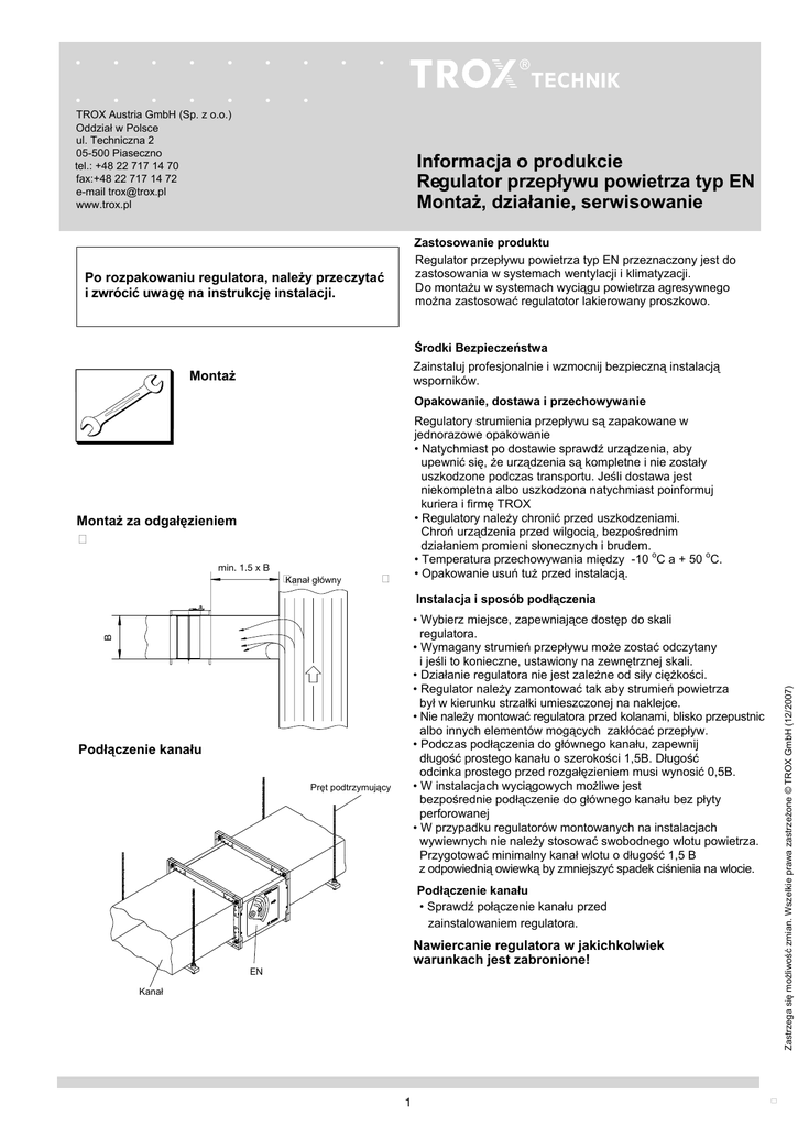 TROX Austria GmbH (Sp. z o.o.) Oddział w Polsce ul. Techniczna 2 05-500 Piaseczno tel.: +48 22 717 14 70 fax:+48 22 717 14 72 e-mail [email protected] www.trox.pl Informacja o produkcie Regulator przepływu powietrza typ EN Montaż, działanie, serwisowanie Zastosowanie produktu Regulator przepływu powietrza typ EN przeznaczony jest do zastosowania w systemach wentylacji i klimatyzacji. Do montażu w systemach wyciągu powietrza agresywnego można zastosować regulatotor lakierowany proszkowo. Po rozpakowaniu regulatora, należy przeczytać i zwrócić uwagę na instrukcję instalacji. Środki Bezpieczeństwa Zainstaluj profesjonalnie i wzmocnij bezpieczną instalacją wsporników. Montaż Opakowanie, dostawa i przechowywanie Regulatory strumienia przepływu są zapakowane w jednorazowe opakowanie • Natychmiast po dostawie sprawdź urządzenia, aby upewnić się, że urządzenia są kompletne i nie zostały uszkodzone podczas transportu. Jeśli dostawa jest niekompletna albo uszkodzona natychmiast poinformuj kuriera i firmę TROX • Regulatory należy chronić przed uszkodzeniami. Chroń urządzenia przed wilgocią, bezpośrednim działaniem promieni słonecznych i brudem. • Temperatura przechowywania między -10 oC a + 50 oC. • Opakowanie usuń tuż przed instalacją. Montaż za odgałęzieniem min. 1.5 x B .DQDáJáyZQ\ B • Wybierz miejsce, zapewniające dostęp do skali regulatora. • Wymagany strumień przepływu może zostać odczytany i jeśli to konieczne, ustawiony na zewnętrznej skali. • Działanie regulatora nie jest zależne od siły ciężkości. • Regulator należy zamontować tak aby strumień powietrza był w kierunku strzałki umieszczonej na naklejce. • Nie należy montować regulatora przed kolanami, blisko przepustnic albo innych elementów mogących zakłócać przepływ. • Podczas podłączenia do głównego kanału, zapewnij długość prostego kanału o szerokości 1,5B. Długość odcinka prostego przed rozgałęzieniem musi wynosić 0,5B. • W instalacjach wyciągowych możliwe jest bezpośrednie podłączenie do głównego kanału bez płyty perforowanej • W przypadku regulatorów montowanych na instalacjach wywiewnych nie należy stosować swobodnego wlotu powietrza. Przygotować minimalny kanał wlotu o długość 1,5 B z odpowiednią owiewką by zmniejszyć spadek ciśnienia na wlocie. Podłączenie kanału Opakowanie, dostawa i przechowywanie 3UĊWSRGWU]\PXMąF\ Podłączenie kanału • Sprawdź połączenie kanału przed zainstalowaniem regulatora. Nawiercanie regulatora w jakichkolwiek warunkach jest zabronione! EN .DQDá 1 =DVWU]HJDVLĊPRĪOLZRĞü]PLDQ:V]HONLHSUDZD]DVWU]HĪRQH752;*PE+ Instalacja i sposób podłączenia TROX Austria GmbH (Sp. z o.o.) Oddział w Polsce ul. Techniczna 2 05-500 Piaseczno tel.: +48 22 717 14 70 fax:+48 22 717 14 72 e-mail [email protected] www.trox.pl Informacja o produkcie Regulator przepływu powietrza typ EN Montaż, działanie, serwisowanie Oddanie do użytkowania Ustawienie wartości przepływu Regulatory są dostarczone z ustawionym fabrycznie nominalną wartością przepływu. Klient sam ustawia wymagany strumień przepływu przez użycie zewnętrznej skalibrowanej skali. Dokładność skali wynosi w przybliżeniu ± 4 %. Dla konstrukcji z siłownikiem ustawione są minimalne i maksymalne wymagane wartości przepływu Dalsza modyfikacja jest możliwa przez zmianę ustawienia kąta ogranicznika nastaw . Ustawienie strumienia przepływu 6NDOD :VND]yZND Serwisowanie Regulatory zainstalowane w systemach wentylacji i klimatyzacji, stosowane w normalnych warunkach, nie wymagają konserwacji 2