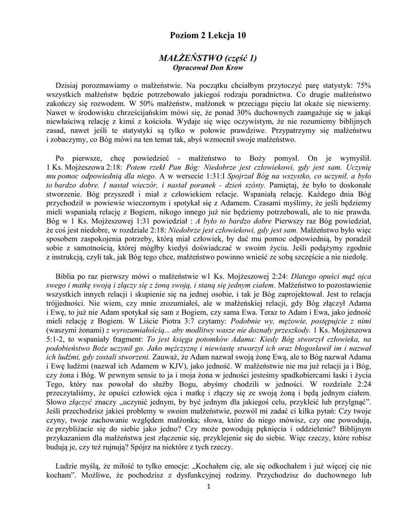 Poziom 2 Lekcja 10 MAŁŻEŃSTWO (część 1) Opracował Don Krow Dzisiaj porozmawiamy o małżeństwie. Na początku chciałbym przytoczyć parę statystyk: 75% wszystkich małżeństw będzie potrzebowało jakiegoś rodzaju poradnictwa. Co drugie małżeństwo zakończy się rozwodem. W 50% małżeństw, małżonek w przeciągu pięciu lat okaże się niewierny. Nawet w środowisku chrześcijańskim mówi się, że ponad 30% duchownych zaangażuje się w jakąś niewłaściwą relację z kimś z kościoła. Wydaje się więc oczywistym, że nie rozumiemy biblijnych zasad, nawet jeśli te statystyki są tylko w połowie prawdziwe. Przypatrzymy się małżeństwu i zobaczymy, co Bóg mówi na ten temat tak, abyś wzmocnił swoje małżeństwo. Po pierwsze, chcę powiedzieć - małżeństwo to Boży pomysł. On je wymyślił. 1 Ks. Mojżeszowa 2:18: Potem rzekł Pan Bóg: Niedobrze jest człowiekowi, gdy jest sam. Uczynię mu pomoc odpowiednią dla niego. A w wersecie 1:31:I Spojrzał Bóg na wszystko, co uczynił, a było to bardzo dobre. I nastał wieczór, i nastał poranek - dzień szósty. Pamiętaj, że było to doskonałe stworzenie. Bóg przyszedł i miał z człowiekiem relacje. Wspaniałą relację. Każdego dnia Bóg przychodził w powiewie wieczornym i spotykał się z Adamem. Czasami myślimy, że jeśli będziemy mieli wspaniałą relację z Bogiem, nikogo innego już nie będziemy potrzebowali, ale to nie prawda. Bóg w 1 Ks. Mojżeszowej 1:31 powiedział : A było to bardzo dobre Pierwszy raz Bóg powiedział, że coś jest niedobre, w rozdziale 2:18: Niedobrze jest człowiekowi, gdy jest sam. Małżeństwo było więc sposobem zaspokojenia potrzeby, którą miał człowiek, by dać mu pomoc odpowiednią, by poradził sobie z samotnością, której mógłby kiedyś doświadczać w swoim życiu. Jeśli podążymy zgodnie z instrukcją, czyli tak, jak Bóg tego chce, małżeństwo powinno wnieść ze sobą szczęście a nie niedolę. Biblia po raz pierwszy mówi o małżeństwie w1 Ks. Mojżeszowej 2:24: Dlatego opuści mąż ojca swego i matkę swoją i złączy się z żoną swoją, i staną się jednym ciałem. Małżeństwo to pozostawienie wszystkich innych relacji i skupienie się na jednej osobie, i tak je Bóg zaprojektował. Jest to relacja trójjedności. Nie wiem, czy mnie zrozumiałeś, ale w małżeńskiej relacji, gdy Bóg złączył Adama i Ewę, to już nie Adam spotykał się sam z Bogiem, czy sama Ewa. Teraz to Adam i Ewa, jako jedność mieli relację z Bogiem. W Liście Piotra 3:7 czytamy: Podobnie wy, mężowie, postępujcie z nimi (waszymi żonami) z wyrozumiałością... aby modlitwy wasze nie doznały przeszkody. 1 Ks. Mojżeszowa 5:1-2, to wspaniały fragment: To jest księga potomków Adama: Kiedy Bóg stworzył człowieka, na podobieństwo Boże uczynił go. Jako mężczyznę i niewiastę stworzył ich oraz błogosławił im i nazwał ich ludźmi, gdy zostali stworzeni. Zauważ, że Adam nazwał swoją żonę Ewą, ale to Bóg nazwał Adama i Ewę ludźmi (nazwał ich Adamem w KJV), jako jedność. W małżeństwie nie ma już relacji ja i Bóg, czy żona i Bóg. W pewnym sensie to ja i moja żona w jedności jesteśmy spadkobiercami łaski i życia Tego, który nas powołał do służby Bogu, abyśmy chodzili w jedności. W rozdziale 2:24 przeczytaliśmy, że opuści człowiek ojca i matkę i złączy się ze swoją żoną i będą jednym ciałem. Słowo złączyć znaczy „uczynić jednym, by być jednym dla jakiegoś celu, przykleić lub przylgnąć”. Jeśli przechodzisz jakieś problemy w swoim małżeństwie, pozwól mi zadać ci kilka pytań: Czy twoje czyny, twoje zachowanie względem małżonka; słowa, które do niego mówisz, czy one powodują, że przybliżacie się do siebie jako jedno? Czy może powodują pęknięcia i oddzielenie? Biblijnym przykazaniem dla małżeństwa jest złączenie się, przyklejenie się do siebie. Więc rzeczy, które robisz budują je, czy też rujnują? Spójrz na niektóre z tych rzeczy. Ludzie myślą, że miłość to tylko emocje: „Kochałem cię, ale się odkochałem i już więcej cię nie kocham”. Możliwe, że pochodzisz z dysfunkcyjnej rodziny. Przychodzisz do duchownego lub 1 do urzędnika, by się pobrać; ślubujesz dać swoje życie tej drugiej osobie; naprawdę chcesz, żeby to zadziałało, aż do grobowej deski. Ale z powodu swojej dysfunkcyjnej rodziny nigdy nie widziałeś miłości, nigdy jej tam nie wyrażano i nigdy twoi rodzice nie okazywali jej sobie nawzajem. Twój małżonek może pochodzić z rodziny, w której okazywano wiele uczucia, ale ty nie wiesz jak to zrobić. Pomimo tego, że chcesz kochać osobę, której się oddajesz, z powodu swojej dysfunkcji nie wiedząc jak wyrazić miłość, prawdopodobnie zawalisz. Istnieją szanse, że w przeciągu kilku lat pójdziesz do doradcy małżeńskiego mówiąc: „Nie pasujemy do siebie. Nie kocham jej już więcej”. Mam dla ciebie dobrą wiadomość - Jeśli masz jakieś problemy w małżeństwie, jest coś, co może je naprawić. Kupując nową lodówkę i mając z nią problemy, na pewno zaglądasz do instrukcji obsługi. Instrukcja powie ci, co jest nie tak, albo zadzwonisz po serwis. Jest taka instrukcja, która naprawia małżeństwa. Nazywa się ona Boże Słowo, a Biblia mówi nam w Liście do Tytusa 2:4, że miłość jest czymś, czego można się nauczyć i można o niej uczyć. Jeśli pochodzisz z dysfunkcyjnej rodziny i nie wiesz jak kochać swojego współmałżonka, a twoje małżeństwo się wali, jest dobra wiadomość. 1 List Jana 5:3: Na tym bowiem polega miłość ku Bogu, że się przestrzega przykazań jego, a przykazania jego nie są uciążliwe. Poprzez przykazania Jezusa Chrystusa, który nam pokazał jak kochać, jak wyrażać uprzejmość i hojność, jak szukać dobra współmałżonka, Bóg może odmienić całą sytuację. To tylko wstęp do tematu małżeństwa. Kolejną lekcję także poświęci
