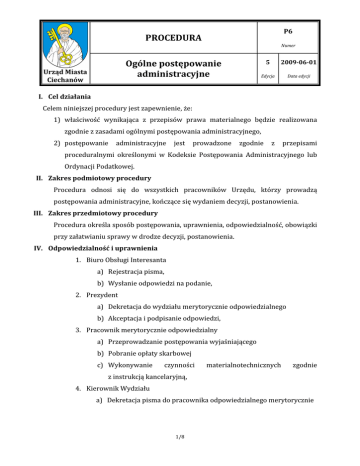P6 PROCEDURA Numer Ogólne postępowanie administracyjne Urząd Miasta Ciechanów 5 2009-06-01 Edycja Data edycji I. Cel działania Celem niniejszej procedury jest zapewnienie, że: 1) właściwość wynikająca z przepisów prawa materialnego będzie realizowana zgodnie z zasadami ogólnymi postępowania administracyjnego, 2) postępowanie administracyjne jest prowadzone zgodnie z przepisami proceduralnymi określonymi w Kodeksie Postępowania Administracyjnego lub Ordynacji Podatkowej. II. Zakres podmiotowy procedury Procedura odnosi się do wszystkich pracowników Urzędu, którzy prowadzą postępowania administracyjne, kończące się wydaniem decyzji, postanowienia. III. Zakres przedmiotowy procedury Procedura określa sposób postępowania, uprawnienia, odpowiedzialność, obowiązki przy załatwianiu sprawy w drodze decyzji, postanowienia. IV. Odpowiedzialność i uprawnienia 1. Biuro Obsługi Interesanta a) Rejestracja pisma, b) Wysłanie odpowiedzi na podanie, 2. Prezydent a) Dekretacja do wydziału merytorycznie odpowiedzialnego b) Akceptacja i podpisanie odpowiedzi, 3. Pracownik merytorycznie odpowiedzialny a) Przeprowadzanie postępowania wyjaśniającego b) Pobranie opłaty skarbowej c) Wykonywanie czynności materialnotechnicznych zgodnie z instrukcją kancelaryjną, 4. Kierownik Wydziału a) Dekretacja pisma do pracownika odpowiedzialnego merytorycznie 1/8 P6 PROCEDURA Numer Ogólne postępowanie administracyjne Urząd Miasta Ciechanów b) Nadzór nad prawidłowością 5 2009-06-01 Edycja Data edycji prowadzonego postępowania administracyjnego, c) Akceptacja wszystkich pism przed podpisaniem przez Prezydenta d) W przypadku upoważnienia przez Prezydenta podpisywanie pism i innych dokumentów. WYŁĄCZENIE Do składania wniosków i wydawania rozstrzygnięć w następujących wydziałach: • Działalności Gospodarczej • Mieszkaniowego • Urząd Stanu Cywilnego • Wydział Spraw Obywatelskich • Referatu Podatków nie ma zastosowania : • Rejestracja pisma na BOI, • Dekretacja pisma przez Prezydenta. Wskazane jest składanie wniosków o wydanie powyższych rozstrzygnięć w wydziale merytorycznie odpowiedzialnym. V. Skróty i definicje Podanie (żądanie, wyjaśnienie, odwołanie, zażalenie) może być wnoszone pisemnie, telefonicznie lub za pomocą dalekopisu, telefaksu, poczty elektronicznej a także ustnie do protokołu. Kompletność wniosku - zachodzi wtedy gdy: a) wniosek zawiera wszystkie elementy niezbędne do załatwienia sprawy określone w przepisach prawa materialnego i proceduralnego, b) wniosek zawiera informacje na podstawie, której organ uważa się za właściwy do rozpatrzenia sprawy. 2/8 P6 PROCEDURA Numer Ogólne postępowanie administracyjne Urząd Miasta Ciechanów 5 2009-06-01 Edycja Data edycji Właściwość rzeczowa – oznacza powierzenie organowi pewnego typu spraw administracyjnych. Kompetencja ta określona jest w ustawach z zakresu materialnego prawa administracyjnego np. Prawo wodne. Przepis kompetencyjny musi wskazywać nie tylko dziedzinę administracji, jakiej dotyczy, ale również określać a. Jaka ma być treść i forma działania organu (decyzja czy czynność materialnotechniczna) b. W jakich wypadkach działanie musi być podjęte. Właściwość miejscowa – jest to właściwość organu do działania ze względu na: a. Przedmiot sprawy: np. miejsca położenia nieruchomości, prowadzenia zakładu pracy b. Miejsca zamieszkania lub pobytu strony, względnie siedziby strony lub jednej ze stron, Właściwość funkcjonalno – instancyjna – określa, który organ jest właściwy w I instancji, dzięki czemu wiadomo, który jest organem odwoławczym (II instancji). Strona każdy czyjego interesu prawnego lub obowiązku dotyczy postępowanie albo każdy, kto żąda czynności organu ze względu na swój interes prawny lub obowiązek. Stronami mogą być osoby fizyczne, prawne, jednostki organizacyjne nie posiadające osobowości prawnej. W postępowaniu administracyjnym stroną (jedną lub więcej) mogą być też: pełnomocnik, przedstawiciel albo osoba zarządzająca masą spadkową oraz inne podmioty na prawach stron takie jak organizacje społeczne, prokurator, Rzecznik Praw Obywatelskich i inne podmioty dopuszczone do postępowania na podstawie przepisów odrębnych. Zdolność prawna – to możliwość bycia podmiotem praw i obowiązków na gruncie prawa. Osoba fizyczna ma ją od chwili urodzenia, natomiast jednostki organizacyjne uzyskują osobowość prawną z chwilą wpisu do właściwego rejestru i działają przez 3/8 P6 PROCEDURA Numer Urząd Miasta Ciechanów Ogólne postępowanie administracyjne 5 2009-06-01 Edycja Data edycji organy w sposób przewidziany przez przepisy prawa i oparty w statucie. Człowiek traci ją z chwilą śmierci. a. Zdolność do czynności prawnych – to możliwość do osobistego działania na gruncie procesu administracyjnego. Rozróżnia się: pełną zdolność do czynności prawnych, ograniczoną zdolność do czynności prawnych (od 13 –18 r. życia i osoba częściowo ubezwłasnowolniona), brak zdolności do czynności prawnych (do 13 r. życia i osoba całkowicie ubezwłasnowolniona). b. Pełnomocnik – osoby fizyczne, które mają zdolność do czynności prawnych mogą występować jako strona osobiście lub przez pełnomocnika. Ustanowienie pełnomocnictwa – nie wymaga szczególnej formy w postępowaniu administracyjnym. Pełnomocnik musi wyrazić zgodę, zaś odpis pełnomocnictwa musi być uwierzytelniony. Może być ono udzielone na piśmie lub ustnie do protokołu. Organ może nie żądać pełnomocnictwa, jeżeli jego fakt jest oczywisty, a pełnomocnikiem jest członek najbliższej rodziny lub domownik, a sprawa jest niezbyt ważna (mniejszej wagi). c. Przedstawiciel - strona działa przez przedstawicieli obligatoryjnie – gdy nie ma pełnej zdolności do czynności prawnych (przez opiekuna, rodzica). Jednostka organizacyjna – w postępowaniu administracyj