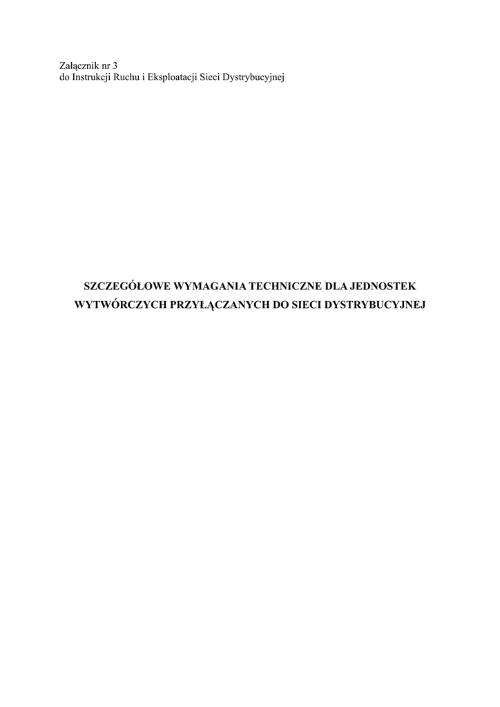 Załącznik nr 3 do Instrukcji Ruchu i Eksploatacji Sieci Dystrybucyjnej SZCZEGÓŁOWE WYMAGANIA TECHNICZNE DLA JEDNOSTEK WYTWÓRCZYCH PRZYŁĄCZANYCH DO SIECI DYSTRYBUCYJNEJ 1. POSTANOWIENIA OGÓLNE 1.1. Wymagania zawarte w punktach od 1.2 do 6.9 dotyczą jednostek wytwórczych przyłączanych i przyłączonych do sieci dystrybucyjnej. Dla istniejących jednostek wytwórczych nie spełniających przedmiotowych wymagań technicznych ustala się okres dostosowawczy na ich spełnienie obowiązujący do końca 2006 r. 1.2. Operator systemu dystrybucyjnego określa warunki przyłączenia do sieci dla jednostek wytwórczych, w tym ustala do sieci o jakim poziomie napięcia znamionowego należy przyłączyć jednostki wytwórcze, w zależności od wielkości mocy przyłączeniowej i lokalnych warunków pracy sieci dystrybucyjnej oraz z uwzględnieniem wyników ekspertyzy wpływu przyłączanych instalacji na system elektroenergetyczny. Zakres ekspertyzy wykonywanej i dostarczanej przez wytwórcę wraz z wnioskiem o określenie warunków przyłączenia, wymaga wcześniejszego uzgodnienia z operatorem systemu dystrybucyjnego. 1.3. Sposób przyłączenia jednostek wytwórczych do sieci dystrybucyjnej, powinien umożliwiać ich odłączenie oraz stworzenie przerwy izolacyjnej, w sposób nieograniczony dla operatora systemu dystrybucyjnego. 1.4. Jednostki wytwórcze o mocy osiągalnej powyżej 150 kVA przyłączane do sieci dystrybucyjnej powinny być zautomatyzowane i dostosowane do zdalnego sterowania. Operator systemu dystrybucyjnego decyduje o konieczności wyposażenia łącznika sprzęgającego jednostkę wytwórczą z siecią dystrybucyjną w urządzenia umożliwiające zdalne sterowanie. 1.5. Moc zwarciowa w miejscu przyłączenia jednostek wytwórczych do sieci dystrybucyjnej powinna być przynajmniej 20 razy większa od ich mocy przyłączeniowej. 1.6. Praca wyspowa jednostek wytwórczych jest możliwa jedynie na wyspę urządzeń tego wytwórcy, o ile uwzględniono to w warunkach przyłączenia. 2. URZĄDZENIA ŁĄCZENIOWE 2.1. Jednostki wytwórcze muszą posiadać następujące urządzenia łączeniowe: a) łącznik dostosowany do wyłączania jednostki wytwórczej, b) łącznik do odłączania jednostki wytwórczej i stwarzania przerwy izolacyjnej. 2.2. W przypadku, gdy w układzie sieci jest możliwa praca wyspowa jednostki wytwórczej, musi ona posiadać dodatkowy łącznik dostosowany do oddzielenia wyspy od pozostałej części sieci dystrybucyjnej. 2.3. Operator systemu dystrybucyjnego koordynuje pracę łączników, o którym mowa w p.2.1. i decyduje o konieczności ich wyposażenia w system zdalnego sterowania lub odwzorowania stanu pracy. 2.4. Urządzenia łączeniowe jednostek wytwórczych współpracujących z falownikami, powinny być zlokalizowane po stronie prądu przemiennego falownika. 2.5. Impuls wyłączający przesłany od zabezpieczeń do urządzenia łączeniowego musi powodować bezzwłoczne wyłączenie jednostki wytwórczej przez to urządzenie. 3. ZABEZPIECZENIA 3.1. Jednostki wytwórcze powinny być wyposażone w zabezpieczenia podstawowe oraz zabezpieczenia dodatkowe, zgodnie z zapisami części ogólnej IRiESD oraz punktami od 3.2 do 3.19 niniejszego załącznika. 3.2. Zabezpieczenia podstawowe jednostek wytwórczych powinny zostać dobrane zgodnie z obowiązującymi przepisami i normami. Zabezpieczenia te powinny działać na urządzenie łączeniowe określone w p.2.1.a), powodując wyłączenie jednostki wytwórczej z ruchu. 3.3. Jednostki wytwórcze o mocy osiągalnej do 100 kVA z generatorami asynchronicznymi lub synchronicznymi powinny być wyposażone w zabezpieczenia dodatkowe, obejmujące zabezpieczenia zerowo-nadnapięciowe oraz zabezpieczenia do ochrony przed: obniżeniem napięcia, wzrostem napięcia oraz wzrostem prędkości obrotowej. 3.4. Jednostki wytwórcze o mocy osiągalnej powyżej 100 kVA powinny być wyposażone w zabezpieczenia dodatkowe, obejmujące zabezpieczenia zerowonadnapięciowe oraz zabezpieczenia do ochrony przed: obniżeniem napięcia, wzrostem napięcia, obniżeniem częstotliwości oraz wzrostem częstotliwości. 3.5. Jednostki wytwórcze współpracujące z falownikami powinny być wyposażone w zabezpieczenia dodatkowe, obejmujące zabezpieczenia do ochrony przed: obniżeniem napięcia oraz wzrostem napięcia, jak również w urządzenia pozwalające na kontrolowanie i utrzymywanie zadanych parametrów jakościowych energii elektrycznej. 3.6. Operator systemu dystrybucyjnego decyduje o potrzebie wyposażenia jednostek wytwórczych w zabezpieczenie od mocy zwrotnej i pracy wyspowej. 3.7. Zabezpieczenia dodatkowe powinny powodować otwarcie łącznika sprzęgającego jednostkę wytwórczą z siecią dystrybucyjną. W zależności od rodzaju pracy jednostki wytwórczej łącznikiem sprzęgającym jest: a) łącznik określony w p.2.1.a), gdy jednostka wytwórcza nie ma możliwości pracy wyspowej, b) łącznik określony w p.2.2, gdy jednostka wytwórcza ma możliwość pracy wyspowej. 3.8. Operator systemu dystrybucyjnego ustala nastawy oraz zwłokę czasową działania zabezpieczeń dodatkowych, w zależności od miejsca przyłączenia jednostki wytwórczej do sieci dystrybucyjnej. 3.9. Zabezpieczenie dodatkowe do ochrony przed obniżeniem lub wzrostem napięcia musi być wykonane trójfazowo. Jednostka wytwórcza przy obniżeniu lub wzroście napięcia w jednym z przewodów fazowych musi być odłączona od sieci trójbiegunowo. 3.10. Dla jednostek wytwórczych przyłączonych do sieci nN bez możliwości pracy wyspowej, zabezpieczenia dodatkowe mogą być zawarte w zestawie zabezpieczeń podstawowych generatora. Natomiast dla jednostek wytwórczych z możliwością pracy wyspowej, zabezpieczenia dodatkowe powinny stanowić oddzielny zestaw zabezpieczeń. 3.11. Dla zabezpieczeń dodatkowych do ochrony przed: wzrostem częstotliwości, obniżeniem częstotliwości oraz obniżeniem napięcia, wielkości pomiarowe powinny by