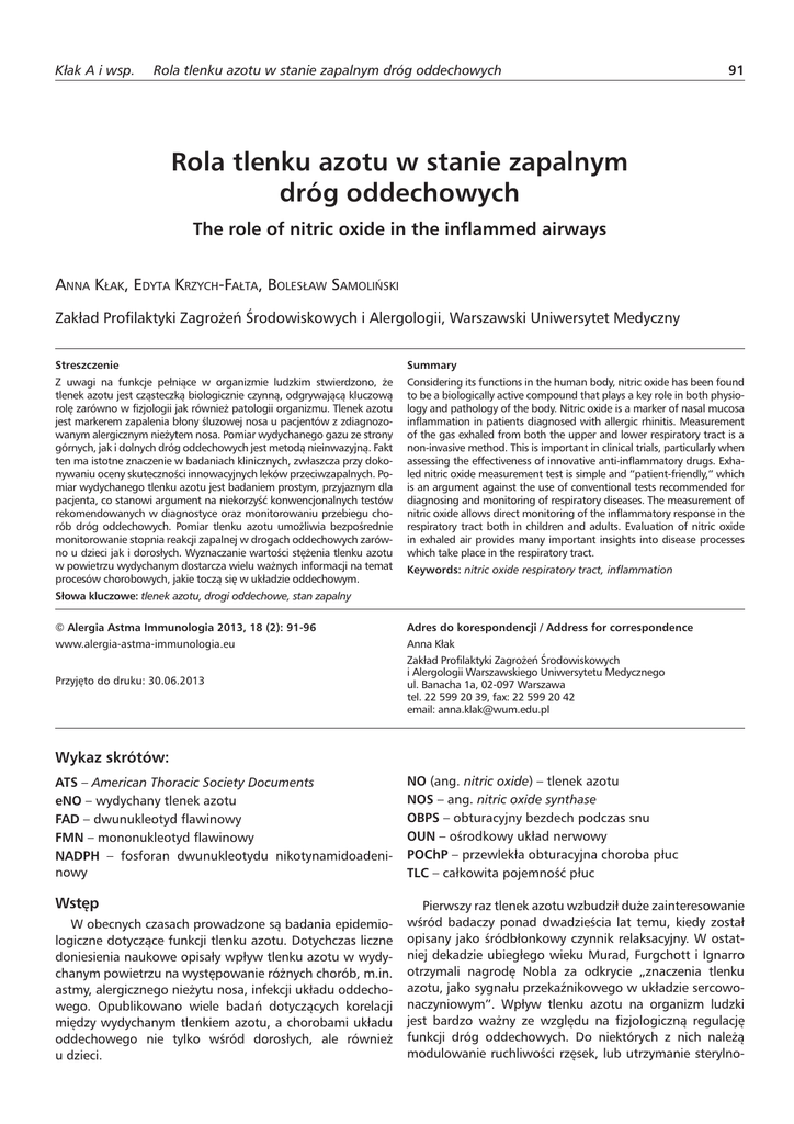 Kłak A i wsp. Rola tlenku azotu w stanie zapalnym dróg oddechowych 91 Rola tlenku azotu w stanie zapalnym dróg oddechowych The role of nitric oxide in the inflammed airways ANNA KŁAK, EDYTA KRZYCH-FAŁTA, BOLESŁAW SAMOLIŃSKI Zakład Profilaktyki Zagrożeń Środowiskowych i Alergologii, Warszawski Uniwersytet Medyczny Streszczenie Summary Z uwagi na funkcje pełniące w organizmie ludzkim stwierdzono, że tlenek azotu jest cząsteczką biologicznie czynną, odgrywającą kluczową rolę zarówno w fizjologii jak również patologii organizmu. Tlenek azotu jest markerem zapalenia błony śluzowej nosa u pacjentów z zdiagnozowanym alergicznym nieżytem nosa. Pomiar wydychanego gazu ze strony górnych, jak i dolnych dróg oddechowych jest metodą nieinwazyjną. Fakt ten ma istotne znaczenie w badaniach klinicznych, zwłaszcza przy dokonywaniu oceny skuteczności innowacyjnych leków przeciwzapalnych. Pomiar wydychanego tlenku azotu jest badaniem prostym, przyjaznym dla pacjenta, co stanowi argument na niekorzyść konwencjonalnych testów rekomendowanych w diagnostyce oraz monitorowaniu przebiegu chorób dróg oddechowych. Pomiar tlenku azotu umożliwia bezpośrednie monitorowanie stopnia reakcji zapalnej w drogach oddechowych zarówno u dzieci jak i dorosłych. Wyznaczanie wartości stężenia tlenku azotu w powietrzu wydychanym dostarcza wielu ważnych informacji na temat procesów chorobowych, jakie toczą się w układzie oddechowym. Considering its functions in the human body, nitric oxide has been found to be a biologically active compound that plays a key role in both physiology and pathology of the body. Nitric oxide is a marker of nasal mucosa inflammation in patients diagnosed with allergic rhinitis. Measurement of the gas exhaled from both the upper and lower respiratory tract is a non-invasive method. This is important in clinical trials, particularly when assessing the effectiveness of innovative anti-inflammatory drugs. Exhaled nitric oxide measurement test is simple and “patient-friendly,” which is an argument against the use of conventional tests recommended for diagnosing and monitoring of respiratory diseases. The measurement of nitric oxide allows direct monitoring of the inflammatory response in the respiratory tract both in children and adults. Evaluation of nitric oxide in exhaled air provides many important insights into disease processes which take place in the respiratory tract. Keywords: nitric oxide respiratory tract, inflammation Słowa kluczowe: tlenek azotu, drogi oddechowe, stan zapalny © Alergia Astma Immunologia 2013, 18 (2): 91-96 www.alergia-astma-immunologia.eu Przyjęto do druku: 30.06.2013 Adres do korespondencji / Address for correspondence Anna Kłak Zakład Profilaktyki Zagrożeń Środowiskowych i Alergologii Warszawskiego Uniwersytetu Medycznego ul. Banacha 1a, 02-097 Warszawa tel. 22 599 20 39, fax: 22 599 20 42 email: [email protected] Wykaz skrótów: ATS – American Thoracic Society Documents eNO – wydychany tlenek azotu FAD – dwunukleotyd flawinowy FMN – mononukleotyd flawinowy NADPH – fosforan dwunukleotydu nikotynamidoadeninowy NO (ang. nitric oxide) – tlenek azotu NOS – ang. nitric oxide synthase OBPS – obturacyjny bezdech podczas snu OUN – ośrodkowy układ nerwowy POChP – przewlekła obturacyjna choroba płuc TLC – całkowita pojemność płuc Wstęp Pierwszy raz tlenek azotu wzbudził duże zainteresowanie wśród badaczy ponad dwadzieścia lat temu, kiedy został opisany jako śródbłonkowy czynnik relaksacyjny. W ostatniej dekadzie ubiegłego wieku Murad, Furgchott i Ignarro otrzymali nagrodę Nobla za odkrycie „znaczenia tlenku azotu, jako sygnału przekaźnikowego w układzie sercowonaczyniowym”. Wpływ tlenku azotu na organizm ludzki jest bardzo ważny ze względu na fizjologiczną regulację funkcji dróg oddechowych. Do niektórych z nich należą modulowanie ruchliwości rzęsek, lub utrzymanie sterylno- W obecnych czasach prowadzone są badania epidemiologiczne dotyczące funkcji tlenku azotu. Dotychczas liczne doniesienia naukowe opisały wpływ tlenku azotu w wydychanym powietrzu na występowanie różnych chorób, m.in. astmy, alergicznego nieżytu nosa, infekcji układu oddechowego. Opublikowano wiele badań dotyczących korelacji między wydychanym tlenkiem azotu, a chorobami układu oddechowego nie tylko wśród dorosłych, ale również u dzieci. 92 ści zatok. Dlatego, tlenek azotu uznawany jest, jako marker zapalenia błony śluzowej nosa u pacjentów z rozpoznanym alergicznym nieżytem nosa. Fakt ten ma istotne znaczenie w badaniach klinicznych. Jako marker stanu zapalnego układu oddechowego tlenek azotu pełni ważną rolę w różnicowej diagnostyce alergologicznej. Ważnym jest, aby pomiar tlenku azotu w powietrzu wydychanym ze strony górnych dróg oddechowych, poddawany był ciągłym próbom standaryzacji. Charakterystyka tlenku azotu Tlenek azotu (ang. nitric oxide, NO) to wolnorodnikowy gaz nieorganiczny będący wewnątrz- i międzykomórkowym przekaźnikiem informacji. Gaz ten pozbawiony jest barwy, zapachu i smaku. Jego rozpuszczalność w wodzie jest słaba. Jest to cząsteczka biologicznie czynna, a jej działanie jest drażniące [1]. Odgrywa znaczącą rolę zarówno w patologii, jak również fizjologii organizmu. Wyróżnia się wiele zawodów, które narażają pracowników na kontakt z tlenkami azotu. Należą do nich m.in. spawacze, hutnicy, jubilerzy, rolnicy, pracownicy laboratoriów oraz górnicy. Funkcja tlenku azotu jest niezwykle kluczowa w fizjologicznej regulacji funkcjonowania układu oddechowego [2]. W dymie papierosowym poziom tlenku azotu zawiera się w granicach: 98-135 mg/m3. W Polsce za dozwolone narażenie na ten związek dopuszcza się stężenie w atmosferycznym powietrzu po przeliczeniu na dwutlenek azotu: 150 µg/m3 w ciągu doby oraz 500 µg/m3 do 30 minut [1]. Zawadzki i Furgchott ponad 20 lat temu opisali nietrwałą substancję, określo