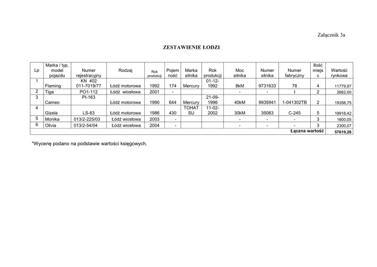 Załącznik 3a ZESTAWIENIE ŁODZI Lp Marka / typ, model pojazdu 1 2 3 Flaming Tiga Numer rejestracyjny KN 402 011-7019/77 PO1-112 PI-163 Cameo Rodzaj Rok produkcji Pojem ność Łódź motorowa Łódź wiosłowa 1992 2001 174 - Łódź motorowa 1990 644 Łódź motorowa Łódź wiosłowa Łódź wiosłowa 1986 2003 2004 430 - 4 5 6 Gizela Monika Olivia LS-63 013/2-225/03 013/2-54/04 *Wycenę podano na podstawie wartości księgowych. Marka silnika Rok produkcji 01-12Mercury 1992 Mercury TOHAT SU 21-091996 11-022002 Moc silnika Numer silnika Numer fabryczny Ilość miejs c 8kM - 9731633 - 78 t 4 2 11779,97 2662,00 40kM 9935941 1-041302TB 2 19358,75 30kM - 35083 - C-245 5 3 3 Łączna wartość Wartość rynkowa 19918,42 1600,05 2300,07 57619,26