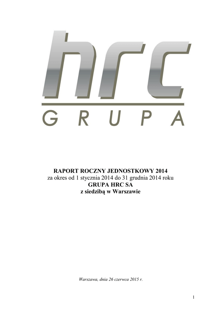 RAPORT ROCZNY JEDNOSTKOWY 2014 za okres od 1 stycznia 2014 do 31 grudnia 2014 roku GRUPA HRC SA z siedzibą w Warszawie Warszawa, dnia 26 czerwca 2015 r. 1 SPIS TREŚCI: 1. LIST ZARZĄDU DO AKCJONARIUSZY SPÓŁKI....................................................3 2. WYBRANE DANE FINANSOWE..............................................................................4 3. OŚWIADCZENIE ZARZĄDU W SPRAWIE RZETELNOŚCI SPORZĄDZENIA SPRAWOZDANIA FINANSOWEGO............................................................................5 4. OŚWIADCZENIE ZARZĄDU W SPRAWIE PODMIOTU UPRAWNIONEGO DO BADANIA SPRAWOZDAŃ FINANSOWYCH……………………………………………..6 5. SPRAWOZDANIE ZARZĄDU Z DZIAŁALNOŚCI SPÓŁKI................ .................... 7 6. OŚWIADCZENIE DOTYCZĄCE STOSOWANIA ZASAD ŁADU KORPORACYJNEGO................................................................................................17 ZAŁĄCZNIKI: 1) SPRAWOZDANIE FINANSOWE ZA ROK 2014 2) OPINIA I RAPORT BIEGŁEGO REWIDENTA 2 Warszawa, dnia 26 czerwca 2015 r. List zarządu do akcjonariuszy Spółki Szanowni Akcjonariusze, Działając w imieniu spółki GRUPA HRC S.A. po raz kolejny mam przyjemność przedstawić Państwu jednostkowy raport roczny spółki za rok 2014. W roku 2014 Spółka podpisała ważny kontrakt z Orange Polska S.A., który będzie realizowany jeszcze w roku 2015 i 2016. Dzięki powyższej umowie rok 2014 był rokiem zasadniczego wzrostu przychodów ze sprzedaży usług i produktów. Szczegółowe dane finansowe oraz sprawozdanie zarządu z działalności spółki, które potwierdzają powyższe fakty, zostały przedstawione w dalszej części raportu oraz w jego załącznikach. Rok 2014 był również kolejnym rokiem realizacji ważnych projektów unijnych, z wykorzystaniem środków pochodzących z Europejskiego Funduszu Społecznego. Dwa projekty mają się z sukcesem zakończyć w roku 2015. Wyniki osiągnięte w roku 2014 pozwalają nam z optymizmem patrzeć w przyszłość. Mamy nadzieję, iż analiza niniejszego raportu pozwoli Wam podzielić ten optymizm. Z poważaniem, Piotr Macoch Członek Zarządu 3 WYBRANE DANE FINANSOWE NA PODSTAWIE JEDNOSTKOWEGO SPRAWOZDANIA FINANSOWEGO SPÓŁKI GRUPA HRC S.A. PRZELICZONE NA EURO PLN Na dzień 31 grudnia 2014 roku EUR Na dzień 31 grudnia 2013 roku Na dzień 31 grudnia 2014 roku Na dzień 31 grudnia 2013 roku Aktywa trwałe 4 381 332,05 1 117 000,00 1 027 926,72 269 338,35 Aktywa obrotowe 2 749 956,91 1 223 088,79 645 181,45 294 919,17 Aktywa razem 7 131 288,96 2 340 088,79 1 673 108,17 564 257,52 Kapitał własny 1 485 923,76 1 376 172,75 348 620,17 331 831,78 Zobowiązania i rezerwy na zobowiązania 5 645 365,20 963 916,04 1 324 488,00 232 425,74 Pasywa razem 7 131 288,96 2 340 088,79 1 673 108,17 564 257,52 Rok zakończony dnia 31 grudnia 2012 Rok zakończony dnia 31 grudnia 2014 13 018 949,49 1 053 254,21 3 107 667,03 250 119,74 (508 211,05) (1 358 894,00) (121 311,69) (322 701,02) Zysk/strata na działalności operacyjnej 244 852,57 228 668,71 58 447,13 54 302,71 Zysk/strata brutto 166 374,01 214 130,60 39 714,04 50 850,30 Zysk/strata netto 109 751,01 162 987,60 26 197,94 38 705,20 Przepływy środków pieniężnych z działalności operacyjnej 641 783,22 286 319,00 153 195,81 67 993,11 Przepływy środków pieniężnych z działalności inwestycyjnej (99 000,00) (51 000,00) (23 631,63) (12 111,14) (533 367,74) (75 083,01) (127 316,67) (17 830,21) PLN Rok zakończony dnia 31 grudnia 2014 Przychody netto ze sprzedaży Zysk/strata na sprzedaży Przepływy środków pieniężnych z działalności finansowej EUR Rok zakończony dnia 31 grudnia 2013 Wybrane dane finansowe zostały przeliczone na euro według następujących zasad: - pozycje aktywów i pasywów - średni kurs euro ogłoszony przez Narodowy Bank Polski obowiązujący na ostatni dzień roku obrotowego Na dzień 31 grudnia 2014 roku 4,2623 Na dzień 31 grudnia 2013 roku 4,1472 - pozycje rachunku zysków i strat oraz rachunku przepływów pieniężnych - kurs stanowiący średnią arytmetyczną średnich kursów euro ogłaszanych przez Narodowego Banku Polskiego obowiązujących na ostatni dzień każdego miesiąca roku obrotowego Rok zakończony dnia 31 grudnia 2014 4,1893 Rok zakończony dnia 31 grudnia 2013 4,2110 4 Oświadczenie zarządu w sprawie rzetelności sporządzenia sprawozdania finansowego Zarząd GRUPA HRC S.A. oświadcza, że wedle jego najlepszej wiedzy, roczne sprawozdanie finansowe za rok 2014 i dane porównywalne sporządzone zostały zgodnie z przepisami obowiązującymi Emitenta lub standardami uznawanymi w skali międzynarodowej oraz odzwierciedlają w sposób prawdziwy, rzetelny i jasny sytuację majątkową i finansową Emitenta oraz jego wynik finansowy oraz że roczne sprawozdanie zarządu z działalności zawiera prawdziwy obraz rozwoju i osiągnięć oraz sytuacji Emitenta, w tym opisanych podstawowych ryzyk i zagrożeń. Warszawa, dnia 26 czerwca 2015 r. Piotr Macoch Członek Zarządu 5 Oświadczenie zarządu w sprawie podmiotu uprawnionego do badania sprawozdań finansowych Zarząd spółki GRUPA HRC S.A. oświadcza, że podmiot uprawniony do badania sprawozdań finansowych WBS Audyt Sp. z o.o. - dokonujący badania rocznego jednostkowego sprawozdania finansowego za rok 2014 został wybrany zgodnie z przepisami prawa oraz że podmiot ten oraz biegli rewidenci dokonujący badania tego jednostkowego sprawozdania, spełniali warunki do wyrażenia bezstronnej i niezależnej opinii o badaniu, zgodnie z właściwymi przepisami prawa krajowego. Warszawa, dnia 26 czerwca 2015 r. Piotr Macoch Członek Zarządu 6 SPRAWOZDANIE ZARZĄDU Z DZIAŁALNOŚCI SPÓŁKI za okres od 01.01.2014 r. do 31.12.2014 r. GRUPA HRC Spółka Akcyjna z siedzibą w Warszawie ( KRS 0000372596 ) Warszawa, dnia 26 czerwca 2015 7 1. NAZWA PODMIOTU GRUPA HRC 2. SIEDZIBA PODMIOTU ul. Leszno 8/1, 01-192 Warszawa 3. FORMA PRAWNA PODMIOTU Spółka Akcyjna 4. REGON 016099664 5. NIP 9