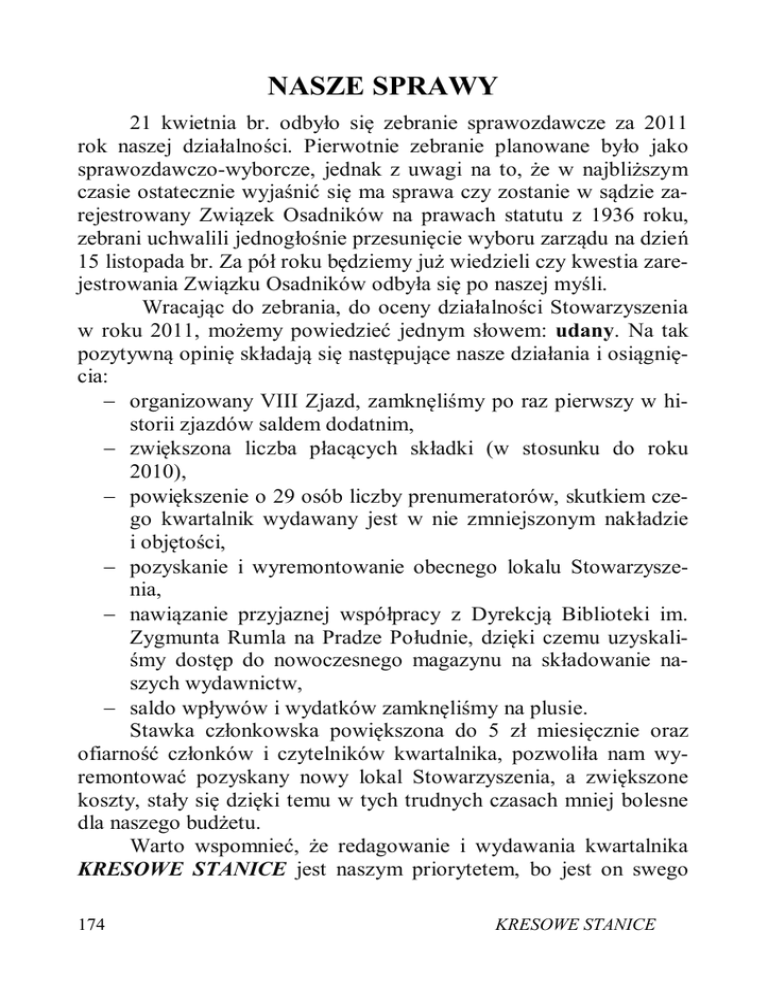NASZE SPRAWY 21 kwietnia br. odbyło się zebranie sprawozdawcze za 2011 rok naszej działalności. Pierwotnie zebranie planowane było jako sprawozdawczo-wyborcze, jednak z uwagi na to, że w najbliższym czasie ostatecznie wyjaśnić się ma sprawa czy zostanie w sądzie zarejestrowany Związek Osadników na prawach statutu z 1936 roku, zebrani uchwalili jednogłośnie przesunięcie wyboru zarządu na dzień 15 listopada br. Za pół roku będziemy już wiedzieli czy kwestia zarejestrowania Związku Osadników odbyła się po naszej myśli. Wracając do zebrania, do oceny działalności Stowarzyszenia w roku 2011, możemy powiedzieć jednym słowem: udany. Na tak pozytywną opinię składają się następujące nasze działania i osiągnięcia: - organizowany VIII Zjazd, zamknęliśmy po raz pierwszy w historii zjazdów saldem dodatnim, - zwiększona liczba płacących składki (w stosunku do roku 2010), - powiększenie o 29 osób liczby prenumeratorów, skutkiem czego kwartalnik wydawany jest w nie zmniejszonym nakładzie i objętości, - pozyskanie i wyremontowanie obecnego lokalu Stowarzyszenia, - nawiązanie przyjaznej współpracy z Dyrekcją Biblioteki im. Zygmunta Rumla na Pradze Południe, dzięki czemu uzyskaliśmy dostęp do nowoczesnego magazynu na składowanie naszych wydawnictw, - saldo wpływów i wydatków zamknęliśmy na plusie. Stawka członkowska powiększona do 5 zł miesięcznie oraz ofiarność członków i czytelników kwartalnika, pozwoliła nam wyremontować pozyskany nowy lokal Stowarzyszenia, a zwiększone koszty, stały się dzięki temu w tych trudnych czasach mniej bolesne dla naszego budżetu. Warto wspomnieć, że redagowanie i wydawania kwartalnika KRESOWE STANICE jest naszym priorytetem, bo jest on swego 174 KRESOWE STANICE rodzaju spoiwem (między członkami, czytelnikami a zarządem), które łączy i napędza naszą działalność. *** Witamy w naszym gronie nowych członków: 534. Regina Wyrwa, os. Antonowo, pow. Oszmiana, córka osadnika Ignacego Rabcewicza 535. Adam Korybski, os. nie oznaczona, pow. Grodno, wnuk osadnika plut. Henryka Korybskiego 536. Jan Zubelewicz, os. Orłopol, pow. Krzemieniec, wnuk brata osadnika plut. Jana Szulca *** Wpłaty na działalność Stowarzyszenia w okresie od 1 lutego do 30 czerwca 2012 roku: Dariusz Padzik 100 $ Kan. Sadowska Wójcik Sabina 20 zł Buczyński Henryk 50 zł Kocur Irena 50 zł Wołocznik Zbigniew 60 zł Dobosz Henryka 50 zł Dobrowolski Ryszard 60 zł Herman Mirosława 20 zł Ludzis Wacław 50 zł Mączko Izabella 50 zł Fiutek Bogusława 50 zł Rutczyński Edward 90 zł Pachniewicz Janusz 150 zł Tomaszewski Tadeusz 50 zł Gilu Henryk 60 zł Mikulicz Sergiusz 40 zł Rodziewicz Helena 10 zł Figlarz Jerzy 200 zł Krauze Aleksander 200 zł Wierzbicki Wacław 30 USD Szydło Stanisław 100 zł Witkowski Henryk 50 zł KRESOWE STANICE Kozaczuk Leokadia 20 zł Spicewicz Barbara 50 zł Pawlak Krystyna 20 zł Kuba Bogusław 70 zł Wiśniewska Wanda 20 zł Sadowski Władysław 10 zł Łoźna Regina 100 zł Panocka Anna 30 zł Smogorzewska Janina 150 zł Łysy Łucja 50 zł Więckowicz Piotr 10 zł Bielska Irena 60 zł Kornecka Józefa 50 zł Krokocka Antonina 60 zł Dobek Mieczysław Irena 50 zł Skwara Tomasz Jerzy 40 zł Dudek Czesław 200 zł Kownacki Krzysztof 200 zł Wójcik Mieczysław 200 zł Migut Krystyna 20 USD Stanuch Krystyna 20 zł Szewczyk Maria 20 zł 175 Ursyn Niemcewicz Barbara 100 zł Skwora Tomasz Jerzy 40 zł *** Wpłaty na remont lokalu Stowarzyszenia przy Al. Armii Ludowej: Hodkiewicz Wilhelm Hodkiewicz Olgierd Hodkiewicz Sawicka Emma Grzegorczyk Klajn Helena 100 Dolarów Kanadyjskich 100 Dolarów Kanadyjskich 100 Dolarów Kanadyjskich 100 Dolarów Kanadyjskich Bardzo serdecznie dziękujemy wpłacającym ofiarodawcom. *** Zapraszamy do nowego lokalu na otwarte zebrania zarządu Stowarzyszenia. Oto najbliższe terminy: 24 września, 29 października 2012 r. w każdy ostatni poniedziałek miesiąca o godzinie 16.00. Pełnimy też stałe dyżury sekretariatu i redakcji w każdy czwartek od godziny 15.30 do 17.30. W szczególnych przypadkach dla osób spoza Warszawy spotykamy się w dowolnym umówionym terminie. *** Uwaga: Planowana jest publikacja o osadnikach z Orłopola, gm. Wiśniowiec, pow. Krzemieniec, woj. wołyńskie. Kontakt: [email protected] *** Czytaliśmy polecamy: Staraniem małżeństwa Kaniewskich i naszego Stowarzyszenia ukazało się III wydanie Poezji Zygmunta Jana Rumla DWIE MATKI. Nakład niszowy – jedynie 250 egzemplarzy. Wydanie kompletne tak w doborze wierszy, jak i biografii, a także wspomnień bliskich poety. Książkę w cenie 25 zł (w tym koszty przesyłki) można zamawiać w Stowarzyszeniu. 176 KRESOWE STANICE STOWARZYSZENIE NOWOGRÓDZIAN I SYMPATYKÓW ZIEMI NOWOGRÓDZKIEJ Warszawa, 2.08.2012 r. Zarząd Stowarzyszenia Nowogródzian i Sympatyków Ziemi Nowogródzkiej zwraca się z uprzejmą prośbą o wsparcie finansowe na remont „Domu Polskiego” w Nowogródku na Białorusi. Jest to dom parterowy o konstrukcji drewnianej, częściowo murowanej, wybudowany w latach 30. ubiegłego wieku, nie posiada instalacji sanitarnej – wody, kanalizacji – wymaga generalnego remontu. Konieczna jest wymiana zniszczonych okien i drzwi. Stowarzyszenie Nowogródzian i Sympatyków Ziemi Nowogródzkiej zakupuje książki szkolne i przesyła do jedynej polskiej szkoły w Nowogródku na terenie powiatu, a składki członkowskie nie wystarczają na remont domu. Okazana pomoc Polakom na Kresach Wschodnich jest w dzisiejszych czasach niezbędna, a zatem liczymy na wsparcie. Z poważaniem Prezes Stowarzyszenia Nowogródzian i Sympatyków Ziemi Nowogródzkiej Tadeusz Kułakowski Uzupełniając apel Prezesa Stowarzyszenia Nowogródzian Tadeusza Kułakowskiego, prosimy by deklarowane wpłaty przekazywać za pomocą blankietu z numerem naszego konta, tak jak składki czy prenumeratę z dopiskiem „Dom Polski w Nowogródku”. Zarząd na ostatnim Zebraniu przyjął uchwałę przeka