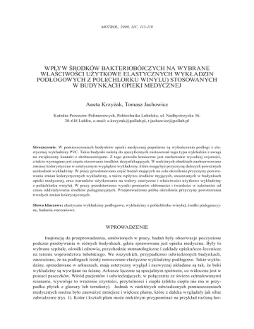 MOTROL, 2009, 11c, 113-119 Wpływ środków bakteriobójczych na wybrane właściwości użytkowe elastycznych wykładzin podłogowych z poli(chlorku winylu) stosowanych w budynkach opieki medycznej Aneta Krzyżak, Tomasz Jachowicz Katedra Procesów Polimerowych, Politechnika Lubelska, ul. Nadbystrzycka 36, 20-618 Lublin, e-mail: [email protected], [email protected] Streszczenie. W pomieszczeniach budynków opieki medycznej popularne są wykończenia podłogi z elastycznej wykładziny PVC. Takie budynki należą do specyficznych zastosowań tego typu wykładzin z uwagi na zwiększony kontakt z drobnoustrojami. Z tego powodu konieczne jest zachowanie wysokiej czystości, a także wymagane jest częste stosowanie środków dezynfekujących. W niektórych obiektach zaobserwowano zmiany kolorystyczne w estetycznym wyglądzie wykładziny, które mogą być przyczyną dalszych poważnych uszkodzeń wykładziny. W pracy przedstawiono część badań mających na celu określenie przyczyny powstawania zmian kolorystycznych wykładziny, a także wpływu środków myjących, stosowanych w budynkach opieki medycznej, oraz warunków użytkowania na walory estetyczne i właściwości użytkowe wykładziny z poli(chlorku winylu). W pracy przedstawiono wyniki pomiarów chłonności i twardości w zależności od czasu oddziaływania środków pielęgnacyjnych. Przeprowadzono próbę określenia przyczyny powstawania trwałych zmian kolorystycznych. Słowa kluczowe: elastyczne wykładziny podłogowe, wykładziny z poli(chlorku winylu), środki pielęgnacyjne, badania starzeniowe. Wprowadzenie Inspiracją do przeprowadzenia, omówionych w pracy, badań były obserwacje poczynione podczas przebywania w różnych budynkach, gdzie sprawowana jest opieka medyczna. Były to wybrane szpitale, ośrodki zdrowia, przychodnie stomatologiczne i zakłady opiekuńczo-lecznicze na terenie województwa lubelskiego. We wszystkich, przypadkowo odwiedzonych budynkach, zauważono, że na podłogach leżały nowoczesne elastyczne wykładziny podłogowe. Takie wykładziny, sprzedawane w arkuszach, mają estetyczny wygląd i zazwyczaj układane są tak, że boki wykładziny są wywijane na ścianę. Arkusze łączone są specjalnym spoiwem, co widoczne jest w postaci paseczków. Wśród pacjentów i odwiedzających, w połączeniu ze świeżo odmalowanymi ścianami, wywołuje to wrażenie czystości, przytulności i ciepła (efektu ciepła nie ma w przypadku płytek z glazury lub terrakoty). Jednak w niektórych odwiedzonych pomieszczeniach medycznych można było zauważyć mniejsze i większe plamy, które z daleka wyglądały jak silne zabrudzenie (rys. 1). Kolor i kształt plam może niektórym przypominać na przykład rozlaną her- 114 Aneta Krzyżak, Tomasz Jachowicz batę. Są one jednak trwałe i nie dają się zmyć. Takie plamy niewątpliwie psują estetyczny obraz pomieszczenia. Zaciekawienie autorów wzbudziła informacja otrzymana jesienią 2008 roku od administratora jednego z takich budynków. Wykładzina była stosunkowo nowa. Została zamontowana późną wiosną 2007 roku. Plamy zaczęły się pojawiać już po roku użytkowania! Rys. 1. Przebarwienia powstałe na elastycznej wykładzinie podłogowej Fig. 1. Colour changes formed on elastic floor covering Elastyczne wykładziny podłogowe montowane w takich obiektach są zazwyczaj trójwarstwowe o grubości od 2 do 4 mm i często każda jest wykonana z PVC. Spodnią warstwę tworzy podkład, który nie musi spełniać specjalnych wymagań odnośnie trwałości. Przede wszystkim musi dobrze łączyć się z klejem, żeby po ułożeniu wykładzina ściśle przylegała do podłoża i nie odklejała się w trakcie długotrwałego użytkowania. Środkową warstwę stanowi cienka folia, która jest zabarwiona na określony kolor lub zadrukowana w estetyczne wzory. Natomiast wierzchnią warstwę o grubości około 1 mm stanowi poli(chlorek winylu) o podwyższonych właściwościach użytkowych, w szczególności o wysokiej odporności na ścieranie. Jest zazwyczaj przezroczysty lub czasami lekko matowy, jednak nie przesłaniający grafiki nałożonej na środkowej warstwie wykładziny. Mimo wrażenia jednolitej i gładkiej, powierzchnia wykładziny nie jest jednorodna. Występują w niej mikropory, w które mogą wnikać zanieczyszczenia i drobnoustroje. Dlatego zaleca się stosowanie specjalnych preparatów np. akrylowych, poliuretanowych czy woskowych w celu naniesienia na ułożoną wykładzinę dodatkowej cienkiej powłoki, wnikającej w te pory i powodującej ich „zaklejenie”. Dopiero po nałożeniu tej ochronnej warstwy wykładzina jest gotowa do użytku [1, 3]. Wiele z oferowanych wykładzin podłogowych jest zabezpieczana powłoką z poliuretanu jeszcze przez producenta. Warstwę ochronną należy odnawiać co kilka lat i oczywiście należy dbać o wykładzinę często ją myjąc. W budynkach, w których sprawowana jest opieka medyczna, bardzo ważne jest przestrzeganie zasad higieny i czystości. Do utrzymania higieny podłóg wykorzystywane są specjalne środki myjące oraz dezynfekujące. Kupuje się je w postaci koncentratów. Do mycia podłogi stosowane są w postaci rozcieńczonej. Do rozcieńczania używa się wody pobieranej z sieci wodociągowej. Zarówno środki myjące, jak i dezynfekujące wymagają ostrożnego stosowania. Nie wolno wąchać koncentratów, ani też stosować ich bez użycia gumowych rękawiczek ochronnych. Wpływ środków bakteriobójczych na wybrane właściwości 115 Materiały i metody badawcze Do określenia rodzaju zjawiska wpływającego na powstawanie przebrawień przygotowano wykładziny elastyczne polskiego producenta pochodzące z tego samego ośrodka medycznego. W badaniach wykorzystano po dwie odmiany kolorystyczne z wykładzin zakupionych i ułożonych w pomieszczeniach tego budynku w odstępie pół roku. Wykładziny, na których wystąpiły przebarwienia kolorystyczne, były ułożone w salach chorych, nat