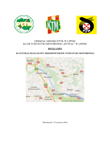 ODDZIAŁ MIEJSKI PTTK W LIPNIE KLUB TURYSTYKI MOTOROWEJ „RYWAL” W LIPNIE REGULAMIN 46 CENTRALNEGO ZLOTU PRZODOWNIKÓW TURYSTYKI MOTOROWEJ Włocławek, 3-5.czerwca 2016 I. Organizator Zlotu Organizatorem Zlotu jest Klub Turystyki Motorowej „RYWAL” w Lipnie przy współudziale Oddziału Miejskiego PTTK w Lipnie i Komisji Turystyki Motorowej Zarządu Głównego PTTK II. Współorganizatorzy • Zarząd Okręgowy Polskiego Związku Motorowego w Bydgoszczy • Starostwo Powiatowe w Lipnie • Urząd Miejski w Lipnie • Tygodnik Lipnowski, Nowości Lipnowskie III. Kierownictwo Zlotu • Komandor Honorowy – Adam Szyda • Komandor – Jan Jagliński • V-ce Komandor do spraw programowych – Jan Kamiński • V-ce Komandor do spraw organizacyjnych – Danuta Pączek-Bazela • V-ce Komandor do spraw krajoznawczych – Zygmunt Grajewski • Sędzia główny – Roman Paśniewski • Kwatermistrz – Paweł Sztuczka, Mieczysław Jagliński • Sekretariat – Joanna Jaglińska, Danuta Wasielak, Teresa Włodarska IV. Cel Zlotu • Propagowanie walorów krajoznawczych i turystycznych woj. kujawsko-pomorskiego, w tym powiatu lipnowskiego, aleksandrowskiego i miasta Ciechocinek • Popularyzacja wiedzy krajoznawczej • Propagowanie turystyki rodzinnej – motorowej V. Uczestnictwo i zgłoszenia Uczestnikami Zlotu są Turyści zmotoryzowani, Przodownicy Turystyki Motorowej, sympatycy i inne osoby, które w terminie do dnia 15 kwietnia br. nadeślą zgłoszenia wraz z potwierdzeniem wpłaty wpisowego w kwocie 190 zł. od osoby na adres: Oddział Miejski PTTK w Lipnie, ul. Piłsudskiego 18/2, konto: 65 9542 0008 2001 0000 2727 0001 z dopiskiem: 46 Centralny Zlot PTM. Kontakt: 600 391 119, e-mail: [email protected] VI. Świadczenia Organizatora • Zakwaterowanie 2 doby w pokojach 1,2 osobowych – Hotel Kujawy, ul. Tadeusza Kościuszki, Włocławek • Wyżywienie: 03.06.2016 – obiadokolacja 04.06.2016 – śniadanie i obiadokolacja 05.06.2016 – śniadanie i obiad • Wycieczki: 03.06.2016 – wycieczka piesza – zwiedzamy zabytki Włocławka 04.06.2016 – wycieczka autokarowa – zwiedzamy zabytki Kujaw, w tym Aleksandrów, Ciechocinek, Raciążek, Nieszawa oraz zabytki powiatu lipnowskiego – Bobrowniki • Puchary, nagrody, materiały krajoznawcze, wlepki, okolicznościowy metalowy znaczek, pieczątka zlotowa. VII. Obowiązki Uczestnika Zlotu Obowiązkiem każdego uczestnika jest przestrzeganie regulaminu i Karty Turysty oraz poleceń Organizatora VIII. Postanowienia końcowe • Zlot odbędzie się bez względu na pogodę • Członkowie PTTK uczestniczący w ww. imprezie z opłaconą składką członkowską na 2016r. są ubezpieczeni od następstw nieszczęśliwych wypadków. Pozostali uczestnicy powinni ubezpieczyć się we własnym zakresie. W przypadku nie przybycia na Zlot wpisowe nie podlega zwrotowi. Uczestników obowiązuje przestrzeganie Karty Turysty oraz poleceń Organizatora. Organizator zastrzega sobie prawo do zmiany regulaminu. Osoby zainteresowane wcześniejszym przyjazdem do hotelu proszone są o zgłoszenie tego faktu do organizatora Jana Jaglińskiego. Koszt przednoclegu wynosi: 45 zł • Organizatorzy nie odpowiadają za szkody wyrządzone osobom trzecim w czasie trwania Zlotu • Uczestnicy ponoszą odpowiedzialność za wyrządzone szkody w miejscu zakwaterowania. • Impreza zarejestrowana jest w Kalendarzu Imprez KTM ZG PTTK pod numerem: 1/16 IX. 46 Centralny Zlot Przodowników Turystyki PTTK Włocławek 2016 jest imprezą non-profit, nie ma charakteru komercyjnego. Zlot jest organizowany na zasadach samoorganizacji, siłami wolontariatu PTTK zgodnie ze statutem PTTK. Powyższy regulamin jest dokumentem wewnętrznym, zatwierdzonym przez Zarząd Oddziału Miejskiego PTTK w Lipnie. Zlot dofinansowano ze środków PTTK Program Zlotu: 03.06.2016 08:00 - 16:00 - przyjazd uczestników Zlotu, zakwaterowanie (parking na zapleczu hotelu), wydanie świadczeń 12:00 – 15:00 – wycieczka przedzlotowa dla chętnych - poznajemy zabytki miasta Włocławek 17:00 – otwarcie Zlotu (hotel) 19:00- obiadokolacja 04.06.2016 08:00 – śniadanie w hotelu 08:45 – 17:00 – wycieczka autokarowa - zwiedzamy zabytki Kujaw o pow. lipnowskiego 17:30-18:45 – rekreacje 19:00 – obiadokolacja 20:00 – wieczorek integracyjny 05.06.2016 08:00 – śniadanie 10:00 – Krajowa Narada Przodowników TM (hotel) 12:00 – Zakończenie Zlotu, wręczenie dyplomów i nagród 13:00 – obiad – zakończenie Zlotu
