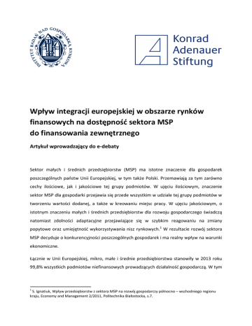 Wpływ integracji europejskiej w obszarze rynków finansowych na dostępność sektora MSP do finansowania zewnętrznego Artykuł wprowadzający do e-debaty Sektor małych i średnich przedsiębiorstw (MSP) ma istotne znaczenie dla gospodarek poszczególnych państw Unii Europejskiej, w tym także Polski. Przemawiają za tym zarówno cechy ilościowe, jak i jakościowe tej grupy podmiotów. W ujęciu ilościowym, znaczenie sektor MSP dla gospodarki przejawia się przede wszystkim w udziale tej grupy podmiotów w tworzeniu wartości dodanej, a także w kreowaniu miejsc pracy. W ujęciu jakościowym, o istotnym znaczeniu małych i średnich przedsiębiorstw dla rozwoju gospodarczego świadczą natomiast zdolności adaptacyjne przejawiające się w szybkim reagowaniu na zmiany popytowe oraz umiejętność wykorzystywania nisz rynkowych.1 W rezultacie rozwój sektora MSP decyduje o konkurencyjności poszczególnych gospodarek i ma realny wpływ na warunki ekonomiczne. Łącznie w Unii Europejskiej, mikro, małe i średnie przedsiębiorstwa stanowiły w 2013 roku 99,8% wszystkich podmiotów niefinansowych prowadzących działalność gospodarczą. W tym 1 S. Ignatiuk, Wpływ przedsiębiorstw z sektora MSP na rozwój gospodarczy północno – wschodniego regionu kraju, Economy and Management 2/2011, Politechnika Białostocka, s.7. samym okresie skupiały 66,9% ogółu zatrudnionych oraz odpowiadały za 58,1% wytworzonej wartości dodanej. Tabela A. Liczba przedsiębiorstw w UE28, wartość dodana oraz zatrudnienie w 2013 roku Mikro Małe Średnie MSP duże RAZEM LICZBA PRZEDSIĘBIORSTW Liczba 19 969 338 1 378 374 223 648 21 571 360 43 517 21 614 908 92,4% 6,4% 1,0% 99,8% 0,2% 100,0% 38 629 012 27 353 660 22 860 792 88 843 464 44 053 576 132 897 040 29,1% 20,6% 17,2% 66,9% 33,1% 100,0% 1 362 336 1 147 885 1 156 558 3 666 779 2 643 795 6 310 557 21,6% 18,2% 18,3% 58,1% 41,9% 100,0% Udział [%] ZATRUDNIENIE Liczba Udział [%] WARTOŚĆ DODANA Mln EUR Udział [%] Źródło: Annual report on European SMEs 2013/2014. A partial and fragile recovery., Komisja Europejska, lipiec 2014, s. 15. W Polsce mikro, małe i średnie przedsiębiorstwa stanowią 99,8% ogółu aktywnych podmiotów gospodarczych (dane za 2012 rok).2 Sektor MSP skupia ponad dwie trzecie zatrudnionych w sektorze przedsiębiorstw ogółem – 70%, oraz generuje ponad połowę wartości dodanej wytworzonej przez sektor MSP. Badania wskazują ponadto, że sektor małych i średnich przedsiębiorstw pełni także istotną rolę w eksporcie Unii Europejskiej. W 2011 roku mikro, małe i średnie przedsiębiorstwa stanowiły ponad 80% eksporterów w Unii Europejskie oraz generowały 34% wartość eksportu. Można więc skonkludować, że rozwój gospodarek europejskich jest w dużym stopniu uzależniony od kondycji i perspektyw rozwoju sektora MSP. Jednym z kluczowych czynników decydujących o rozwoju sektora małych i średnich przedsiębiorstw jest natomiast dostęp do finansowania zewnętrznego. Raport Komisji Europejskiej na temat dostępu sektora MSP do finansowania wskazuje, że kwestie finansowania stanowią drugi najważniejszy problem przed jakim stają małe i średnie firmy w 2 Działalność przedsiębiorstw niefinansowych w 2012 roku, GUS, Warszawa 2014. Unii Europejskiej.3 Czynnik ten został wskazany przez 15% ankietowanych podmiotów. Większe znaczenie miało jedynie pozyskanie klientów (22% wskazań). Podkreślić należy jednocześnie, że odsetek podmiotów wskazujących na problem dostępności finansowania bankowego zwiększył się w porównaniu do badania z 2009 roku o 5 pkt. proc. Powyższe badania wskazują także, że większe problemy związane z dostępnością do finansowania mają przedsiębiorstwa mikro (zatrudniające do 9 osób) oraz małe (zatrudniające od 10 do 49 osób). Wśród tych dwóch grup podmiotów, na problem dostępu do finansowania wskazało odpowiednio 17,9% mikroprzedsiębiorstw oraz 14,9% przedsiębiorstw małych. Rysunek A. Rysunek B. Najważniejsze problemy zgłaszane przez Problem dostępności do finansowania w mikro, przedsiębiorstwa z sektora MSP w UE małych i średnich przedsiębiorstwach w UE (2013) 0% 5% 10% 15% 20% 25% 0,00% 5,00% 10,00% 15,00% 20,00% znalenienie klientów 17,9% mikro dostępność finansowania dostępność wykwalifikowanych pracowników regulacje 14,9% małe konkurencja koszty produkcji lub koszty pracy średnie inne 2013 2011 11,5% 2009 Źródło: 2013 SMEs’ Access to Finance survey. Analytical Report, Komisja Europejska, listopad 2013. Szczególne znaczenie dla małych i średnich przedsiębiorstw ma finansowanie bankowe. Powyższe badania wskazują, że z kredytu bankowego w ciągu ostatnich sześciu miesięcy korzystało 31,6% unijnych podmiotów, a w trakcie prowadzenia działalności, tę formę finansowania zewnętrznego wykorzystywało 36,8% przedsiębiorstw. Duży odsetek przedsiębiorstw z sektora MSP korzystał także z pozostałych form finansowania bankowego 3 2013 SMEs’ Access to Finance survey. Analytical Report, Komisja Europejska, listopad 2013. (debetu, linii kredytowej oraz kredytu w karcie) – odpowiednio 38,8% w ciągu 6 miesięcy poprzedzających badanie, a 21,4% kiedykolwiek w trakcie prowadzenia działalności, a także z leasingu i faktoringu. Przedsiębiorstwa z sektora MSP w nieznacznym stopniu korzystały natomiast z finansowania na rynku kapitałowym w postaci emisji papierów dłużnych lub akcji. Jednocześnie porównania międzynarodowe wskazują, że warunki kredytowania sektora MSP różnią się w poszczególnych krajach. Oprocentowanie kredytów dla pomiotów gospodarczych, stanowiące podstawowy wskaźnik integracji rynków finansowych, różni się w poszczególnych państwach strefy euro nawet o 7,38 pkt. proc. dla kredytów udzielonych małym i średnim przedsiębiorstwom (2012, dane OECD). Rysunek C. Zróżnicowanie oprocentowania przedsiębiorstwom (2012) 10 9 8 7 6 5 4 3 2 1 0 kredytów udzielonych małym i 