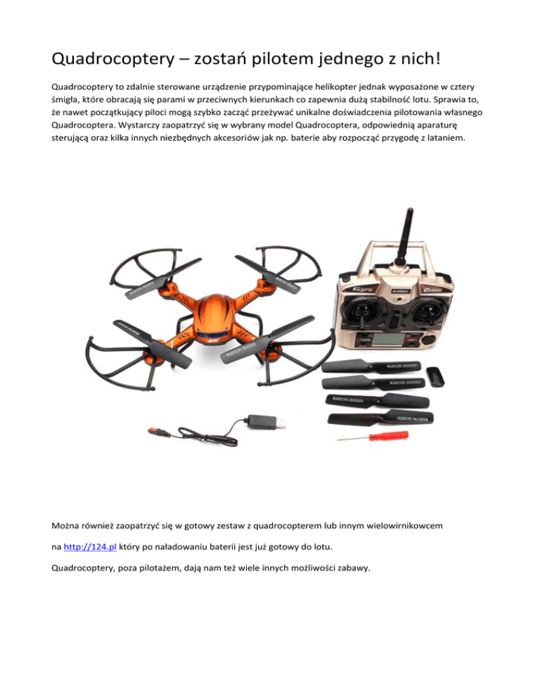 Quadrocoptery – zostań pilotem jednego z nich! Quadrocoptery to zdalnie sterowane urządzenie przypominające helikopter jednak wyposażone w cztery śmigła, które obracają się parami w przeciwnych kierunkach co zapewnia dużą stabilność lotu. Sprawia to, że nawet początkujący piloci mogą szybko zacząć przeżywać unikalne doświadczenia pilotowania własnego Quadrocoptera. Wystarczy zaopatrzyć się w wybrany model Quadrocoptera, odpowiednią aparaturę sterującą oraz kilka innych niezbędnych akcesoriów jak np. baterie aby rozpocząć przygodę z lataniem. Można również zaopatrzyć się w gotowy zestaw z quadrocopterem lub innym wielowirnikowcem na http://124.pl który po naładowaniu baterii jest już gotowy do lotu. Quadrocoptery, poza pilotażem, dają nam też wiele innych możliwości zabawy. Ich konstrukcja pozwala na doczepienie kamery o wadze nawet do 3 kg – w zależności od modelu Quadrocoptera. Dzięki temu, stąpając twardo po ziemi, możemy cieszyć się widokami z lotu ptaka, wyświetlanymi na przenośnym monitorze. Kamery podczepione do modeli latających dają nam nie tylko możliwość podziwiania widoków z lotu ptaka ale również uwiecznienie ich na karcie pamięci, dzięki czemu możemy kręcić niepowtarzalne filmy, które na przykład mogą uatrakcyjnić ofertę naszej firmy poprzez niepowtarzalne filmy reklamowe lub ujęcia z lotu ptaka w filmach z wesel lub innych wydarzeń. Już dziś zostań pilotem własnego quadrocoptera i przeżyj niesamowitą przygodę ! Warunki bezpiecznego użytkowania wielowirnikowców profesjonalnych UWAGA! Informujemy, że platformy wielowirnikowe są NIEBEZPIECZNE. Mają wirujące ostrza w postaci śmigieł. Nie stosowanie się do zasad i przepisów może spowodować zagrożenia dla zdrowia lub życia pilota i osób znajdujących się w pobliżu platformy wielowirnikowej. Ostrzeżenie nie jest żartem! Jednocześnie informujemy, że nie ponosimy żadnej odpowiedzialności za niewłaściwe zachowanie platformy wielowirnikowej na ziemi jak i w powietrzu – odpowiedzialność leży po stronie użytkownika. Użytkownik przyjmuje również do wiadomości, że nie można latać platformami wielowirnikowymi w miejscach niedozwolonych . Pojazdy lotnicze nie są zabawkami. Ich używanie jest dozwolone jedynie przez osoby mające wystarczające umiejętności oraz wiedzę z zakresu pilotażu modeli zdalnie sterowanych RC. Nie można latać platformami w zamkniętych pomieszczeniach. Nie można pilotować platformy nad ludźmi, ponieważ może to doprowadzić do tragedii. Nie można latać platformami w sąsiedztwie urządzeń energetycznych takich jak, linie wysokiego napięcia, transformatory, elektrownie, stacje BTS, nadajniki sygnałów radiowych i telewizyjnych. Funkcja fail safe w aparaturze zdalnego sterowania musi być tak zaprogramowana żeby po utracie zasięgu sygnały sterującego zostały wyłączone silniki. Platforma bez kontroli pilota powinna jak najszybciej zostać uziemiona, ponieważ jej ucieczka może spowodować straty w ludziach i sprzęcie. Każdy pilot decydujący się na pilotaż platform wielowirnikowych ponosi odpowiedzialność za platformę. Czynności do wykonania przed lotem Sprawdzić czy: wszystkie śruby w ramie są dokręcone śruby (kołpaki) mocujące śmigła nie są poluzowane pakiet napędowy jest w pełni naładowany akumulator w nadajniku jest w pełni naładowany w czasie planowanego lotu nie będzie burzy magnetycznej na słońcu jeśli lot ma być realizowany pod kontrolą nawigacji GPS (w trybach: GHP, RTH, WPM geograficzna lokalizacja wykonywania bieżącego lotu nie różni się znacząco od poprzedniej – jeśli się różni skalibrować ponownie kompas. temperatura wykonywania bieżącego lotu nie różni się znacząco od temperatury poprzedniej kalibracji – jeśli się różni skalibrować ponownie akcelerometry antena odbiornika nie jest urwana lub przetarta parametry komputera pokładowego ustawione w profilach lotu są prawidłowe zasięg pomiędzy nadajnikiem (RC TX) a odbiornikiem (RC RX) jest wystarczający Jeśli pilot korzysta z systemu nadawczo-odbiorczego pracującego w paśmie 35/40/70MHz, musi sprawdzić czy wykorzystywany przez niego kanał jest wolny. Jeśli w miejscu wykonywania lotów znajdują się inni piloci z nadajnikami 35/40/70MHz, należy ustalić z nimi używane kanały i sprawdzić czy nadajniki się wzajemnie nie zakłócają. W przypadku korzystanie z systemów pracujących w paśmie 2,4 GHz nie jest to konieczne. Test zasięgu na ziemi musi być zrobiony przed pierwszym startem wielowirnikowca. W tym celu można wykorzystać opcję testowania zasięgu wybraną w menu nadajnika. Test zasięgu powinien być również przeprowadzany okresowo (raz na 150-200 lotów) oraz po każdym naprawie platformy spowodowanej nieudanym lądowaniem. Czynności do wykonania przed startem Sprawdzić czy: warunki pogodowe są odpowiednie w miejscu wykonywania lotów jest odpowiednio dużo miejsca na start i lądowanie w obszarze operowania wielowirnikowcem nie ma urządzeń mogących zakłócić pracę modułów elektronicznych (np: przewody wysokiego napięcia, nadajniki radiowe) antena w nadajniku jest przykręcona wielowirnikowiec wybrany z pamięci nadajnika jest tym, który będzie aktualnie latał przełącznik trybu lotu jest w odpowiednim położeniu wybrany jest odpowiedni profil lotu w komputerze pokładowym śmigła nie mają widocznych uszkodzeń (pęknięcia, wyszczerbienia) w obszarze wirowania śmigieł nie znajdują się elementy które mogę je zablokować antena odbiornika jest prawidłowo ustawiona i nic jej nie zasłania pakiety napędowe są pewnie i bezpiecznie zamontowane w wielowirnikowcu odbiornik GPS ma wystarczająco liczbę satelit do prawidłowego określenia pozycji po aktywacji funkcji GHP lewa dioda zmienia kolor na biały przed włączeniem silników są wyłączone tryby CFF, GHP, RTH, WPM Procedura startu Upewnij się, ż