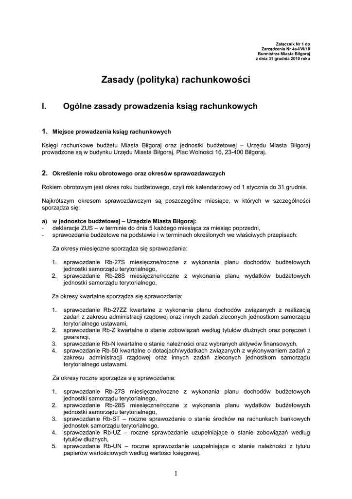 Załącznik Nr 1 do Zarządzenia Nr 4a-I/VI/10 Burmistrza Miasta Biłgoraj z dnia 31 grudnia 2010 roku Zasady (polityka) rachunkowości I. Ogólne zasady prowadzenia ksiąg rachunkowych 1. Miejsce prowadzenia ksiąg rachunkowych Księgi rachunkowe budŜetu Miasta Biłgoraj oraz jednostki budŜetowej – Urzędu Miasta Biłgoraj prowadzone są w budynku Urzędu Miasta Biłgoraj, Plac Wolności 16, 23-400 Biłgoraj. 2. Określenie roku obrotowego oraz okresów sprawozdawczych Rokiem obrotowym jest okres roku budŜetowego, czyli rok kalendarzowy od 1 stycznia do 31 grudnia. Najkrótszym okresem sprawozdawczym są poszczególne miesiące, w których w szczególności sporządza się: a) w jednostce budŜetowej – Urzędzie Miasta Biłgoraj: - deklaracje ZUS – w terminie do dnia 5 kaŜdego miesiąca za miesiąc poprzedni, - sprawozdania budŜetowe na podstawie i w terminach określonych we właściwych przepisach: Za okresy miesięczne sporządza się sprawozdania: 1. 2. sprawozdanie Rb-27S miesięczne/roczne z wykonania planu dochodów budŜetowych jednostki samorządu terytorialnego, sprawozdanie Rb-28S miesięczne/roczne z wykonania planu wydatków budŜetowych jednostki samorządu terytorialnego, Za okresy kwartalne sporządza się sprawozdania: 1. 2. 3. 4. sprawozdanie Rb-27ZZ kwartalne z wykonania planu dochodów związanych z realizacją zadań z zakresu administracji rządowej oraz innych zadań zleconych jednostkom samorządu terytorialnego ustawami, sprawozdanie Rb-Z kwartalne o stanie zobowiązań według tytułów dłuŜnych oraz poręczeń i gwarancji, sprawozdanie Rb-N kwartalne o stanie naleŜności oraz wybranych aktywów finansowych, sprawozdanie Rb-50 kwartalne o dotacjach/wydatkach związanych z wykonywaniem zadań z zakresu administracji rządowej oraz innych zadań zleconych jednostkom samorządu terytorialnego ustawami. Za okresy roczne sporządza się sprawozdania: 1. 2. 3. 4. 5. sprawozdanie Rb-27S miesięczne/roczne z wykonania planu dochodów budŜetowych jednostki samorządu terytorialnego, sprawozdanie Rb-28S miesięczne/roczne z wykonania planu wydatków budŜetowych jednostki samorządu terytorialnego, sprawozdanie Rb-ST – roczne sprawozdanie o stanie środków na rachunkach bankowych jednostek samorządu terytorialnego, sprawozdanie Rb-UZ – roczne sprawozdanie uzupełniające o stanie zobowiązań według tytułów dłuŜnych, sprawozdanie Rb-UN – roczne sprawozdanie uzupełniające o stanie naleŜności z tytułu papierów wartościowych według wartości księgowej. 1 - sprawozdania finansowe na podstawie i w terminach określonych we właściwych przepisach: 1. 2. 3. bilans – sporządzony w terminie 3 miesięcy od dnia, na który zamyka się księgi rachunkowe, rachunek zysków i strat jednostki (wariant porównawczy) – w terminie 3 miesięcy od dnia, na który zamyka się księgi rachunkowe, zestawienie zmian w funduszu jednostki – w terminie 3 miesięcy od dnia, na który zamyka się księgi rachunkowe, b) w jednostce samorządu terytorialnego – Mieście Biłgoraj: - deklaracje na podatek od towarów i usług – w terminie do dnia 25 kaŜdego miesiąca za miesiąc poprzedni, - sprawozdania budŜetowe na podstawie i w terminach określonych we właściwych przepisach: Za okresy miesięczne sporządza się sprawozdania: 1. 2. sprawozdanie Rb-27S miesięczne/roczne z wykonania planu dochodów budŜetowych jednostki samorządu terytorialnego, sprawozdanie Rb-28S miesięczne/roczne z wykonania planu wydatków budŜetowych jednostki samorządu terytorialnego. Za okresy kwartalne sporządza się sprawozdania: 1. 2. 3. 4. 5. 6. sprawozdanie Rb-27ZZ kwartalne z wykonania planu dochodów związanych z realizacją zadań z zakresu administracji rządowej oraz innych zadań zleconych jednostkom samorządu terytorialnego ustawami, sprawozdanie Rb-NDS kwartalne o nadwyŜce/deficycie jednostki samorządu terytorialnego, sprawozdanie Rb-Z kwartalne o stanie zobowiązań według tytułów dłuŜnych oraz poręczeń i gwarancji, sprawozdanie Rb-N kwartalne o stanie naleŜności oraz wybranych aktywów finansowych, sprawozdanie Rb-50 kwartalne o dotacjach/wydatkach związanych z wykonywaniem zadań z zakresu administracji rządowej oraz innych zadań zleconych jednostkom samorządu terytorialnego ustawami, sprawozdanie Rb-ZN – kwartalne o stanie zobowiązań oraz naleŜności Skarbu Państwa z tytułu wykonywania przez jednostki samorządu terytorialnego zadań zleconych. Za okresy półroczne sporządza się sprawozdania: 1. sprawozdanie Rb-34S – półroczne/roczne z wykonania dochodów i wydatków na rachunku, o którym mowa w art. 223 ust. 1 ustawy o finansach publicznych, Za okresy roczne sporządza się sprawozdania: 1. 2. 3. 4. 5. 6. sprawozdanie Rb-27S miesięczne/roczne z wykonania planu dochodów budŜetowych jednostki samorządu terytorialnego, sprawozdanie Rb-28S miesięczne/roczne z wykonania planu wydatków budŜetowych jednostki samorządu terytorialnego, sprawozdanie Rb-PDP roczne z wykonania dochodów podatkowych gminy/miasta na prawach powiatu, sprawozdanie Rb-34S – półroczne/roczne z wykonania dochodów i wydatków na rachunku, o którym mowa w art. 223 ust. 1 ustawy o finansach publicznych, sprawozdanie Rb-ST – roczne sprawozdanie o stanie środków na rachunkach bankowych jednostek samorządu terytorialnego, sprawozdanie Rb-WSa – roczne sprawozdanie o wydatkach strukturalnych poniesionych przez jednostki samorządu terytorialnego, 2 7. 8. sprawozdanie Rb-UZ – roczne sprawozdanie uzupełniające o stanie zobowiązań według tytułów dłuŜnych, sprawozdanie Rb-UN – roczne sprawozdanie uzupełniające o stanie naleŜności z tytułu papierów wartościowych według wartości księgowej, - sprawozdania finansowe na podstawie właściwych przepisów: 1. bilans z wykonania budŜetu jednostki samorządu terytorialnego w terminie 3 miesięcy od dnia, na który zamyka się księgi rachunkowe, 2. łączne sprawozdania finansowe (