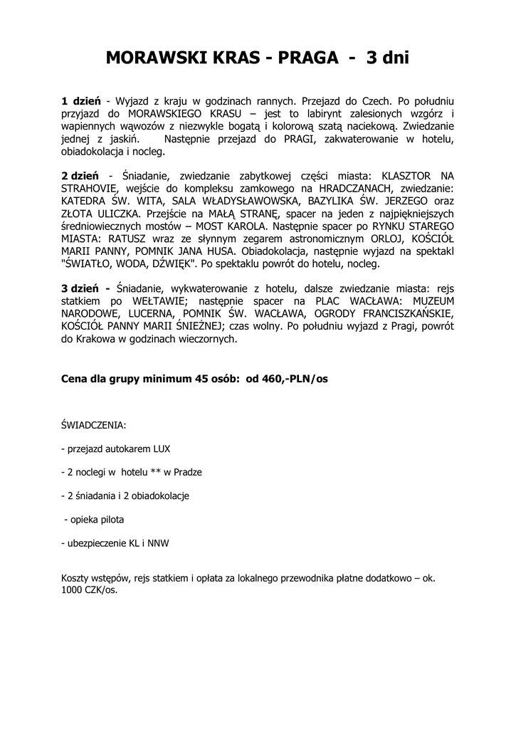 MORAWSKI KRAS - PRAGA - 3 dni 1 dzie - Wyjazd z kraju w godzinach rannych. Przejazd do Czech. Po po udniu przyjazd do MORAWSKIEGO KRASU – jest to labirynt zalesionych wzgórz i wapiennych w wozów z niezwykle bogat i kolorow szat naciekow . Zwiedzanie jednej z jaski . Nast pnie przejazd do PRAGI, zakwaterowanie w hotelu, obiadokolacja i nocleg. 2 dzie niadanie, zwiedzanie zabytkowej cz ci miasta: KLASZTOR NA STRAHOVIE, wej cie do kompleksu zamkowego na HRADCZANACH, zwiedzanie: KATEDRA W. WITA, SALA W ADYS AWOWSKA, BAZYLIKA W. JERZEGO oraz OTA ULICZKA. Przej cie na MA STRAN , spacer na jeden z najpi kniejszych redniowiecznych mostów – MOST KAROLA. Nast pnie spacer po RYNKU STAREGO MIASTA: RATUSZ wraz ze s ynnym zegarem astronomicznym ORLOJ, KO CIÓ MARII PANNY, POMNIK JANA HUSA. Obiadokolacja, nast pnie wyjazd na spektakl WIAT O, WODA, D WI K". Po spektaklu powrót do hotelu, nocleg. 3 dzie - niadanie, wykwaterowanie statkiem po WE TAWIE; nast pnie NARODOWE, LUCERNA, POMNIK W. KO CIÓ PANNY MARII NIE NEJ; czas do Krakowa w godzinach wieczornych. z hotelu, dalsze zwiedzanie miasta: rejs spacer na PLAC WAC AWA: MUZEUM WAC AWA, OGRODY FRANCISZKA SKIE, wolny. Po po udniu wyjazd z Pragi, powrót Cena dla grupy minimum 45 osób: od 460,-PLN/os WIADCZENIA: - przejazd autokarem LUX - 2 noclegi w hotelu ** w Pradze - 2 niadania i 2 obiadokolacje - opieka pilota - ubezpieczenie KL i NNW Koszty wst pów, rejs statkiem i op ata za lokalnego przewodnika p atne dodatkowo – ok. 1000 CZK/os.