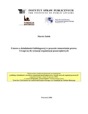 Marek Zubik Ustawa o działalności lobbingowej w procesie stanowienia prawa. Uwagi na tle sytuacji organizacji pozarządowych Opracowanie zostało przygotowane na seminarium „Lobbing i działalność rzecznicza organizacji pozarządowych w świetle nowych regulacji prawnych” zorganizowanego w dniu 10 stycznia 2006r. w ramach Programu „Trzeci Sektor” finansowanego przez Trust for Civil Society in Central and Eastern Europe oraz Fundację im. Stefana Batorego Warszawa 2006 M. Zubik, Ustawa o działalności lobbingowej…, ISP, Warszawa 2006 2 Uchwalenie pod koniec IV kadencji Sejmu ustawy o działalności lobbingowej w procesie stanowienia prawa wywołuje niepokój wśród osób kierujących lub działających m.in. w organizacjach pozarządowych. Warto jest zatem przyjrzeć się rozwiązaniom tej ustawy, mechanizmom jakie ona przewiduje, oraz ewentualnym jej wadom lub zaletom. 1. Przedmiotem rozważań jest ustawa z dnia 7 lipca 2005 r. o działalności lobbingowej w procesie stanowienia prawa (Dz. U. Nr 169, poz. 1414, zwana dalej także ustawą). Będą one prowadzone z punktu widzenia rozwiązań ustrojowych, szczególnie norm i zasad konstytucyjnych. Poza zakresem analizy, poza wyjątkami koniecznymi dla podstawowego zakresu opracowania, pozostaną regulacje ustawy widziane z punktu widzenia prawa cywilnego lub administracyjnego. Te bowiem kwestie wymagałyby przeprowadzenia oddzielnych badań. Na wstępie pragnę również zaznaczyć, że w związku z tym, iż w momencie pisania tego opracowania, ustawa o działalności lobbingowej nie weszła jeszcze w życie, nie można skonfrontować jej rozwiązań z praktyką oraz orzecznictwem. Dlatego też poniższe rozważania należy traktować jako wstępne ustalenia dotyczące znaczenia oraz sposobu rozumienia normatywnej treści tej ustawy. 2. Brak jest w literaturze powszechnie przyjętej definicji lobbingu, ocen samego zjawiska czy jego skali [Zob. np. E. Karpowicz: Lobbing w wybranych krajach – zarys uwarunkowań prawnych i działań praktycznych, „Przegląd Sejmowy” 2000, nr 3, s. 51 i n.]. Wymyka się ono spod łatwego ujęcia normatywnego, a niekiedy można mieć wrażenie, że w demokratycznym państwie – przynajmniej w niektórych jego aspektach – w ogóle jest niedostępne dla prawodawcy. Lobbing, rozumiany jako środek służący do bezpośredniego (przez współuczestniczenie w podejmowaniu działań decyzyjnych) czy pośredniego (przez kształtowanie postaw opinii publicznej) wywierania wpływu, na decyzje polityczne, w ramach stanowienia lub stosowania prawa przez decydentów (w wymiarze lokalnym, państwowym lub międzynarodowym), jest zjawiskiem wielopostaciowym i złożonym. Parlament i administracja centralna oraz reprezentujący je funkcjonariusze publiczni, to tylko część podmiotów, w stosunku do których podejmowane są działania lobbistyczne. Również proces stanowienia prawa to tylko jeden z obszarów występowania lobbingu. Wreszcie osoby, które swoje życie zawodowe koncentrują na podejmowaniu działań lobbistycznych, to jedynie nieliczna grupa, która posługuje się mechanizmami lobbingu w przywołanym tu rozumieniu tego pojęcia. Działalność lobbingowa może być wykonywana jako świadczenie usług. Wówczas lobbista reprezentuje interesy zleceniodawcy przed organami władzy publicznej, a świadczy swoje usługi we własnych celach zarobkowych. Działalność lobbingowa może być również realizowana w celu prowadzenia interesów podmiotów zbiorowego (korporacyjnego). Wówczas nie powinny być one utożsamione z interesami konkretnej osoby należącej do takiej korporacji. Racjonalne ujęcie normatywne działalności lobbistycznej wymaga pokazania różnym podmiotom zainteresowanym we współuczestnictwie w procesach decyzyjnych, korzyści wynikających z jawnego jej 3 M. Zubik, Ustawa o działalności lobbingowej…, ISP, Warszawa 2006 prowadzenia. Z drugiej natomiast strony, umożliwia władzom publicznym racjonale stanowienie prawa, ułatwia poszukiwanie kompromisów, wyważenie różnych, niekiedy przeciwstawnych interesów partykularnych czy grupowych, daje możliwość zapewnienia ładu społecznego, a także pozyskiwanie informacji od podmiotów działających na rynku. Służy wreszcie jawności życia politycznego i tym samym szerszemu mechanizmowi zwalczania korupcji. Powyższa wizja regulowania problematyki lobbingu zakłada, że rozwiązania prawne będą miały charakter „wiązany” – w myśl zasady „marchewki i kija”. Marchewką jest w tym wypadku dostęp do procesów decyzyjnych i współudział w nich, w szczególności dostęp do informacji, wstęp na posiedzenia organów itp.; kijem natomiast – obowiązek jawnego prowadzenia takich działań, publicznego prezentowania propozycji zmian w przedłożeniach organów władzy publicznej, a niekiedy również przedstawiania własnych opracowań. Patrząc z powyższego punku widzenia, można mieć duże zastrzeżenia, czy w Polsce, w obecnym stanie rozwiązań normatywnych oraz przy dzisiejszych standardach życia publicznego, taka racjonalna regulacja jest w ogóle możliwa. Szerokie stosownie, przynajmniej w założeniu, ustawy o dostępie do informacji publicznej, łatwość w dostępie do polityków, w tym parlamentarzystów (pewnym miernikiem jest tu dość szeroka możliwość uzyskania przepustki na teren Sejmu), nieprzejrzystość procesu legislacyjnego w Polsce - w znacznym stopniu ograniczają oddziaływanie ustawodawcy na mającą miejsce w Polsce działalność lobbingową. Doświadczenia ze zjawiskami patologicznymi, jakie ujawniły się w Sejmie IV kadencji, powinny były być dla ustawodawcy poważnym ostrzeżeniem i aż nadto jaskrawym dowodem obecnego stanu rzeczy. Pamiętać również należy, że pewne działania lobbistyczne – przynajmniej w najważniejszych sferach działalności gospodarczej - ujęte są już w ramy ustawowych regulacji dotyczących zwalczania nieuczciwej konkurencji,