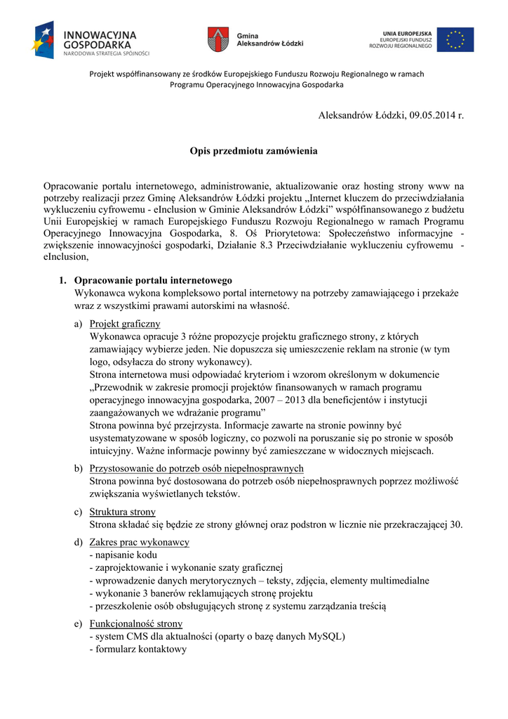 Projekt współfinansowany ze środków Europejskiego Funduszu Rozwoju Regionalnego w ramach Programu Operacyjnego Innowacyjna Gospodarka Aleksandrów Łódzki, 09.05.2014 r. Opis przedmiotu zamówienia Opracowanie portalu internetowego, administrowanie, aktualizowanie oraz hosting strony www na potrzeby realizacji przez Gminę Aleksandrów Łódzki projektu „Internet kluczem do przeciwdziałania wykluczeniu cyfrowemu - eInclusion w Gminie Aleksandrów Łódzki” współfinansowanego z budżetu Unii Europejskiej w ramach Europejskiego Funduszu Rozwoju Regionalnego w ramach Programu Operacyjnego Innowacyjna Gospodarka, 8. Oś Priorytetowa: Społeczeństwo informacyjne zwiększenie innowacyjności gospodarki, Działanie 8.3 Przeciwdziałanie wykluczeniu cyfrowemu eInclusion, 1. Opracowanie portalu internetowego Wykonawca wykona kompleksowo portal internetowy na potrzeby zamawiającego i przekaże wraz z wszystkimi prawami autorskimi na własność. a) Projekt graficzny Wykonawca opracuje 3 różne propozycje projektu graficznego strony, z których zamawiający wybierze jeden. Nie dopuszcza się umieszczenie reklam na stronie (w tym logo, odsyłacza do strony wykonawcy). Strona internetowa musi odpowiadać kryteriom i wzorom określonym w dokumencie „Przewodnik w zakresie promocji projektów finansowanych w ramach programu operacyjnego innowacyjna gospodarka, 2007 – 2013 dla beneficjentów i instytucji zaangażowanych we wdrażanie programu” Strona powinna być przejrzysta. Informacje zawarte na stronie powinny być usystematyzowane w sposób logiczny, co pozwoli na poruszanie się po stronie w sposób intuicyjny. Ważne informacje powinny być zamieszczane w widocznych miejscach. b) Przystosowanie do potrzeb osób niepełnosprawnych Strona powinna być dostosowana do potrzeb osób niepełnosprawnych poprzez możliwość zwiększania wyświetlanych tekstów. c) Struktura strony Strona składać się będzie ze strony głównej oraz podstron w licznie nie przekraczającej 30. d) Zakres prac wykonawcy - napisanie kodu - zaprojektowanie i wykonanie szaty graficznej - wprowadzenie danych merytorycznych – teksty, zdjęcia, elementy multimedialne - wykonanie 3 banerów reklamujących stronę projektu - przeszkolenie osób obsługujących stronę z systemu zarządzania treścią e) Funkcjonalność strony - system CMS dla aktualności (oparty o bazę danych MySQL) - formularz kontaktowy Projekt współfinansowany ze środków Europejskiego Funduszu Rozwoju Regionalnego w ramach Programu Operacyjnego Innowacyjna Gospodarka - kalendarz wydarzeń - galeria zdjęć - strefa logowania (materiały do pobrania dla beneficjentów) f) Wymagania techniczne - zgodność portalu z przeglądarkami Firefox (wersja 29 lub nowsza), Google Chrome (wersja 35 lub nowsza ), Internet Explorer (11 lub nowsza), - wbudowany system CMS obsługujący bezpośrednio bazę danych MySQL do zarządzania treściami aktualności, pozwalający na dodawanie, edycję, kasowanie artykułów zawierających tekst i pliki graficzne oraz na przesyłanie plików graficznych na serwer. 2. Administracja, aktualizacja i hosting strony www a) Administracja Wykonawca będzie sprawował opiekę techniczną nad pracą serwisu poprzez utrzymanie jego dostępności przez cała dobę. Wykonawca na bieżąco będzie usuwał wszelkie awarie związane z serwerem hostingowym, konfiguracją usług, błędnym kodem – czas na usunięcie awarii 24 godziny od momentu zgłoszenia. Na prośbę zamawiającego wykonawca dokona przeróbek w serwisie – do 10 godzin roboczych miesięcznie. b) Aktualizacja Wykonawca będzie aktualizował serwis w oparciu o dostarczone przez zamawiającego materiały w formie elektronicznej (teksty, zdjęcia, pliki multimedialne) – do 10 godzin roboczych miesięcznie. c) Hosting Wykonawca zapewni hosting strony na profesjonalnym serwerze o podanych poniżej parametrach: - przestrzeń dyskowa: 100 GB lub więcej - limit transferu danych: bez limitu - liczba baz danych MSSQL: 1 lub więcej, phpMyAdmin - wielkość bazy danych: 1 GB lub więcej - kopia zapasowa: zarządzana, automatyczna do 3 dni wstecz - serwer FTP: możliwość założenia konta do wybranego katalogu - konta pocztowe: nieograniczona liczba, miejsce na pocztę ograniczone przestrzenią dyskową serwera, obsługa IMAP, SSL - panel administracyjny: zakładanie kont e-mail, ftp, zarządzanie przestrzenią dyskową - obsługiwane technologie: PHP5, MySQL, Javascript - zabezpieczenia: redundancja serwera hostingowego, zabezpieczenia fizyczne Projekt współfinansowany ze środków Europejskiego Funduszu Rozwoju Regionalnego w ramach Programu Operacyjnego Innowacyjna Gospodarka Termin realizacji zamówienia: opracowanie portalu – do 01.07.2014 r. administracja, aktualizacja, hosting - do 30.09.2015 r. Kryteria oceny złożonych ofert: 100% cena Termin ważności oferty: 30 dni Termin składania ofert: 13.06.2014 r. godzina 13.00 Sposób składania ofert: Należy wypełnić formularz oferty, podpisać i opatrzyć pieczęcią firmy a następnie złożyć: - osobiście na biurze podawczym w Urzędzie Miejskim w Aleksandrowie Łódzkim, Plac Kościuszki 2, 95-070 Aleksandrów Łódzki lub - wysłać zeskanowany formularz z podpisem i pieczęcią pocztą elektroniczną na adres [email protected]
