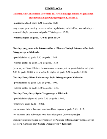 INFORMACJA Informujemy, iż z dniem 1 stycznia 2017 roku nastąpi zmiana w godzinach urzędowania Sądu Okręgowego w Kielcach tj. - poniedziałek od godz. 7.30 do godz. 18.00 przy czym pracownicy sekretariatów wydziałów, oddziałów, samodzielnych stanowisk będą pracować od godz. 7.30 do godz. 15.30, - wtorek-piątek od godz. 7.30 do godz. 15.30. Godziny przyjmowania interesantów w Biurze Obsługi Interesantów Sądu Okręgowego w Kielcach: - poniedziałek od godz. 7.45 do godz. 17.45 - wtorek-piątek od godz. 7.45 do godz. 15.15 (przy czym Biuro Obsługi Interesantów czynne jest w poniedziałek od godz. 7.30 do godz. 18.00, a od wtorku do piątku od godz. 7.30 do godz. 15.30). Godziny Pracy Biura Podawczego Sądu Okręgowego w Kielcach: - poniedziałek od godz. 7.30 do godz. 18.00, - wtorek-piątek od godz. 7.30 do godz. 15.30. Godziny Pracy Kasy Sądu Okręgowego w Kielcach: - poniedziałek-piątek od godz. 7.45 do godz. 15.00, (przerwa w godz. 12.15-13.00), - w ostatnim dniu roboczym miesiąca Kasa czynna w godz. 7.45-13.15, - w ostatnim dniu roboczym roku kasa nieczynna (inwentaryzacja). Godziny przyjmowania interesantów w Punkcie Informacyjnym Krajowego Rejestru Karnego przy Sądzie Okręgowym w Kielcach: - poniedziałek od godz. 7.45 do godz. 18.00, - wtorek-piątek od godz. 7.45 do godz. 15.15, przy czym Punkt Informacyjny KRK czynny będzie: - poniedziałek, od godz. 7.30 do godz. 18.00, - wtorek-piątek, od godz. 7.30 do godz. 15.30. Przerwa codziennie w godz. od 12.30 do godz. 13.00. Godziny obsługi interesantów przez pracowników Sekcji ds. obrotu prawnego z zagranicą, działającej w ramach VIII Wydziału Wizytacyjnego Sądu Okręgowego w Kielcach, w zakresie spraw związanych z międzynarodowym postępowaniem sądowym: - od poniedziałku do piątku, w godzinach od 7.30 do 15.30, w pokoju Nr 20 (I piętro), po uprzednim, telefonicznym ustaleniu terminu i godziny z pracownikami Sekcji, pod numerami kontaktowymi: - tel. 41 340 23 20, - tel. 41 340 24 92, - fax 41 340 23 20. Obsługę interesantów w sprawach związanych z działaniem Sekcji ds. obrotu prawnego z zagranicą, wyłącznie w zakresie podstawowych informacji (np. co do kompetencji właściwych organów odpowiedzialnych za egzekucję orzeczeń zagranicznych), - w poniedziałki, w godz. od godz. 15.30 do godz. 18.00 zapewniają pracownicy Biura Obsługi Interesantów tut. Sądu.