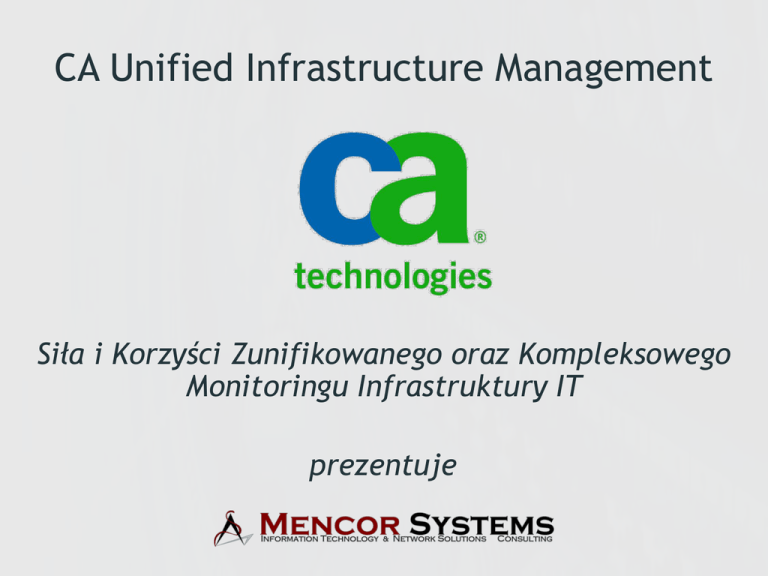 CA Unified Infrastructure Management Siła i Korzyści Zunifikowanego oraz Kompleksowego Monitoringu Infrastruktury IT prezentuje Agenda O nas Kim jesteśmy Całościowe Spojrzenie na CA Unified Infrastructure Management CA UIM, a Konkurencja Cechy i Korzyści Architektura Monitorowane Środowiska Obszary Funkcjonalne i Cechy Poza Funkcjonalne Szczegółowa Prezentacja Funkcji Przykładowe Referencje Kim Jesteśmy Grupa Jesteśmy nowoczesną firmą, której misją jest dostarczanie innowacyjnych rozwiązań z obszaru wysokich technologii, służących wspieraniu rozwoju i skutecznego funkcjonowania biznesu naszych Klientów. Nasza oferta skierowana jest do organizacji o złożonych potrzebach w obszarach efektywnego funkcjonowania aplikacji biznesowych, opierających się na szeroko rozumianej infrastrukturze IT. Skuteczność naszego działania opiera się na połączeniu innowacyjnych i jednocześnie sprawdzonych technologii z doświadczeniem oraz wiedzą z zakresu zarządzania zasobami IT. Wymiernym efektem naszego podejścia jest stabilne działanie technologii informatycznych przy optymalnym poziomie kosztów. Całościowe Spojrzenie na CA UIM Szybkość, Wydajność, Prostota, Łatwość ZUNIFIKOWANY MONITORING PRYWATNYCH I PUBLICZNYCH ŚRODOWISK IT Szerokie pokrycie heterogenicznych, wielkoobszarowych Środowisk IT Logiczne i elastyczne licencjonowanie dopasowane do potrzeb małych, średnich oraz dużych organizacji. Spójne podejście redukujące koszty oraz poprawiające średni czas naprawy Jedna, zunifikowana platforma do monitoringu oraz kontroli całego aktualnego i przyszłego środowiska IT Wielodostępowa Architektura, Konfigurowalne Raporty i Tablice Systemowe, Wysoka Skalowalność, Mechanizmy Plug&Play, Zunifikowane Analizy Trendu oraz Analiza Przyczyn Źródłowych, CA UIM, a Konkurencja Konkurencja CA UIM Tradycyjni dostawcy: niepełne wsparcie dla różnorodnych technologii, luźno zintegrowane modły/produkty; brak jednolitej architektury, a w następstwie kosztowne wdrożenie i utrzymanie Unifikacja, aktualne wsparcie dla różnorodnych środowisk; szybszy wskaźnik „time-to-value” oraz niższy TCO Dostawcy niszowi: często niższy koszt dla określonych obszarów wykorzystania narzędzia; ograniczona integracja, skalowalność i wsparcie Ujednolicony, szeroki i głęboki monitoring , wysoka skalowalność oraz profesjonalne wsparcie Open source/freeware: nie są ‘free’– brak wsparcia dostawcy, ograniczony monitoring „z pudełka”, skomplikowane i pracochłonne kastomizacje zwiększające zaangażowanie zasobów, zwykle niskiej jakości i niepełna dokumentacja techniczne, wymagane dodatkowe wsparcie Wdrożenie oparte na konfiguracjach, APIs i SDK dostarczające gotowe mechanizmy kastomizacyjne, ciągły rozwój, wysoka skalowalność, kompleksowe wsparcie CA UIM – Korzyści i Cechy Pojedyncze, zunifikowane narzędzia dla rozległych organizacji i kompleksowych środowisk IT Szybka instalacja oraz łatwe rozpowszechnienie Wysoka i łatwa skalowalność > 100,000 urządzeń Obdarzone zaufaniem przez profesjonalnych dostawców usług zarządzania zasobami IT 200+ technologii oraz systemów monitorowanych „ z pudełka” Wsparcie dla nowych technologii – aktualizacje kwartalne Dostarczane „z pudełka” szablony zwiększające efektywność działań admnitracyjnych Izolowany Pełen wgląd w wgląd w zasoby i usługi określone IT obszary Różnorodne, Jednolite nie w pełni Rozwiązanie zintegrowane narzędzia Wysoka Walka o dostępność utrzymanie i jakość usług IT poziomu usług Uproszczona Złożona administracja obsługa wielui redukcja narzędzi TCO Niedocenianie Podnosi roli IT IT reputację Wysokie Lepsza nakłady efektywność pracy Strata czasu na Skuteczne uganianie się za działanie codziennymi sprawami Osiąganie Walka o jutrzejszych nadążenie za wymagań technologią dzisiaj CA UIM - Architektura JEDNOLITY MONITORING PRYWATNYCH I PUBLICZNYCH ŚRODOWISK IT Zarządzanie Dostępem Prezentacja Informacji Korelacja / Agregacja Hub Repozytorium Danych Integracje Personalizacja Funkcjonalności CMDB Service Desk Inne Szyna Komunikacyjna Otwarte APIs Integracje 200+ Sond (sieć, serwery, aplikacje, storage, chmura, centra danych, usługi, itp.) Monitorowanie / Zbieranie SDK do tworzenia własnych monitorów i sond Mechanizmy SNMP, Obsługa protokołów NetFlow i sFlow Monitory zdalnie monitorujące zasób Sondy instalowane na monitorowanych zasobach CA UIM – Monitorowane Środowiska • Ponad 200 monitorów / sond pokrywających infrastrukturę IT • Proste dodawanie kolejnych funkcjonalności • Łatwy mechanizm aktualizacji obszarów monitoringu • Dedykowane SDK pozwalające na tworzenie własnych sond i monitorów Systemy Pamięć Masowa Sieć Bazy Danych Aplikacje Cloud/SaaS Centra Danych Wiodące w zakresie pokrycia obszarów monitoringu oraz łatwości użytkowania rozwiązania Obszary Funkcjonalne i Poza Funkcjonalne JEDNOLITY MONITORING PRYWATNYCH I PUBLICZNYCH ŚRODOWISK IT CMDB CA Service Now Atrium Excel BMC HP IBM Novell/Managed Objects zarządzanie zdarzeniami oraz błędami mapy topologii oraz analiza przyczyn źródłowych monitoring czasu odpowiedzi aplikacji „End-to-End” monitoring „End User Experience” monitoring poziomu usług (SLA) oraz KPI grupowanie i analizy danych z różnych perspektyw operacyjna inteligencja gotowe i konfigurowalne tablice zarządzanie uprawnieniami dla użytkowników / ról zaawansowane mechanizmy raportowe Service Desk CA Cloud Service Management CA Cloud Service Management ServiceNow HP Service Desk HP Service Mgr. Remedy ARS Salesforce.com FrontRange/ HEATed Objects Monitorowane Obszary Efektywność Energetyczna Sieć LAN & WAN Serwery Fizyczne & Wirtualne Bazy Danych IT & Business Aplikacje Komercyjne & Własne jednolita, wielodostępowa architektura wysoka skalowalność adaptowalność oraz elastyczność zautomatyzowane mechanizmy powiadomień i eskalacji rozbudowane 