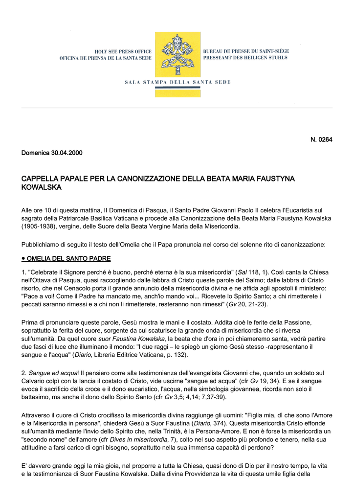 N. 0264 Domenica 30.04.2000 CAPPELLA PAPALE PER LA CANONIZZAZIONE DELLA BEATA MARIA FAUSTYNA KOWALSKA Alle ore 10 di questa mattina, II Domenica di Pasqua, il Santo Padre Giovanni Paolo II celebra l’Eucaristia sul sagrato della Patriarcale Basilica Vaticana e procede alla Canonizzazione della Beata Maria Faustyna Kowalska (1905-1938), vergine, delle Suore della Beata Vergine Maria della Misericordia. Pubblichiamo di seguito il testo dell’Omelia che il Papa pronuncia nel corso del solenne rito di canonizzazione: ● OMELIA DEL SANTO PADRE 1. "Celebrate il Signore perché è buono, perché eterna è la sua misericordia" (Sal 118, 1). Così canta la Chiesa nell'Ottava di Pasqua, quasi raccogliendo dalle labbra di Cristo queste parole del Salmo; dalle labbra di Cristo risorto, che nel Cenacolo porta il grande annuncio della misericordia divina e ne affida agli apostoli il ministero: "Pace a voi! Come il Padre ha mandato me, anch'io mando voi... Ricevete lo Spirito Santo; a chi rimetterete i peccati saranno rimessi e a chi non li rimetterete, resteranno non rimessi" (Gv 20, 21-23). Prima di pronunciare queste parole, Gesù mostra le mani e il costato. Addita cioè le ferite della Passione, soprattutto la ferita del cuore, sorgente da cui scaturisce la grande onda di misericordia che si riversa sull'umanità. Da quel cuore suor Faustina Kowalska, la beata che d'ora in poi chiameremo santa, vedrà partire due fasci di luce che illuminano il mondo: "I due raggi – le spiegò un giorno Gesù stesso -rappresentano il sangue e l'acqua" (Diario, Libreria Editrice Vaticana, p. 132). 2. Sangue ed acqua! Il pensiero corre alla testimonianza dell'evangelista Giovanni che, quando un soldato sul Calvario colpì con la lancia il costato di Cristo, vide uscirne "sangue ed acqua" (cfr Gv 19, 34). E se il sangue evoca il sacrificio della croce e il dono eucaristico, l'acqua, nella simbologia giovannea, ricorda non solo il battesimo, ma anche il dono dello Spirito Santo (cfr Gv 3,5; 4,14; 7,37-39). Attraverso il cuore di Cristo crocifisso la misericordia divina raggiunge gli uomini: "Figlia mia, dì che sono l'Amore e la Misericordia in persona", chiederà Gesù a Suor Faustina (Diario, 374). Questa misericordia Cristo effonde sull'umanità mediante l'invio dello Spirito che, nella Trinità, è la Persona-Amore. E non è forse la misericordia un "secondo nome" dell'amore (cfr Dives in misericordia, 7), colto nel suo aspetto più profondo e tenero, nella sua attitudine a farsi carico di ogni bisogno, soprattutto nella sua immensa capacità di perdono? E' davvero grande oggi la mia gioia, nel proporre a tutta la Chiesa, quasi dono di Dio per il nostro tempo, la vita e la testimonianza di Suor Faustina Kowalska. Dalla divina Provvidenza la vita di questa umile figlia della 2 Polonia è stata completamente legata alla storia del ventesimo secolo, il secolo che ci siamo appena lasciati alle spalle. E', infatti, tra la prima e la seconda guerra mondiale che Cristo le ha affidato il suo messaggio di misericordia. Coloro che ricordano, che furono testimoni e partecipi degli eventi di quegli anni e delle orribili sofferenze che ne derivarono per milioni di uomini, sanno bene quanto il messaggio della misericordia fosse necessario. Disse Gesù a Suor Faustina: "L'umanità non troverà pace, finché non si rivolgerà con fiducia alla divina misericordia" (Diario, p. 132). Attraverso l'opera della religiosa polacca, questo messaggio si è legato per sempre al secolo ventesimo, ultimo del secondo millennio e ponte verso il terzo millennio. Non è un messaggio nuovo, ma si può ritenere un dono di speciale illuminazione, che ci aiuta a rivivere più intensamente il Vangelo della Pasqua, per offrirlo come un raggio di luce agli uomini ed alle donne del nostro tempo. 3. Che cosa ci porteranno gli anni che sono davanti a noi? Come sarà l'avvenire dell'uomo sulla terra? A noi non è dato di saperlo. E' certo tuttavia che accanto a nuovi progressi non mancheranno, purtroppo, esperienze dolorose. Ma la luce della divina misericordia, che il Signore ha voluto quasi riconsegnare al mondo attraverso il carisma di suor Faustina, illuminerà il cammino degli uomini del terzo millennio. Come gli Apostoli un tempo, è necessario però che anche l'umanità di oggi accolga nel cenacolo della storia Cristo risorto, che mostra le ferite della sua crocifissione e ripete: Pace a voi! Occorre che l'umanità si lasci raggiungere e pervadere dallo Spirito che Cristo risorto le dona. E' lo Spirito che risana le ferite del cuore, abbatte le barriere che ci distaccano da Dio e ci dividono tra di noi, restituisce insieme la gioia dell'amore del Padre e quella dell'unità fraterna. 4. E' importante allora che raccogliamo per intero il messaggio che ci viene dalla parola di Dio in questa seconda Domenica di Pasqua, che d'ora innanzi in tutta la Chiesa prenderà il nome di "Domenica della Divina Misericordia". Nelle diverse letture, la liturgia sembra disegnare il cammino della misericordia che, mentre ricostruisce il rapporto di ciascuno con Dio, suscita anche tra gli uomini nuovi rapporti di fraterna solidarietà. Cristo ci ha insegnato che "l'uomo non soltanto riceve e sperimenta la misericordia di Dio, ma è pure chiamato a «usar misericordia» verso gli altri: Beati i misericordiosi, perché troveranno misericordia (Mt 5, 7)" (Dives in misericordia, 14). Egli ci ha poi indicato le molteplici vie della misericordia, che non perdona soltanto i peccati, ma viene anche incontro a tutte le necessità degli uomini. Gesù si è chinato su ogni miseria umana, materiale e spirituale. Il suo messaggio di misericordia continua a raggiungerci attraverso il gesto delle sue mani tese verso l'uomo che soffre. E' così che lo ha visto e lo ha annunciato agli uomini di tutti i continenti suor Faustina, che nascosta nel suo convento di Lagiewniki, in Cracovia, ha fatto della sua esistenza un canto alla misericordia: Misericordias Domini in aeternum cantabo. 