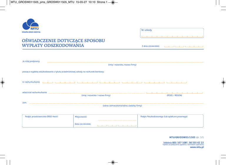 MTU_GROSW011505_pms_GROSW011505_MTU 15-05-27 10:10 Strona 1 Nr szkody OŚWIADCZENIE DOTYCZĄCE SPOSOBU WYPŁATY ODSZKODOWANIA Z dnia (DD:MM:RRRR) Ja niżej podpisany (imię i nazwisko, nazwa firmy) proszę o wypłatę odszkodowania z tytułu przedmiotowej szkody na rachunek bankowy: nr rachunku/konta właściciel rachunku/konta (imię i nazwisko / nazwa firmy) (PESEL / REGON) zam. (adres zamieszkania/adres siedziby firmy) Podpis przedstawiciela ERGO Hestii Miejscowość: Podpis Poszkodowanego (lub opiekuna prawnego) Data (DD:MM:RRRR) MTU/GR/OSW01/1505 str. 1/1 Infolinia 801 107 108*, 58 555 62 22 *opłata za połączenie zgodnie z cennikiem operatora www.mtu.pl
