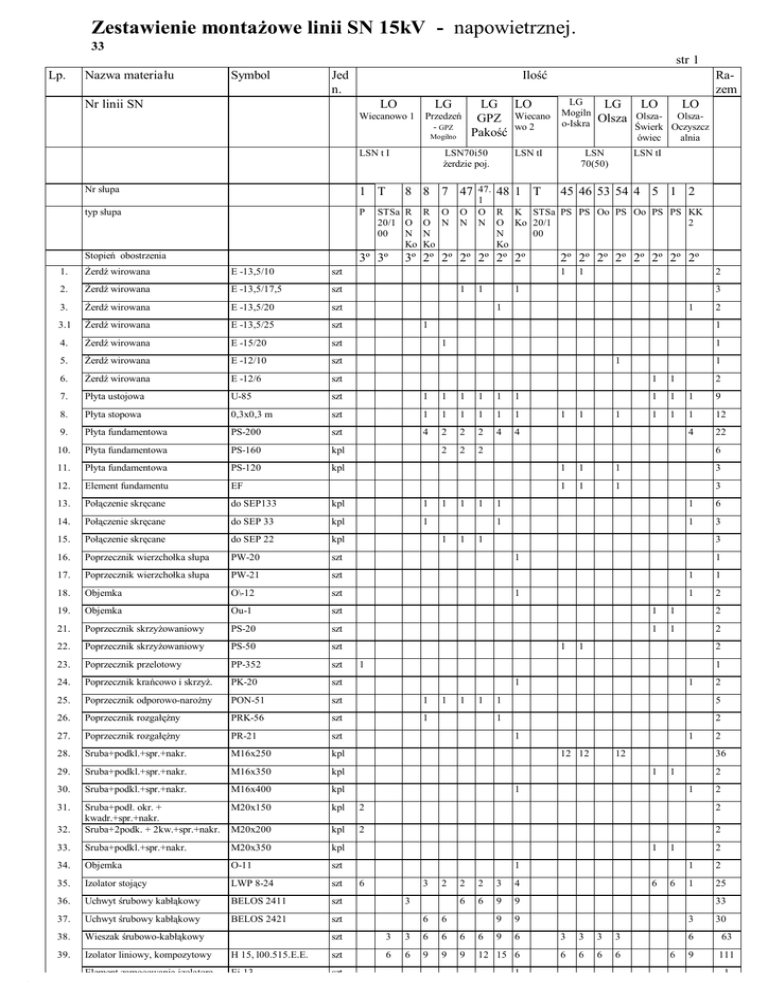 Zestawienie montażowe linii SN 15kV - napowietrznej. 33 str 1 Lp. Nazwa materiału Symbol Jed n. Ilość Nr linii SN LO LG Wiecanowo 1 Przedzeń - GPZ Mogilno LSN t I Nr słupa 1 T typ słupa P Stopień obostrzenia LG LO GPZ Wiecano wo 2 Pakość LSN70i50 żerdzie poj. 8 8 7 47 STSa R 20/1 O 00 N Ko 3º 3º R O O N N Ko O N Razem LG Mogiln o-Iskra LSN tI LSN 70(50) LO LO Olsza- OlszaŚwierk Oczyszcz ówiec alnia LSN tI 47. 48 1 T 45 46 53 54 4 5 1 2 1 O R K STSa PS PS Oo PS Oo PS PS KK N O Ko 20/1 2 N 00 Ko 3º 2º 2º 2º 2º 2º 2º 1. Żerdź wirowana E -13,5/10 szt 2. Żerdź wirowana E -13,5/17,5 szt 3. Żerdź wirowana E -13,5/20 szt 3.1 Żerdź wirowana E -13,5/25 szt 4. Żerdź wirowana E -15/20 szt 5. Żerdź wirowana E -12/10 szt 6. Żerdź wirowana E -12/6 szt 7. Płyta ustojowa U-85 szt 1 1 1 1 1 1 8. Płyta stopowa 0,3x0,3 m szt 1 1 1 1 1 1 4 2 2 2 4 4 2 2 2 2º 2º 2º 2º 2º 2º 2º 2º 1 1 LG Olsza 1 1 2 1 3 1 1 1 2 1 1 1 1 1 1 1 1 1 1 2 1 1 1 9 1 1 1 12 4 22 9. Płyta fundamentowa PS-200 szt 10. Płyta fundamentowa PS-160 kpl 11. Płyta fundamentowa PS-120 kpl 12. Element fundamentu EF 13. Połączenie skręcane do SEP133 kpl 1 14. Połączenie skręcane do SEP 33 kpl 1 15. Połączenie skręcane do SEP 22 kpl 16. Poprzecznik wierzchołka słupa PW-20 szt 17. Poprzecznik wierzchołka słupa PW-21 szt 18. Objemka O\-12 szt 19. Objemka Ou-1 szt 1 1 2 21. Poprzecznik skrzyżowaniowy PS-20 szt 1 1 2 22. Poprzecznik skrzyżowaniowy PS-50 szt 23. Poprzecznik przelotowy PP-352 szt 24. Poprzecznik krańcowo i skrzyż. PK-20 szt 25. Poprzecznik odporowo-narożny PON-51 szt 1 26. Poprzecznik rozgałężny PRK-56 szt 1 27. Poprzecznik rozgałężny PR-21 szt 28. Sruba+podkl.+spr.+nakr. M16x250 kpl 29. Sruba+podkl.+spr.+nakr. M16x350 kpl 30. Sruba+podkl.+spr.+nakr. M16x400 kpl 31. M20x150 kpl 2 2 32. Sruba+podł. okr. + kwadr.+spr.+nakr. Sruba+2podk. + 2kw.+spr.+nakr. M20x200 kpl 2 2 33. Sruba+podkl.+spr.+nakr. M20x350 kpl 34. Objemka O-11 szt 35. Izolator stojący LWP 8-24 szt 36. Uchwyt śrubowy kabłąkowy BELOS 2411 szt 37. Uchwyt śrubowy kabłąkowy BELOS 2421 szt 38. Wieszak śrubowo-kabłąkowy 39. Izolator liniowy, kompozytowy Element zamocowania izolatora 1 1 1 1 1 1 6 1 1 1 3 1 1 1 3 1 1 6 1 1 3 3 1 1 1 1 1 1 1 2 1 2 1 1 1 1 1 1 1 5 1 2 1 1 12 12 12 1 1 1 2 3 2 2 3 4 6 6 9 9 9 9 9 6 1 6 2 2 1 2 1 25 33 6 6 szt 3 3 6 6 6 6 6 3 3 3 3 H 15, l00.515.E.E. szt 6 6 9 9 9 12 15 6 6 6 6 6 Ei-13 szt 1 2 1 1 3 2 36 1 6 2 1 3 6 30 6 63 9 111 1