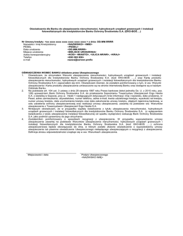 Oświadczenie dla Banku do ubezpieczenia nieruchomości, hybrydowych urządzeń grzewczych i instalacji fotowoltaicznych dla kredytobiorców Banku Ochrony Środowiska S.A. (EKO-BOŚ….) Nr Umowy kredytu: <xx xxxx xxxx xxxx xxxx xxxx xxxx > z dnia: DD.MM.RRRR <NAZWISKO> <IMIE> Nazwisko i Imię Kredytobiorcy <PESEL> PESEL <DD.MM.RRRR> Data urodzenia <MIEJSCE URODZENIA> Miejsce urodzenia <KOD> <MIASTO>, <ULICA NR/NR>, <KRAJ> Adres korespondencyjny <000 000 000> Telefon [email protected] e-mail OŚWIADCZENIA WOBEC BANKU składane przez Ubezpieczonego 1. Oświadczam, że otrzymałem Warunki ubezpieczenia nieruchomości, hybrydowych urządzeń grzewczych i instalacji fotowoltaicznych dla kredytobiorców Banku Ochrony Środowiska S.A. (kod: EKO-BOŚ …..) oraz Kartę produktu ubezpieczenia nieruchomości, hybrydowych urządzeń grzewczych i instalacji fotowoltaicznych dla kredytobiorców Banku Ochrony Środowiska S.A i zapoznałem się nimi. Oświadczam również, że zostałem poinformowany o tym, iż ww. Warunki ubezpieczenia i Karta produktu ubezpieczenia umieszczone są na stronie internetowej Banku oraz dostępne są w każdym Oddziale Banku. 2. Na podstawie art. 104 ust. 3 ustawy z dnia 29 sierpnia 1997 roku Prawo bankowe (tekst jednolity Dz. U. z 2015 roku, poz. 128) upoważniam Bank Ochrony Środowiska S.A. do przekazania Sopockiemu Towarzystwu Ubezpieczeń Ergo Hestia S.A. z siedzibą w Sopocie, przy ul. Hestii 1 następujących dotyczących mnie informacji: imię i nazwisko, data urodzenia, nr Pesel, adres zamieszkania, obywatelstwo, numer telefonu, adres e-mail, kwota udzielonego kredytu, wysokość rat kredytu, numer umowy kredytu, data uruchomienia kredytu oraz data zakończenia umowy kredytu, objętych tajemnicą bankową, w celu udzielenia ochrony ubezpieczeniowej oraz realizacji umowy ubezpieczenia, zawartej na podstawie ww. Warunków ubezpieczenia z Towarzystwem Ubezpieczeń Ergo Hestia S.A. 3. Niniejszym oświadczam, że w przypadku wypłaty świadczenia z tytułu ubezpieczenia nieruchomości, hybrydowych urządzeń grzewczych i instalacji fotowoltaicznych dla kredytobiorców Banku Ochrony Środowiska S.A. (z wyłączeniem świadczenia z tytułu ubezpieczenia instalacji fotowoltaicznej od spadku wydajności) wskazuję Bank Ochrony Środowiska S.A. jako podmiot uprawniony do jego otrzymania. 4. Zostałam/łem poinformowany o sposobach rezygnacji z ubezpieczenia. W przypadku wypowiedzenia umowy ubezpieczenia zawartej na podstawie Warunków ubezpieczenia nieruchomości, hybrydowych urządzeń grzewczych i instalacji fotowoltaicznych dla kredytobiorców Banku Ochrony Środowiska S.A. (kod: EKO-BOŚ …..) ochrona ubezpieczeniowa będzie obowiązywać do dnia, w którym zostało złożone oświadczenie o wypowiedzeniu umowy ubezpieczenia lub pisemne oświadczenie Ubezpieczonego niebędącego ubezpieczającym o rezygnacji z ubezpieczenia. Definicja okresu odpowiedzialności znajduje się w ww. Warunkach ubezpieczenia. Miejscowość i data Podpis Ubezpieczonego <NAZWISKO IMIĘ>