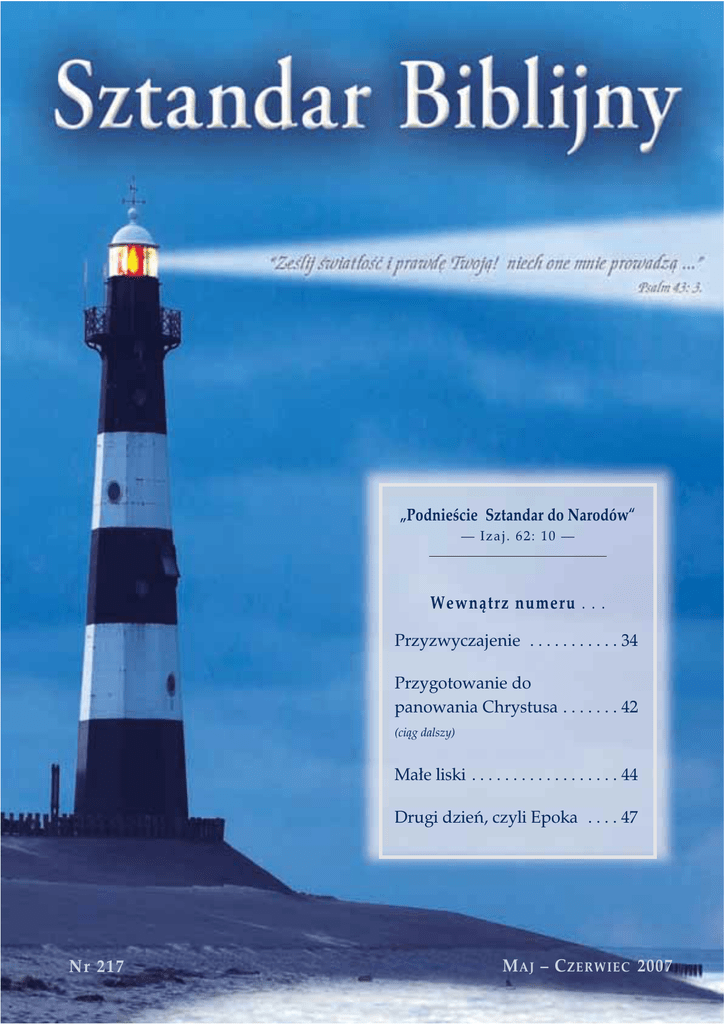 „Podnieście Sztandar do Narodów“ — Izaj. 62: 10 — Wewnątrz numeru . . . Przyzwyczajenie . . . . . . . . . . . 34 Przygotowanie do panowania Chrystusa . . . . . . . 42 (ciąg dalszy) Małe liski . . . . . . . . . . . . . . . . . . 44 Drugi dzień, czyli Epoka . . . . 47 Nr 217 M AJ – C ZERWIEC 2007 P RZYZWYCZAJENIE P RZYZWYCZAJENIE jest czymś, czego prawdopodobnie nie dostrzegamy, że jest bardzo ważne w związku z naszym postępowaniem w wierze i naszym rozwojem w służbie dla Pana dzień po dniu, a w najpełniejszym tego słowa znaczeniu na całą wieczność. List do Rzymian 12:1,2 ma związek z tą sprawą: „Dlatego proszę was bracia przez miłosierdzie Boże, abyście składali wasze ciała ofiarą żywą, świętą, godną przyjęcia przez Boga, co jest waszą rozsądną służbą.” Następny werset jest niezwykle ważny dla naszego tematu: „A nie dostosowujcie się do tego świata, ale się zmieńcie przez odnowienie umysłu waszego, abyście mogli rozpoznać, co jest dobrą, godną przyjęcia i doskonałą wolą Bożą (KJV).” POKUTA Jakże często podkreśla się, że pierwszym krokiem w powrocie do Boga z naszego upadłego, błądzącego stanu, jest żal za grzech. Dlatego nasz Pan powiedział Swym uczniom, gdy mieli rozpocząć głoszenie: „Pokutujcie, albowiem przybliżyło się królestwo niebieskie!” Pierwszą wskazówką w ich zwróceniu się do Boga była pokuta. „... Przybliżyło się królestwo Boże. Pokutujcie...” (Mar. 1:15). Następnej udzielił Apostoł, odpowiadając na pytanie młodego zarządcy: „Co mam czynić, abym był zbawiony?” On miał pokutować i wierzyć w Pana Jezusa Chrystusa, a „będziesz zbawiony.” Wiara w Pana Jezusa Chrystusa doprowadza nas do stanu usprawiedliwienia przez wiarę i to jest drugim krokiem. Wówczas trzecim krokiem jest poświęcenie, jak mamy to przedstawione w Rzym. 12:1: „Dlatego proszę was” usprawiedliwieni bracia! Wy jesteście już usprawiedliwionymi braćmi i jesteście zapraszani by oddać siebie Bogu w poświęceniu. Wy po- kutowaliście już za swoje grzechy i przyjęliście Jezusa jako swego Zbawiciela, co doprowadziło was do usprawiedliwienia przez wiarę, a teraz jesteście zachęcani przez Apostoła Pawła do podjęcia trzeciego kroku i oddania waszego życia Bogu, a czyniąc tak, byście stali się pełnoprawnymi chrześcijanami. Zostaliście kupieni za cenę, dlatego oddajcie Bogu to, co prawnie do Niego należy. On kupił was drogocenną krwią Swego własnego Syna. NAWRÓCENIE. CZYM ONO JEST? Wówczas powiecie: „Wszystko to, co jest niezbędne. Pokutowałem. Wierzę w Pana Jezusa Chrystusa. Poświęciłem swoje życie Bogu i to jest to.” Tak, to jest to, lecz tutaj stawiamy przecinek, a nie kropkę. Coś jeszcze jest konieczne; nawrócenie, i właśnie o tym mówi nasz drugi werset. Nawrócenie, czym ono jest? Musimy być nawróceni. „O”, ktoś powie, „ja już jestem nawrócony, od kiedy przyjąłem Jezusa jako mojego Zbawiciela i poświęciłem moje życie; tak, z pewnością jestem nawrócony.” Nie! Ty dopiero rozpocząłeś nawrócenie. Jednakże nawrócenie jest procesem stopniowym i czasem mijają lata, zanim zostaniemy nawróceni. Pamiętamy, że nasz Pan mówił do Piotra, po tym gdy uwierzył w Pana Jezusa Chrystusa i wyznał Go: „Tyś jest Chrystus, On Syn Boga żywego”; i – „Panie, porzuciliśmy wszystko. Co za to otrzymamy?” Pan powiedział: „stokrotną nagrodę w tym życiu, a w przyszłym świecie życie wieczne.” Tak, oni porzucili wszystko, by pójść za Mistrzem. Oni poświęcili się. Nie tylko pokutowali i uwierzyli, lecz także poświęcili swoje życie Bogu. Czy to wystarczyło? Nie. Jezus powiedział do Piotra w Ew. Łukasza 22:32: „Ale ja prosiłem za tobą, aby nie ustała wiara twoja; a ty Sz tandar Biblijny i Zwiastun Chrystusowego Królestwa (ISSN 1732–0089) Miesięcznik – Wydawany przez Świecki Ruch Misyjny „Epifania” w Nowym Dworze Mazowieckim. Redaktor: Ralph M. Herzig, Pa. 19425 - 2700, USA, Redaktor odpowiedzialny w Polsce: Piotr Woźnicki, ul. Zdobywców Kosmosu 17, 05-100 Nowy Dwór Mazowiecki. Cena: pojedynczego numeru – 3 zł; prenumerata roczna (6 numerów) – 18 zł. Wpłaty w PLN – PKO BP SA Nowy Dwór Maz. – 18 1020 1026 0000 1802 0014 8916; Wpłaty w EURO – B PKO PL PW PKO BP S.A. O/Nowy Dwór Maz. – 19 1020 1026 0000 1002 0105 2554 nawróciwszy się...” „O, Panie, ja jestem już nawrócony! Ja poświęciłem moje życie Tobie! Nie! Ty jeszcze nie jesteś nawrócony. To jest stopniowy proces, który może zająć lata. Dlatego, kiedy się nawrócisz, wzmacniaj braci, aby oni także mogli być nawróceni. Ponadto, co znaczy być nawróconym? Słowo converto znaczy odwrócić się. Ze słowa converto otrzymujemy słowo odwrotny i tak dalej. Converto to odwrócić się, wrócić z powrotem, zawrócić za Panem, z jednej drogi w inną. O, tak. To oznacza wielką przemianę i ta przemiana nie zachodzi w chwili początkowego poświęcenia. W nas ciągle dokonuje się pewne nawrócenie. Jest to wielka zachodząca w nas przemiana, której dokonuje Bóg. On zgromadził nas i znajdujemy się teraz w Jego warsztacie, i On dokonuje w nas przekształceń. Alkoholik, który rezygnuje z trunków może powiedzieć: „Jestem nawróconym człowiekiem!” Osoba, która rzuca palenie i pozbywa się tego nałogu, może powiedzieć, „Ja już nie zapalę, nigdy nie użyję papierosów. Jestem nawróconym człowiekiem.” Czy o takim rodzaju przemiany mówi tutaj Pan? Czy jest to przemiana porzucenia poprzednich rzeczy, zrezygnowania ze złych nałogów, nabycia dobrych przyzwyczajeń? Czy o takiej przemianie Pan mówi? Nie, chociaż ona się z tym wiąże. My musimy walczyć ze złymi nałogami i nabywać dobrych przyzwyczajeń. Ta przemiana to obejmuje, lecz to nie jest jeszcze wszystko w tej sprawie. Czy jest to jedynie przemiana umysłu? Czy jest to nawrócenie lub zmiana czyjejś religii; czy 