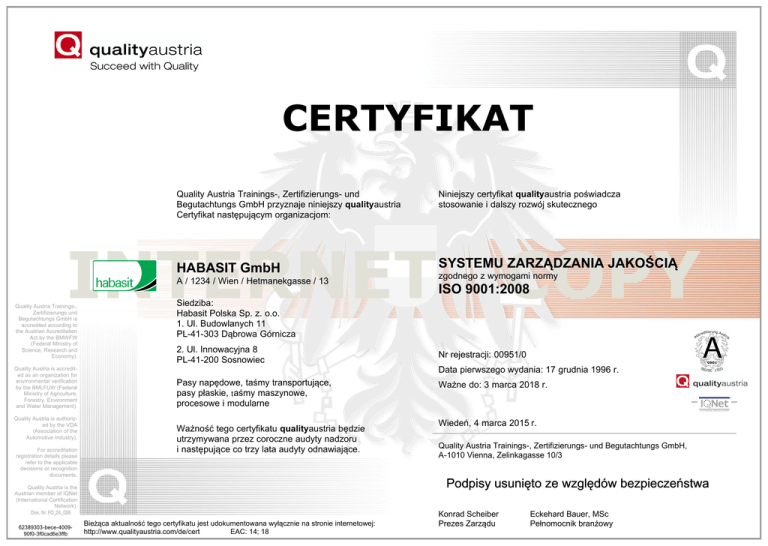 CERTYFIKAT Quality Austria Trainings-, Zertifizierungs- und Begutachtungs GmbH przyznaje niniejszy qualityaustria Certyfikat następującym organizacjom: INTERNET HABASIT GmbH A / 1234 / Wien / Hetmanekgasse / 13 Quality Austria Trainings-, Zertifizierungs und Begutachtungs GmbH is accredited according to the Austrian Accreditation Act by the BMWFW (Federal Ministry of Science, Research and Economy). Quality Austria is accredited as an organization for environmental verification by the BMLFUW (Federal Ministry of Agriculture, Forestry, Environment and Water Management). Quality Austria is authorized by the VDA (Association of the Automotive Industry). For accreditation registration details please refer to the applicable decisions or recognition documents. COPY SYSTEMU ZARZĄDZANIA JAKOŚCIĄ zgodnego z wymogami normy ISO 9001:2008 Siedziba: Habasit Polska Sp. z. o.o. 1. Ul. Budowlanych 11 PL-41-303 Dąbrowa Górnicza 2. Ul. Innowacyjna 8 PL-41-200 Sosnowiec Pasy napędowe, taśmy transportujące, pasy płaskie, taśmy maszynowe, procesowe i modularne Ważność tego certyfikatu qualityaustria będzie utrzymywana przez coroczne audyty nadzoru i następujące co trzy lata audyty odnawiające. Nr rejestracji: 00951/0 Data pierwszego wydania: 17 grudnia 1996 r. Ważne do: 3 marca 2018 r. Wiedeń, 4 marca 2015 r. Quality Austria Trainings-, Zertifizierungs- und Begutachtungs GmbH, A-1010 Vienna, Zelinkagasse 10/3 Podpisy usunięto ze względów bezpieczeństwa Quality Austria is the Austrian member of IQNet (International Certification Network). 62389303-bece-400990f0-3f0cad6e3ffb Niniejszy certyfikat qualityaustria poświadcza stosowanie i dalszy rozwój skutecznego Bieżąca aktualność tego certyfikatu jest udokumentowana wyłącznie na stronie internetowej: http://www.qualityaustria.com/de/cert EAC: 14; 18 Konrad Scheiber Prezes Zarządu Eckehard Bauer, MSc Pełnomocnik branżowy