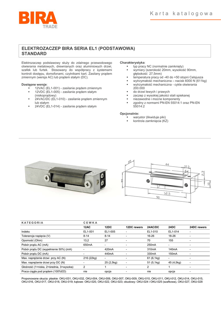 Karta katalogowa ELEKTROZACZEP BIRA SERIA EL1 (PODSTAWOWA) STANDARD Elektrozaczep podstawowy służy do zdalnego przewodowego otwierania metalowych, drewnianych oraz aluminiowych drzwi, szafek lub furtek. Stosowany do współpracy z systemami kontroli dostępu, domofonami, czytnikami kart. Zasilany prądem zmiennym (wersja AC) lub prądem stałym (DC). Dostępne wersje: 12VAC (EL1-001) - zasilanie prądem zmiennym 12VDC (EL1-005) - zasilanie prądem stałym (niskoprądowy) 24VAC/DC (EL1-010) - zasilanie prądem zmiennym lub stałym 24VDC (EL1-014) - zasilanie prądem stałym Charakterystyka: typ pracy NC (normalnie zamknięty) wymiary (szerokość 20mm, wysokość 90mm, głębokość 27,5mm) temperatura pracy od -40 do +50 stopni Celsjusza wytrzymałość mechaniczna – nacisk 6000 N (611kg) wytrzymałość mechaniczna - cykle otwierania 200.000 do drzwi lewych i prawych zaczep z wysokiej jakości stali spiekanej niezawodne i mocne komponenty zgodny z normami PN-EN 55014:1 oraz PN-EN 55014:2 Opcjonalnie: warystor (likwiduje piki) kontrola zamknięcia (KZ) KATEGORIA CEWKA 12AC 12DC 12DC rewers 24AC/DC 24DC 24DC rewers Indeks EL1-001 EL1-005 - EL1-010 EL1-014 - Tolerancja napięcia (V) 8-14 8-14 - 16-26 18-26 - Oporność (Ohm) 13,2 27 - 70 155 - Pobór prądu AC (mA) 650mA - - 250mA - - Pobór prądu DC (wypełnienie 50%) (mA) - 420mA - 310mA 140mA - Pobór prądu DC (mA) - 440mA - 330mA 150mA - Max. naprężenie drzwi przy AC (N) 216 (22kg) - - 61 (6,1kg) - - Max. naprężenie drzwi przy DC (N) - 25 (2,5kg) - 51 (5,1kg) 45 (4,5kg) - Głośność (1=niska, 2=średnia, 3=wysoka) 2 1 - 2 1 - Praca ciągła pod prądem (100%ED) nie opcja - nie opcja - Proponowane okucia: płaskie: OKU-031, OKU-032, OKU-004, OKU-006, OKU-007, OKU-009, OKU-010, OKU-011, OKU-012, OKU-014, OKU-015, OKU-016, OKU-017, OKU-018, OKU-019; kątowe: OKU-020, OKU-022, OKU-023; obudowy: OKU-024 i OKU-025 (szafkowa), OKU-027, OKU-028