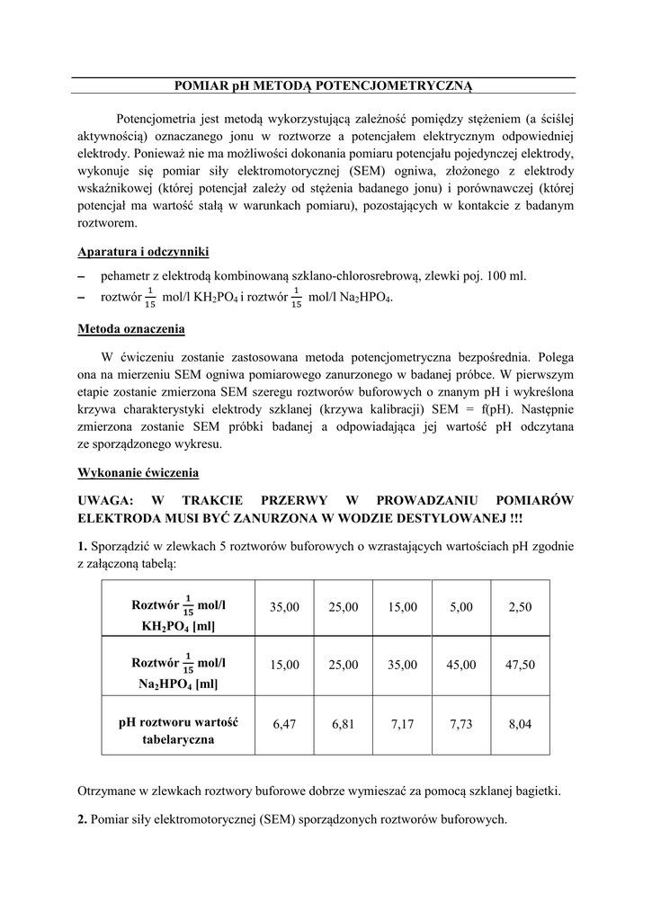 POMIAR pH METODĄ POTENCJOMETRYCZNĄ Potencjometria jest metodą wykorzystującą zależność pomiędzy stężeniem (a ściślej aktywnością) oznaczanego jonu w roztworze a potencjałem elektrycznym odpowiedniej elektrody. Ponieważ nie ma możliwości dokonania pomiaru potencjału pojedynczej elektrody, wykonuje się pomiar siły elektromotorycznej (SEM) ogniwa, złożonego z elektrody wskaźnikowej (której potencjał zależy od stężenia badanego jonu) i porównawczej (której potencjał ma wartość stałą w warunkach pomiaru), pozostających w kontakcie z badanym roztworem. Aparatura i odczynniki − pehametr z elektrodą kombinowaną szklano-chlorosrebrową, zlewki poj. 100 ml. − roztwór 15 mol/l KH2PO4 i roztwór 15 mol/l Na2HPO4. 1 1 Metoda oznaczenia W ćwiczeniu zostanie zastosowana metoda potencjometryczna bezpośrednia. Polega ona na mierzeniu SEM ogniwa pomiarowego zanurzonego w badanej próbce. W pierwszym etapie zostanie zmierzona SEM szeregu roztworów buforowych o znanym pH i wykreślona krzywa charakterystyki elektrody szklanej (krzywa kalibracji) SEM = f(pH). Następnie zmierzona zostanie SEM próbki badanej a odpowiadająca jej wartość pH odczytana ze sporządzonego wykresu. Wykonanie ćwiczenia UWAGA: W TRAKCIE PRZERWY W PROWADZANIU POMIARÓW ELEKTRODA MUSI BYĆ ZANURZONA W WODZIE DESTYLOWANEJ !!! 1. Sporządzić w zlewkach 5 roztworów buforowych o wzrastających wartościach pH zgodnie z załączoną tabelą: 𝟏 35,00 25,00 15,00 5,00 2,50 Roztwór 𝟏𝟏 mol/l 𝟏 15,00 25,00 35,00 45,00 47,50 pH roztworu wartość tabelaryczna 6,47 6,81 7,17 7,73 8,04 Roztwór 𝟏𝟏 mol/l KH2PO4 [ml] Na2HPO4 [ml] Otrzymane w zlewkach roztwory buforowe dobrze wymieszać za pomocą szklanej bagietki. 2. Pomiar siły elektromotorycznej (SEM) sporządzonych roztworów buforowych. Ogniwo pomiarowe przemyte, za każdym razem, dokładnie 2-3 razy wodą destylowaną i delikatnie osuszone ręcznikiem papierowym, zanurzać kolejno w zlewkach z roztworami buforowymi zaczynając od roztworu o najniższym pH (6,47) i dokonać odczytu SEM. Wyniki zapisać w Tabeli. 3. Pomiar SEM próbki badanej. Analogicznie jak powyżej dokonać pomiaru SEM otrzymanej próbki badanej. Wynik zapisać w tabeli wyników. 4. Sporządzenie charakterystyki elektrody pomiarowej – wykres kalibracji. Na papierze milimetrowym wykreślić wykres zależności wartości SEM dla roztworów buforowych (oś rzędnych) w funkcji ich pH (oś odciętych) (SEM=f(pH)). 5. Z krzywej kalibracyjnej odczytać wartość pH odpowiadającą zmierzonej wartości SEM badanej próbki. 6. Pehametr skalibrować na bufory wzorcowe o pH 4 i 9 zgodnie z dołączoną do aparatu instrukcją. Po skalibrowaniu aparatu zmierzyć wartość pH badanej próbki i wpisać do tabelki wyników.