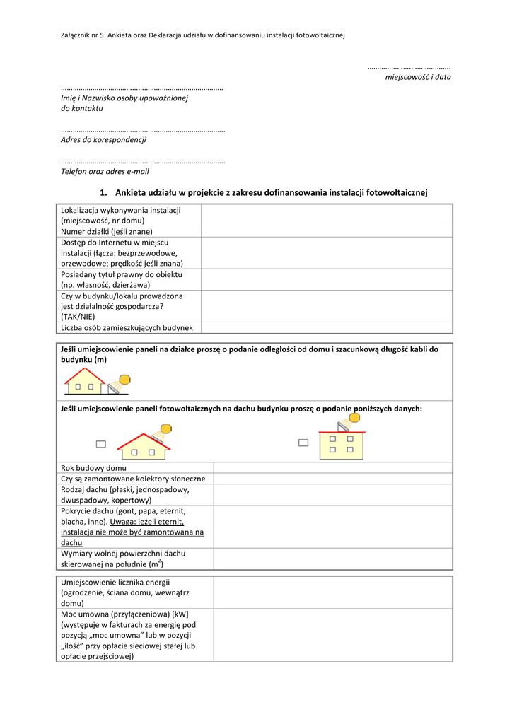 Załącznik nr 5. Ankieta oraz Deklaracja udziału w dofinansowaniu instalacji fotowoltaicznej ………………….……………….. miejscowość i data …………………………………………………………………….… Imię i Nazwisko osoby upoważnionej do kontaktu ……………………………………………………………………….. Adres do korespondencji ……………………………………………………………………….. Telefon oraz adres e-mail 1. Ankieta udziału w projekcie z zakresu dofinansowania instalacji fotowoltaicznej Lokalizacja wykonywania instalacji (miejscowość, nr domu) Numer działki (jeśli znane) Dostęp do Internetu w miejscu instalacji (łącza: bezprzewodowe, przewodowe; prędkość jeśli znana) Posiadany tytuł prawny do obiektu (np. własność, dzierżawa) Czy w budynku/lokalu prowadzona jest działalność gospodarcza? (TAK/NIE) Liczba osób zamieszkujących budynek Jeśli umiejscowienie paneli na działce proszę o podanie odległości od domu i szacunkową długość kabli do budynku (m) Jeśli umiejscowienie paneli fotowoltaicznych na dachu budynku proszę o podanie poniższych danych: Rok budowy domu Czy są zamontowane kolektory słoneczne Rodzaj dachu (płaski, jednospadowy, dwuspadowy, kopertowy) Pokrycie dachu (gont, papa, eternit, blacha, inne). Uwaga: jeżeli eternit, instalacja nie może być zamontowana na dachu Wymiary wolnej powierzchni dachu 2 skierowanej na południe (m ) Umiejscowienie licznika energii (ogrodzenie, ściana domu, wewnątrz domu) Moc umowna (przyłączeniowa) [kW] (występuje w fakturach za energię pod pozycją „moc umowna” lub w pozycji „ilość” przy opłacie sieciowej stałej lub opłacie przejściowej) Załącznik nr 5. Ankieta oraz Deklaracja udziału w dofinansowaniu instalacji fotowoltaicznej Roczne zużycie energii elektrycznej (kWh) Zabezpieczenia przedlicznikowe [A] Instalacja jednofazowa czy trójfazowa? Instalacja wewnętrzna (dwuprzewodowa czy trójprzewodowa) ? Ochrona przepięciowa, zabezpieczenia (uziemienie, zerowanie) Instalacja odgromowa (TAK/NIE) Preferowana trasa prowadzenia przewodów zasilających (połączenie paneli z inwerterem - po elewacji, wewnątrz budynku, kanał wentylacyjny) Szacunkowa długość przewodów służących połączeniu zestawu paneli z pozostałą częścią instalacji (m) Wykaz energochłonnych urządzeń elektrycznych w gospodarstwie domowym stale pobierających energię elektryczną w czasie dnia Urządzenie: Moc kW lub szt. Lodówka Zamrażalka Pralka Zmywarka Kuchenka elektryczna Silniki Bojler elektryczny Żarówki Grzejniki elektryczne Inne Załącznik nr 5. Ankieta oraz Deklaracja udziału w dofinansowaniu instalacji fotowoltaicznej 2. Deklaracja udziału w projekcie z zakresu dofinansowania instalacji fotowoltaicznej Ja niżej podpisany ……………………………..……………………….. deklaruję uczestnictwo w projekcie dofinansowania instalacji fotowoltaicznej planowanym do realizacji przez Gminę Szastarka w ramach Regionalnego Programu Operacyjnego Województwa Lubelskiego na lata 2014 - 2020. 1. Uprzedzony o odpowiedzialności karnej wynikającej z art. 272 Kodeksu Karnego za złożenie nieprawdziwego 1 oświadczenia lub zatajenie prawdy niniejszym oświadczam, że jestem właścicielem / współwłaścicielem nieruchomości położonej w …………….……..……..………… (miejscowość) nr działki: ……………..…… obręb: ……….………... dla której prowadzona jest Księga Wieczysta nr: ………………………….….... w Sądzie Rejonowym w…………………………………………. 2. Przekazuję prawo dysponowania niezbędną częścią ww. nieruchomości Gminie Szastraka dla celów uczestnictwa w projekcie dofinansowania instalacji fotowoltaicznej. Powyższe prawo przekazywane jest na czas określony od dnia niniejszego oświadczenia na okres co najmniej 10 lat po zakończeniu realizacji projektu (wielkość przekazywanej nieruchomości będzie zależna od niezbędnych wielkości budynków i ewentualnej odległości gruntu potrzebnego do montażu instalacji). 3. Wyrażam zgodę na umieszczenie i utrzymywanie na powyższej nieruchomości, przez okres co najmniej 5 lat po zakończeniu realizacji projektu, zamontowanej instalacji oraz umieszczonego oznaczenia (ologowania) lub tablicy pamiątkowej o sfinansowaniu projektu ze środków Europejskiego Funduszu Rozwoju Regionalnego w ramach Regionalnego Programu Operacyjnego Województwa Lubelskiego na lata 2014 – 2020 4. Liczba osób zamieszkałych w budynku mieszkalnym wynosi: ……………. i jest zgodna z Deklaracją o wysokości opłaty za gospodarowania odpadami komunalnymi. 5. W budynku, korzystającym z instalacji fotowoltaicznej nie jest prowadzona działalność gospodarcza, obiekty na których miałaby być zamontowana instalacja nie są związane z prowadzeniem działalności rolniczej. 6. Przyjmuję do wiadomości, iż szacowany koszt urządzenia (urządzenie, montaż i przygotowanie dokumentacji technicznej) to około 22 000 złotych brutto. Zestaw fotowoltaiczny wykorzystywany będzie w budynku mieszkalnego. Deklaruję przystąpienie do programu i pokryję do 35% kosztów kwalifikowanych. 7. Przyjmuję do wiadomości, iż realizacja operacji może pociągać za sobą dodatkowe koszty niekwalifikowane związane z niestandardowymi warunkami (np. nietypowe wpięcia do istniejącej instalacji co zwiększy zużycie materiału lub konieczność dokonania modernizacji istniejących instalacji), które w całości poniosę 8. Udostępnię nieruchomość przedstawicielom Gminy Szastarka oraz wykonawcom dla celów projektowych, montażu instalacji i eksploatacji urządzeń objętych projektem. 9. Upoważniam gminę Szastarka do reprezentowania mnie przed wszystkimi organami administracji publicznej w trakcie procedur formalno-prawnych związanych z inwestycją objętą projektem. 1 Niewłaściw