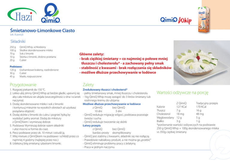 Śmietanowo-Limonkowe Ciasto (ok. 8 porcji) Składniki 250 g 100 g 70 g 10 g 20 g QimiQ Whip, schłodzony Słodkie skondensowane mleko Sok z limonki Skórka z limonki, drobno przetarta Cukier Podstawa: 120 g Grahamkowe krakersy, rozdrobnione 30 g Cukier 45 g Masło, rozpuszczone Główne zalety: - brak ciężkiej śmietany = co najmniej o połowe mniej tłuszczu i cholesterolu* - a zachowany pełny smak - stabilność z kwasami - brak rozłączania się składników - możliwe dłuższe przechowywanie w lodówce Przygotowanie Zalety 1.Rozgrzej piekarnik do 150 °C. 2.Lekko ubij zimny QimiQ Whip aż bedzie gładki, upewnij się aby cała mikstura sie ubijała (wszczególności z dna i scianek naczynia). 3.Dodaj skondensowane mleko i sok z limonki i kontynuuj miesznie na wysokich obrotach aż uzyskasz pożądana objętość. 4.Dodaj skórke z limonki do cukru i pognieć łyżką by wydobyć pełny aromat. Dodaj do mikstury z QimiQ‘kiem i wymieszaj dobrze. 5.Podstawa: Wymieszaj dobrze razem składniki i ułoż mocno w formie do ciast. 6.Piecz podstawe przez ok. 10 minut i ostudź ją. 7.Wlej mixture z QimiQkiem na podstawe i schłódź przez co najmniej 4 godziny (najlepiej przez noc.) 8.Udekoruj bitą smietaną i plastrami limonki. Zredukowany tłuszcz i cholesterol* - pełny śmietanowy smak, mniej tłuszczu i cholesterolu - 1kg QimiQ Whip mozę zastąpić do 3 litrów śmietany lub roslinnego kremu do ubijania Możliwe dłuższe przechowywanie w lodówce z QimiQ bez QimiQ 10 dni 3 dni - QimiQ redukuje migrację wilgoci, podstawa pozostaje świeża i sucha - QimiQ redukuje tworzenie się skórki Łatwy przepis z QimiQ bez QimiQ bardzo prosty skomplikowany - QimiQ jest stabliny z kwasami, składniki się nie rozłączą - Prawdziwie nabiałowy produkt, a nie można go „przebić“ - QimiQ eliminuje problemy pracy z żelatyną - Praca w jednym naczyniu Wartości odżywcze na porcję Z QimiQ Tradycyjny przepis Kalorie 127 KCal 170 KCal Tłuszcz 7 g 16 g Cholesterol 18 mg 48 mg Węglowodany 12 g 5g Białko 3 g 1g *porównanie wartości odżywczych na podstawie: 250 g QimiQ Whip + 100g skondensowanego mleka vs 350g ciężkiej śmietany