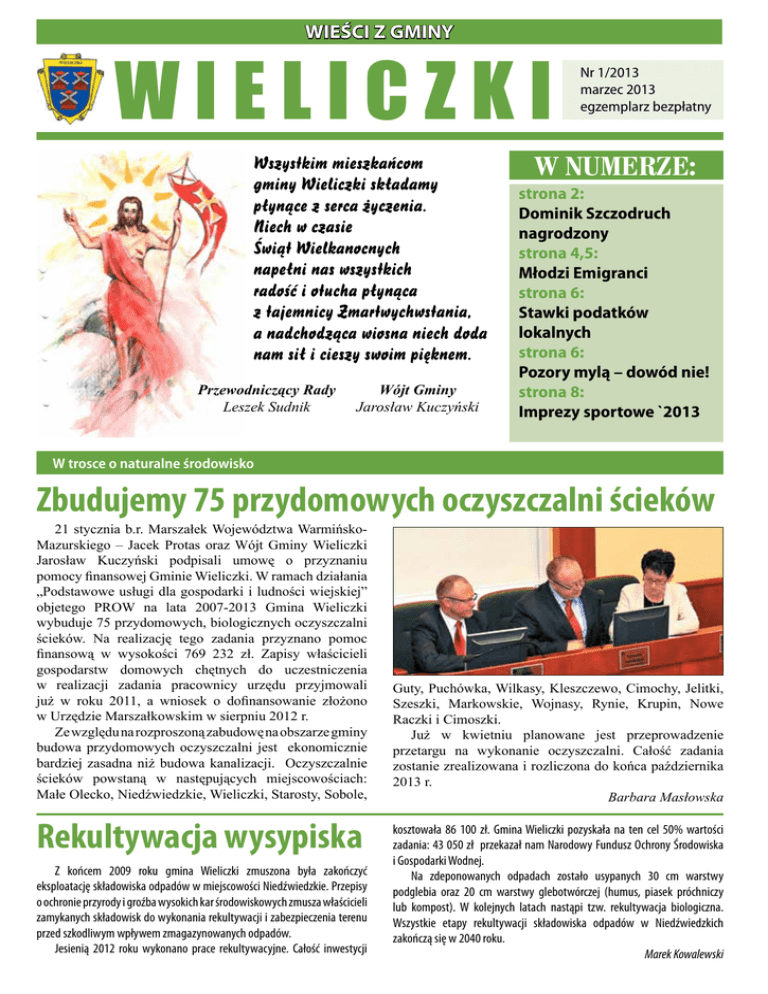 WIEŚCI Z GMINY WIELICZKi Wszystkim mieszkańcom gminy Wieliczki składamy płynące z serca życzenia. Niech w czasie Świąt Wielkanocnych napełni nas wszystkich radość i otucha płynąca z tajemnicy Zmartwychwstania, a nadchodząca wiosna niech doda nam sił i cieszy swoim pięknem. Przewodniczący Rady Leszek Sudnik Wójt Gminy Jarosław Kuczyński Nr 1/2013 marzec 2013 egzemplarz bezpłatny W NUMERZE: strona 2: Dominik Szczodruch nagrodzony strona 4,5: Młodzi Emigranci strona 6: Stawki podatków lokalnych strona 6: Pozory mylą – dowód nie! strona 8: Imprezy sportowe `2013 W trosce o naturalne środowisko Zbudujemy 75 przydomowych oczyszczalni ścieków 21 stycznia b.r. Marszałek Województwa WarmińskoMazurskiego – Jacek Protas oraz Wójt Gminy Wieliczki Jarosław Kuczyński podpisali umowę o przyznaniu pomocy finansowej Gminie Wieliczki. W ramach działania „Podstawowe usługi dla gospodarki i ludności wiejskiej” objetego PROW na lata 2007-2013 Gmina Wieliczki wybuduje 75 przydomowych, biologicznych oczyszczalni ścieków. Na realizację tego zadania przyznano pomoc finansową w wysokości 769 232 zł. Zapisy właścicieli gospodarstw domowych chętnych do uczestniczenia w realizacji zadania pracownicy urzędu przyjmowali już w roku 2011, a wniosek o dofinansowanie złożono w Urzędzie Marszałkowskim w sierpniu 2012 r. Ze względu na rozproszoną zabudowę na obszarze gminy budowa przydomowych oczyszczalni jest ekonomicznie bardziej zasadna niż budowa kanalizacji. Oczyszczalnie ścieków powstaną w następujących miejscowościach: Małe Olecko, Niedźwiedzkie, Wieliczki, Starosty, Sobole, Rekultywacja wysypiska Z końcem 2009 roku gmina Wieliczki zmuszona była zakończyć eksploatację składowiska odpadów w miejscowości Niedźwiedzkie. Przepisy o ochronie przyrody i groźba wysokich kar środowiskowych zmusza właścicieli zamykanych składowisk do wykonania rekultywacji i zabezpieczenia terenu przed szkodliwym wpływem zmagazynowanych odpadów. Jesienią 2012 roku wykonano prace rekultywacyjne. Całość inwestycji Guty, Puchówka, Wilkasy, Kleszczewo, Cimochy, Jelitki, Szeszki, Markowskie, Wojnasy, Rynie, Krupin, Nowe Raczki i Cimoszki. Już w kwietniu planowane jest przeprowadzenie przetargu na wykonanie oczyszczalni. Całość zadania zostanie zrealizowana i rozliczona do końca października 2013 r. Barbara Masłowska kosztowała 86 100 zł. Gmina Wieliczki pozyskała na ten cel 50% wartości zadania: 43 050 zł przekazał nam Narodowy Fundusz Ochrony Środowiska i Gospodarki Wodnej. Na zdeponowanych odpadach zostało usypanych 30 cm warstwy podglebia oraz 20 cm warstwy glebotwórczej (humus, piasek próchniczy lub kompost). W kolejnych latach nastąpi tzw. rekultywacja biologiczna. Wszystkie etapy rekultywacji składowiska odpadów w Niedźwiedzkich zakończą się w 2040 roku. Marek Kowalewski WIEŚCI Z GMINY WIELICZKI władze gminy dziękują za rozsławianie Wieliczek Dominik Szczodruch nagrodzony na sesji Podczas obrad Sesji Rady Gminy Wieliczki w dniu 28 grudnia 2012r. Wójt Gminy Jarosław Kuczyński wyróżnił Dominika Szczodrucha z Cimoch w uznaniu jego znaczących osiągnięć sportowych w kick-boxingu, wręczając mu pamiątkowy puchar oraz album. Dominik Szczodruch swoją przygodę ze sportami walki rozpoczął w wieku 10-ciu lat. Zawsze chciał trenować kickboxing, ale w tym czasie nie było w okolicy sekcji, w której można byłoby uprawiać tę dyscyplinę sportu, dlatego też swoje pierwsze treningi zaczynał od karate kyokuschin. W chwili obecnej trenerem Dominika jest jego starszy brat Łukasz, również pasjonat tej dyscypliny sportu. Na obozy oraz zgrupowania wyjeżdżają do pierwszego mistrza świata w historii polskiego kick-bokxingu – Piotra Siegoczyńskiego, który jest trenerem kadry narodowej oraz trenerem najlepszego klubu kick-boxingu w Polsce. Na co dzień Dominik trenuje w klubie Panzer w Suwałkach. Jest to młody klub, ale mający na swoim koncie bardzo duże sukcesy. Na trzy tygodnie przed zawodami Dominik trenuje dwa razy dziennie, rano i wieczorem po 1,5 godziny od poniedziałku do soboty; niedziela jest dniem odpoczynku i regeneracji. Poza okresem przygotowawczym do zawodów trenuje raz dziennie. Specjalną dietę stosuje na miesiąc przed zawodami, na co dzień w jego diecie obfitują warzywa, drób, ryby. Oprócz kick-boxingu lubi jeździć na nartach, zarówno zimowych jak i wodnych. Najważniejsze sukcesy Dominika to: – brązowy medal w Pucharze Polski 2011r.; – brązowy medal na Międzynarodowych Mistrzostwach Polski w 2012r.; – srebrny medal w lidze kick-boxingu w 2012r.; – złoty medal na Międzynarodowych Otwartych Mistrzostwach Mazowsza 2012r. Zapytany, jak odebrał uhonorowanie go przez Wójta Gminy Wieliczki, stwierdził, że jest to bardzo miły gest ze strony Pana Wójta. Dominik dziękuje Wójtowi za docenienie jego trudu i poświęcenia, jaki codziennie wkłada w treningi oraz udział w zawodach. Największym marzeniem Dominika Szczodrucha jest to, by stanąć na podium Mistrzostw Europy w kick-boxingu. Gratulujemy Dominikowi osiągnięcia tak wysokich wyników sportowych, życzymy dalszych sukcesów i spełnienia marzeń. Barbara Masłowska Cimochy Nowy właściciel zagrodził drogę sąsiadom Tomasz J. – mieszkaniec wsi Cimochy, zakupił w tejże miejscowości działkę z myślą o przyszłej budowie domu. Na podstawie map geodezyjnych ustalił, że przez róg jego działki mieszkańcy ulicy Krótkiej dojeżdżają do drogi głównej. Licząc na łatwy zarobek zażądał od gminy wysokich opłat miesięcznych za udostępnienie wjazdu. Gdy spotkał się z odmową zaorał wjazd i wstawił słupy (skąd my to znamy?), uniemożliwiając mieszkańcom ulicy Krótkiej wjazd od strony drogi wojewódzkiej. Gmina Wieliczki wykona nowy wjazd, gdy tylko ziemia odmarźnie, gdyż konieczne jest wykonanie robót ziemnych z ułożeniem przepustu. Do tego czasu mieszkańcy ulicy Krótkiej muszą doj