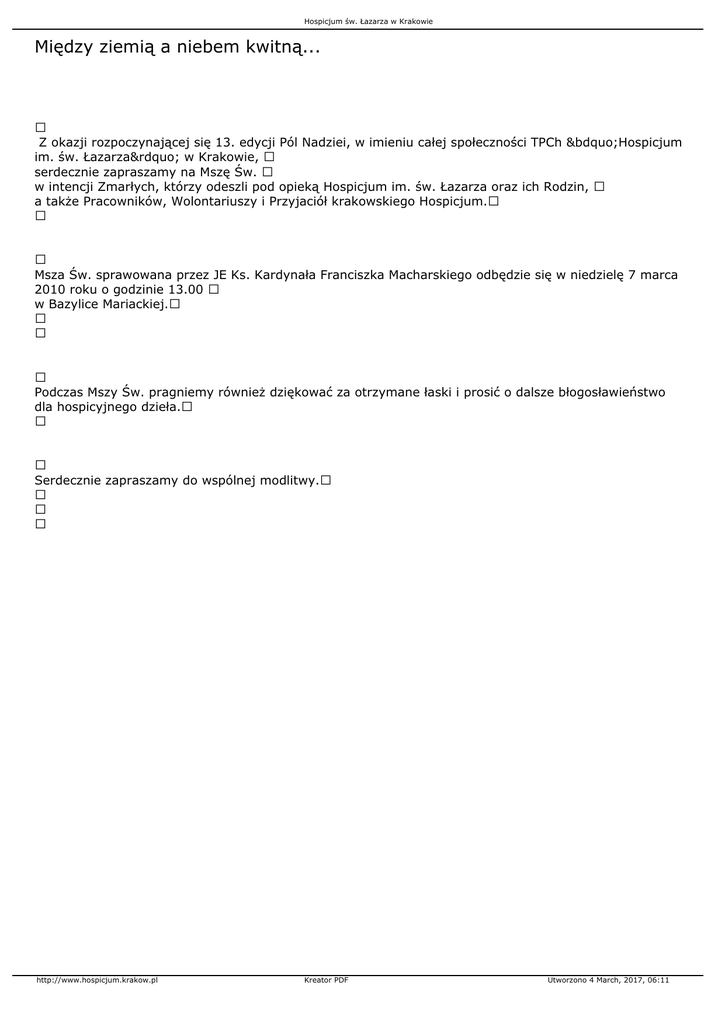 Hospicjum św. Łazarza w Krakowie Między ziemią a niebem kwitną... Z okazji rozpoczynającej się 13. edycji Pól Nadziei, w imieniu całej społeczności TPCh „Hospicjum im. św. Łazarza” w Krakowie, serdecznie zapraszamy na Mszę Św. w intencji Zmarłych, którzy odeszli pod opieką Hospicjum im. św. Łazarza oraz ich Rodzin, a także Pracowników, Wolontariuszy i Przyjaciół krakowskiego Hospicjum. Msza Św. sprawowana przez JE Ks. Kardynała Franciszka Macharskiego odbędzie się w niedzielę 7 marca 2010 roku o godzinie 13.00 w Bazylice Mariackiej. Podczas Mszy Św. pragniemy również dziękować za otrzymane łaski i prosić o dalsze błogosławieństwo dla hospicyjnego dzieła. Serdecznie zapraszamy do wspólnej modlitwy. http://www.hospicjum.krakow.pl Kreator PDF Utworzono 4 March, 2017, 06:11