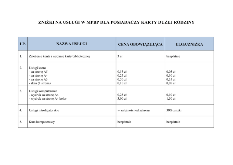 ZNIŻKI NA USŁUGI W MPBP DLA POSIADACZY KARTY DUŻEJ RODZINY NAZWA USŁUGI LP. CENA OBOWIĄZUJĄCA ULGA/ZNIŻKA 1. Założenie konta i wydanie karty bibliotecznej 3 zł bezpłatnie 2. Usługi ksero - za stronę A5 - za stronę A4 - za stronę A3 - skan (1 strona) 0,15 zł 0,25 zł 0,50 zł 0,10 zł 0,05 zł 0,10 zł 0,35 zł 0,05 zł Usługi komputerowe - wydruk za stronę A4 - wydruk za stronę A4 kolor 0,25 zł 3,00 zł 0,10 zł 1,50 zł 4. Usługi introligatorskie w zależności od zakresu 30% zniżki 5. Kurs komputerowy bezpłatnie bezpłatnie 3.