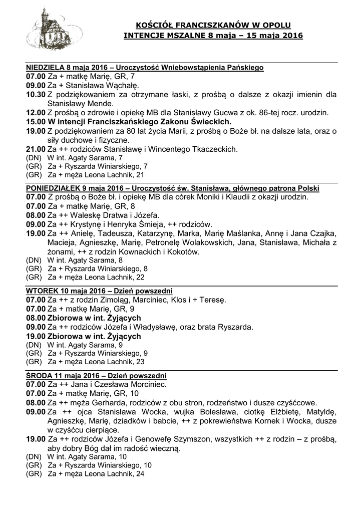 KOŚCIÓŁ FRANCISZKANÓW W OPOLU INTENCJE MSZALNE 8 maja – 15 maja 2016 NIEDZIELA 8 maja 2016 – Uroczystość Wniebowstąpienia Pańskiego 07.00 Za + matkę Marię, GR, 7 09.00 Za + Stanisława Wąchałę. 10.30 Z podziękowaniem za otrzymane łaski, z prośbą o dalsze z okazji imienin dla Stanisławy Mende. 12.00 Z prośbą o zdrowie i opiekę MB dla Stanisławy Gucwa z ok. 86-tej rocz. urodzin. 15.00 W intencji Franciszkańskiego Zakonu Świeckich. 19.00 Z podziękowaniem za 80 lat życia Marii, z prośbą o Boże bł. na dalsze lata, oraz o siły duchowe i fizyczne. 21.00 Za ++ rodziców Stanisławę i Wincentego Tkaczeckich. (DN) W int. Agaty Sarama, 7 (GR) Za + Ryszarda Winiarskiego, 7 (GR) Za + męża Leona Lachnik, 21 PONIEDZIAŁEK 9 maja 2016 – Uroczystość św. Stanisława, głównego patrona Polski 07.00 Z prośbą o Boże bł. i opiekę MB dla córek Moniki i Klaudii z okazji urodzin. 07.00 Za + matkę Marię, GR, 8 08.00 Za ++ Waleskę Dratwa i Józefa. 09.00 Za ++ Krystynę i Henryka Śmieja, ++ rodziców. 19.00 Za ++ Anielę, Tadeusza, Katarzynę, Marka, Marię Maślanka, Annę i Jana Czajka, Macieja, Agnieszkę, Marię, Petronelę Wolakowskich, Jana, Stanisława, Michała z żonami, ++ z rodzin Kownackich i Kokotów. (DN) W int. Agaty Sarama, 8 (GR) Za + Ryszarda Winiarskiego, 8 (GR) Za + męża Leona Lachnik, 22 WTOREK 10 maja 2016 – Dzień powszedni 07.00 Za ++ z rodzin Zimoląg, Marciniec, Klos i + Teresę. 07.00 Za + matkę Marię, GR, 9 08.00 Zbiorowa w int. Żyjących 09.00 Za ++ rodziców Józefa i Władysławę, oraz brata Ryszarda. 19.00 Zbiorowa w int. Żyjących (DN) W int. Agaty Sarama, 9 (GR) Za + Ryszarda Winiarskiego, 9 (GR) Za + męża Leona Lachnik, 23 ŚRODA 11 maja 2016 – Dzień powszedni 07.00 Za ++ Jana i Czesława Morciniec. 07.00 Za + matkę Marię, GR, 10 08.00 Za ++ męża Gerharda, rodziców z obu stron, rodzeństwo i dusze czyśćcowe. 09.00 Za ++ ojca Stanisława Wocka, wujka Bolesława, ciotkę Elżbietę, Matyldę, Agnieszkę, Marię, dziadków i babcie, ++ z pokrewieństwa Kornek i Wocka, dusze w czyśćcu cierpiące. 19.00 Za ++ rodziców Józefa i Genowefę Szymszon, wszystkich ++ z rodzin – z prośbą, aby dobry Bóg dał im radość wieczną. (DN) W int. Agaty Sarama, 10 (GR) Za + Ryszarda Winiarskiego, 10 (GR) Za + męża Leona Lachnik, 24 CZWARTEK 12 maja 2016 – Wspomnienie św. Leopolda Mandicia z Hercegnovi 07.00 Za ++ z rodzin Hallas i Cymerman. 07.00 Za + matkę Marię, GR, 11 08.00 Do Świętych Ran i Krwi Chrystusa w pewnej intencji dla Lucyny. 09.00 Za + Marię Stelmach. 19.00 Za ++ Anielę, Tadeusza, Katarzynę, Marka, Marię Maślanka, Annę i Jana Czajka, Macieja, Agnieszkę, Marię, Petronelę Wolakowskich, Jana, Stanisława, Michała z żonami, ++ z rodzin Kownackich i Kokotów. (DN) W int. Agaty Sarama, 11 (GR) Za + Ryszarda Winiarskiego, 11 (GR) Za + męża Leona Lachnik, 25 PIĄTEK 13 maja 2016 – Dzień powszedni 07.00 Z prośbą o zdrowie, Boże bł. i zgodę w rodzinie dla Sylwii i Bernarda, oraz matki Teresy. 07.00 Za + matkę Marię, GR, 12 08.00 Do Ducha Św. z prośbą o prowadzenie i do Krwi Chrystusa o osłonę dla Lucyny, Krystyny, Filipa i Dominika. 09.00 Zbiorowa za Zmarłych 19.00 W int. Dawida i Mateusza, z prośbą o dobre zakończenie szkoły i zdanie matury, oraz znalezienie praktyki. (DN) W int. Agaty Sarama, 12 (GR) Za + Ryszarda Winiarskiego, 12 (GR) Za + męża Leona Lachnik, 26 SOBOTA 14 maja 2016 – Święto św. Macieja, Apostoła 07.00 W int. o. Macieja z okazji imienin zakonnych. 07.00 Za + matkę Marię, GR, 13 08.00 W int. Alicji i Stefana z prośbą o długie lata życia; w int. Macieja o powrót do zdrowia; w int. Aliny o pomoc w utrzymaniu pracy do emerytury, oraz w int. Aliny o dobrego męża. 09.00 Za ++ ojca Wacława w 10-tą rocz.+, siostrę Marię, Mieczysława i Emilię. 19.00 Za ++ męża Stanisława Dąbrowskiego, dzieci Czesława i Danielę. (DN) W int. Agaty Sarama, 13 (GR) Za + Ryszarda Winiarskiego, 13 (GR) Za + męża Leona Lachnik, 27 NIEDZIELA 15 maja 2016 – Uroczystość Zesłania Ducha Świętego 07.00 Za + matkę Marię, GR, 14 09.00 Z podziękowaniem za otrzymane łaski, z prośbą o zdrowie i Boże bł. dla rodziny Wąchałów. 10.30 W int. Sylwii i Piotra z podziękowaniem za łaski, z prośbą o Boże bł. 12.00 Z podziękowaniem za dar życia i odebrane łaski, z prośbą o Boże bł. opiekę Anioła Stróża i zdrowie dla wnuczka Józefa z ok. 4-tej rocz. urodzin, oraz w int. rodziców i maleńkiej siostrzyczki Tycjany – intencja od dziadków Mazurów. 19.00 Za ++ Czesławę, Adolfa i Ryszarda. 21.00 Z prośbą o zdrowie dla pani Krystyny Lempik. (DN) W int. Agaty Sarama, 14 (GR) Za + Ryszarda Winiarskiego, 14 (GR) Za + męża Leona Lachnik, 28