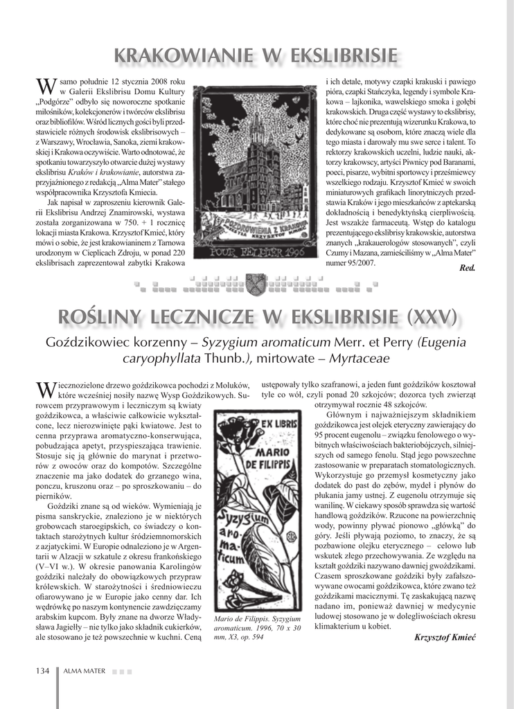 KRAKOWIANIE W EKSLIBRISIE W samo południe 12 stycznia 2008 roku w Galerii Ekslibrisu Domu Kultury „Podgórze” odbyło się noworoczne spotkanie miłośników, kolekcjonerów i twórców ekslibrisu oraz bibliofilów. Wśród licznych gości byli przedstawiciele różnych środowisk ekslibrisowych – z Warszawy, Wrocławia, Sanoka, ziemi krakowskiej i Krakowa oczywiście. Warto odnotować, że spotkaniu towarzyszyło otwarcie dużej wystawy ekslibrisu Kraków i krakowianie, autorstwa zaprzyjaźnionego z redakcją „Alma Mater” stałego współpracownika Krzysztofa Kmiecia. Jak napisał w zaproszeniu kierownik Galerii Ekslibrisu Andrzej Znamirowski, wystawa została zorganizowana w 750. + 1 rocznicę lokacji miasta Krakowa. Krzysztof Kmieć, który mówi o sobie, że jest krakowianinem z Tarnowa urodzonym w Cieplicach Zdroju, w ponad 220 ekslibrisach zaprezentował zabytki Krakowa i ich detale, motywy czapki krakuski i pawiego pióra, czapki Stańczyka, legendy i symbole Krakowa – lajkonika, wawelskiego smoka i gołębi krakowskich. Druga część wystawy to ekslibrisy, które choć nie prezentują wizerunku Krakowa, to dedykowane są osobom, które znaczą wiele dla tego miasta i darowały mu swe serce i talent. To rektorzy krakowskich uczelni, ludzie nauki, aktorzy krakowscy, artyści Piwnicy pod Baranami, poeci, pisarze, wybitni sportowcy i prześmiewcy wszelkiego rodzaju. Krzysztof Kmieć w swoich miniaturowych grafikach linorytniczych przedstawia Kraków i jego mieszkańców z aptekarską dokładnością i benedyktyńską cierpliwością. Jest wszakże farmaceutą. Wstęp do katalogu prezentującego ekslibrisy krakowskie, autorstwa znanych „krakauerologów stosowanych”, czyli Czumy i Mazana, zamieściliśmy w „Alma Mater” numer 95/2007. Red. ROŚLINY LECZNICZE W EKSLIBRISIE (XXV) Goździkowiec korzenny – Syzygium aromaticum Merr. et Perry (Eugenia caryophyllata Thunb.), mirtowate – Myrtaceae iecznozielone drzewo goździkowca pochodzi z Moluków, ustępowały tylko szafranowi, a jeden funt goździków kosztował które wcześniej nosiły nazwę Wysp Goździkowych. Su- tyle co wół, czyli ponad 20 szkojców; dozorca tych zwierząt otrzymywał rocznie 48 szkojców. rowcem przyprawowym i leczniczym są kwiaty Głównym i najważniejszym składnikiem goździkowca, a właściwie całkowicie wykształgoździkowca jest olejek eteryczny zawierający do cone, lecz nierozwinięte pąki kwiatowe. Jest to 95 procent eugenolu – związku fenolowego o wycenna przyprawa aromatyczno-konserwująca, bitnych właściwościach bakteriobójczych, silniejpobudzająca apetyt, przyspieszająca trawienie. szych od samego fenolu. Stąd jego powszechne Stosuje się ją głównie do marynat i przetwozastosowanie w preparatach stomatologicznych. rów z owoców oraz do kompotów. Szczególne Wykorzystuje go przemysł kosmetyczny jako znaczenie ma jako dodatek do grzanego wina, dodatek do past do zębów, mydeł i płynów do ponczu, kruszonu oraz – po sproszkowaniu – do płukania jamy ustnej. Z eugenolu otrzymuje się pierników. wanilinę. W ciekawy sposób sprawdza się wartość Goździki znane są od wieków. Wymieniają je handlową goździków. Rzucone na powierzchnię pisma sanskryckie, znaleziono je w niektórych wody, powinny pływać pionowo „główką” do grobowcach staroegipskich, co świadczy o kongóry. Jeśli pływają poziomo, to znaczy, że są taktach starożytnych kultur śródziemnomorskich pozbawione olejku eterycznego – celowo lub z azjatyckimi. W Europie odnaleziono je w Argenwskutek złego przechowywania. Ze względu na tarii w Alzacji w szkatule z okresu frankońskiego kształt goździki nazywano dawniej gwoździkami. (V–VI w.). W okresie panowania Karolingów Czasem sproszkowane goździki były zafałszogoździki należały do obowiązkowych przypraw wywane owocami goździkowca, które zwano też królewskich. W starożytności i średniowieczu goździkami macicznymi. Tę zaskakującą nazwę ofiarowywano je w Europie jako cenny dar. Ich nadano im, ponieważ dawniej w medycynie wędrówkę po naszym kontynencie zawdzięczamy ludowej stosowano je w dolegliwościach okresu arabskim kupcom. Były znane na dworze Włady- Mario de Filippis. Syzygium klimakterium u kobiet. sława Jagiełły – nie tylko jako składnik cukierków, aromaticum. 1996, 70 x 30 ale stosowano je też powszechnie w kuchni. Ceną mm, X3, op. 594 Krzysztof Kmieć W 134 ALMA MATER