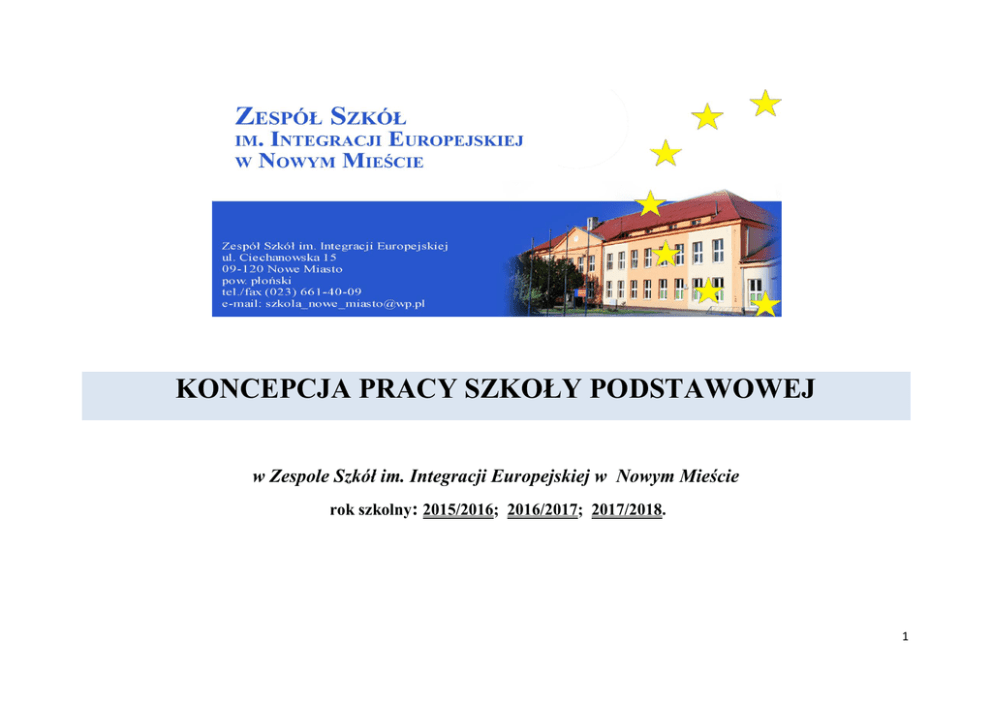 KONCEPCJA PRACY SZKOŁY PODSTAWOWEJ w Zespole Szkół im. Integracji Europejskiej w Nowym Mieście rok szkolny: 2015/2016; 2016/2017; 2017/2018. 1 Podstawa prawna opracowania koncepcji: Konstytucja Rzeczypospolitej Polskiej z 1997r. Ustawa o Systemie Oświaty z 7 września 1991r. (Dz. U. z 2004r. nr 256, poz.2572 ze zm.); Ustawa z dn.26 stycznia 1982r. Karta Nauczyciela (Dz. U. z 2006r. nr 97, poz. 674 ze zm.); Konwencja Praw Dziecka 1989r., weszła w życie w 1991r. (Dz. U. z 1991r., nr120, poz.526); Rozporządzenie MEN z dn. 7 października 2009r. w sprawie nadzoru pedagogicznego( Dz. U. z 2009r. Nr 168 poz.1324ze zm.); Rozporządzenie MEN z dn. 17 listopada 2010r. w sprawie zasad udzielania i organizacji pomocy psychologiczno-pedagogicznej w publicznych przedszkolach, szkołach i placówkach. (Dz. U. z dnia 2 grudnia 2010 r.) ze zmianami; Rozporządzenie MEN z dn. 22 sierpnia 2014r. w sprawie sposobu prowadzenia przez publiczne przedszkola, szkoły i placówki dokumentacji przebiegu nauczania, działalności wychowawczej i opiekuńczej oraz rodzajów taj dokumentacji (Dz. U. z 2014r. poz. 1170) Rozporządzenie MEN z dn. 10 czerwca 2015r. w sprawie szczegółowych warunków i sposobu oceniania, klasyfikowania i promowania uczniów i słuchaczy w szkołach publicznych (Dz. U. z 2015r. poz. 843); Rozporządzenie MEN z dn. 25 czerwca 2015r. w sprawie szczegółowych warunków i sposobu przeprowadzania sprawdzianu, egzaminu gimnazjalnego i egzaminu maturalnego(Dz. U. z 2015r. poz. 959); 2 I. MISJA SZKOŁY Chcemy, aby szkoła była bezpieczna, przyjazna uczniom i otwarta, czyli taka, która nie zamyka się na kulturę, sztukę, sport, środowiska lokalne oraz potrafi korzystać z tego, co ją otacza. Pragniemy, aby uczniowie mieli możliwość współdecydowania o tym, co się dzieje w szkole. Dążymy do wyposażenia uczniów w wiedzę i umiejętności niezbędne do dokonywania wyborów w dalszym życiu. Zależy nam na tym, aby wychowankowie szkoły podstawowej byli przygotowani do kontynuowania nauki w gimnazjum oraz do życia w demokratycznym społeczeństwie. Zakładamy, że wykształcona i doskonaląca się kadra pedagogiczna, zapewni różnorodność i atrakcyjność lekcji oraz bogatą ofertę zajęć pozalekcyjnych. Szczerość, otwartość, tolerancja, sprawiedliwość, kultura słowa, aprobata i przyjaźń to główne wartości, jakimi będziemy się kierować w naszej pracy. Będziemy dążyć do tego, aby nasi wychowankowie byli twórczy, otwarci na rzeczywistość i drugiego człowieka, radzący sobie z nowymi wyzwaniami czasów współczesnych. W pracy wychowawczej szkoły będziemy starali się postępować zgodnie z założeniami Delorsa: 1) Uczyć się, aby żyć wspólnie, 2) Uczyć się, aby wiedzieć, 3) Uczyć się, aby działać, 4) Uczyć się, aby być. 3 Priorytety wspieranie rodziny w procesie wychowania i nauczania przez stwarzanie uczniom optymalnych warunków do prawidłowego, wszechstronnego rozwoju wykształcenie umiejętności uczenia się wyzwolenie inwencji twórczej i pomysłowości. uczeń kreatorem własnej drogi rozwoju. przygotować ucznia do życia w społeczeństwie informacyjnym przez wykorzystanie w procesie nauczania-uczenia się technologii informatycznych: prezentacji multimedialnych, projektów, e-learningu, e-booków. Szkoła Podstawowa w Nowym Mieście realizując funkcję dydaktyczną, wychowawczą i opiekuńczą będzie dążyć do wprowadzenia swych wychowanków w różnorodne dziedziny życia i nauki a także zapewni możliwość atrakcyjnego spędzenia wolnego czasu. II. WIZJA SZKOŁY Nasza szkoła jest przyjazna i bezpieczna, stwarza uczniom warunki do wszechstronnego rozwoju. Jest szkołą wspierającą, angażującą do realizacji swoich zamierzeń rodziców oraz społeczność lokalną. Szkoła dba o wysoki poziom nauczania, wszechstronny rozwój osobowy ucznia oraz promuje zdrowy styl życia. Dąży do stworzenia jak najlepszych warunków lokalowych oraz nowoczesnej bazy dydaktycznej. Kultywuje wartości prorodzinne. Dba o środowisko ekologiczne uczniów, uczy szacunku dla świata roślin i zwierząt. 4 Priorytety Szkoła stwarzająca uczniom szansę wszechstronnego rozwoju oraz nabycia umiejętności kluczowych dla człowieka XXI wieku, które są niezbędne do świadomego i odpowiedzialnego funkcjonowania we współczesnym świecie oraz odnalezienia się na ustawicznie zmieniającym się rynku pracy. Umożliwia uczniowi stawanie się człowiekiem wolnym oraz odpowiedzialnym za siebie i innych. Założenia Szkoła jest: a) otwarta i pomocna – wspomagająca indywidualny rozwój każdego ucznia, dostosowując się do jego potrzeb i możliwości, szczególną troską otaczająca młodzież ze specjalnymi potrzebami edukacyjnymi; Jest kreatorem własnej drogi rozwoju ucznia. Postrzega ucznia jako aktywnego uczestnika procesu uczenia się, a nauczyciela jako profesjonalnego doradcę w procesie samokształcenia. b) przyjazna i partnerska – życzliwa wychowankom, szanująca podmiotowość ucznia; c) bezpieczna – monitorowana; walcząca z używkami, nałogami, agresją, wulgaryzmami i przemocą; wymagająca asertywności; d) wychowująca – kształtująca model wartości wsparty tradycją polskiego dziedzictwa kulturowego. Szkoła ucząca szacunku do drugiego człowieka, środowiska naturalnego oraz do dziedzictwa kulturowego narodu, Europy i świata. 5 e) kompetentna – zatrudniająca kompetentną i wykwalifikowaną kadrę, która profesjonalnie przygotowuje do sprawdzianów kompetencji i sprawdzianów. Kadrę szkoły tworzy zespół nauczycieli nastawionych innowacyjnie, którzy chętnie się dokształcają i doskonalą. Szkoła postrzegana jest w środowisku jako placówka oferująca usługi edukacyjne na wysokim poziomie jakości. f) spełniająca oczekiwania środowiska – współpracująca z rodzicami oraz dbająca o dobrą opinię w środowisku. Współpracuje ze strukturami samorządowymi i innymi organizacjami działają