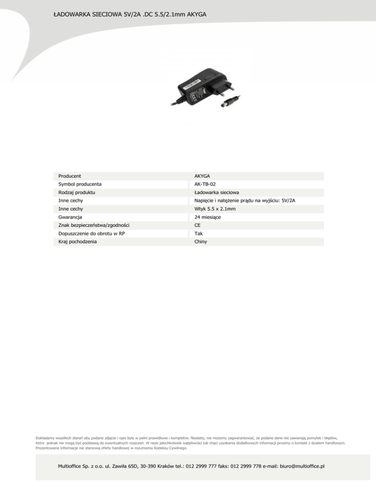 ŁADOWARKA SIECIOWA 5V/2A .DC 5.5/2.1mm AKYGA Producent AKYGA Symbol producenta AK-TB-02 Rodzaj produktu Ładowarka sieciowa Inne cechy Napięcie i natężenie prądu na wyjściu: 5V/2A Inne cechy Wtyk 5.5 x 2.1mm Gwarancja 24 miesiące Znak bezpieczeństwa/zgodności CE Dopuszczenie do obrotu w RP Tak Kraj pochodzenia Chiny Dokładamy wszelkich starań aby podane zdjęcie i opis były w pełni prawidłowe i kompletne. Niestety, nie możemy zagwarantować, że podane dane nie zawierają pomyłek i błędów, które jednak nie mogą być podstawą do ewentualnych roszczeń. W razie jakichkolwiek wątpliwości lub chęci uzyskania dodatkowych informacji prosimy o kontakt z działem handlowym. Prezentowane informacje nie stanowią oferty handlowej w rozumieniu Kodeksu Cywilnego. Multioffice Sp. z o.o. ul. Zawiła 65D, 30-390 Kraków tel.: 012 2999 777 faks: 012 2999 778 e-mail: [email protected]