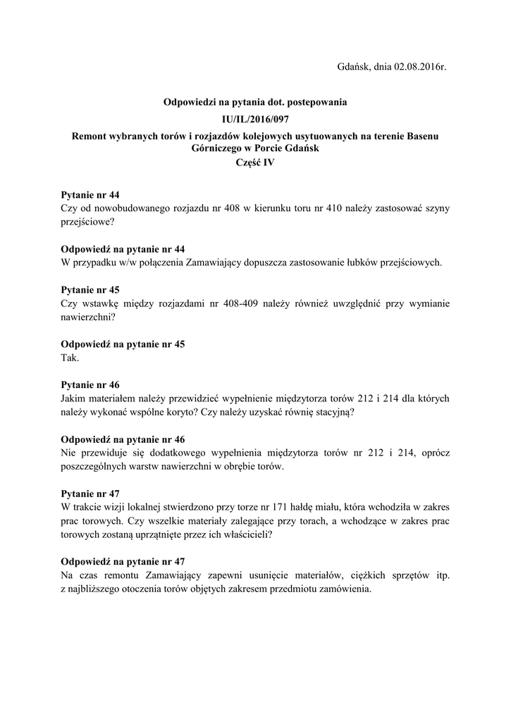 Gdańsk, dnia 02.08.2016r. Odpowiedzi na pytania dot. postepowania IU/IL/2016/097 Remont wybranych torów i rozjazdów kolejowych usytuowanych na terenie Basenu Górniczego w Porcie Gdańsk Część IV Pytanie nr 44 Czy od nowobudowanego rozjazdu nr 408 w kierunku toru nr 410 należy zastosować szyny przejściowe? Odpowiedź na pytanie nr 44 W przypadku w/w połączenia Zamawiający dopuszcza zastosowanie łubków przejściowych. Pytanie nr 45 Czy wstawkę między rozjazdami nr 408-409 należy również uwzględnić przy wymianie nawierzchni? Odpowiedź na pytanie nr 45 Tak. Pytanie nr 46 Jakim materiałem należy przewidzieć wypełnienie międzytorza torów 212 i 214 dla których należy wykonać wspólne koryto? Czy należy uzyskać równię stacyjną? Odpowiedź na pytanie nr 46 Nie przewiduje się dodatkowego wypełnienia międzytorza torów nr 212 i 214, oprócz poszczególnych warstw nawierzchni w obrębie torów. Pytanie nr 47 W trakcie wizji lokalnej stwierdzono przy torze nr 171 hałdę miału, która wchodziła w zakres prac torowych. Czy wszelkie materiały zalegające przy torach, a wchodzące w zakres prac torowych zostaną uprzątnięte przez ich właścicieli? Odpowiedź na pytanie nr 47 Na czas remontu Zamawiający zapewni usunięcie materiałów, ciężkich sprzętów itp. z najbliższego otoczenia torów objętych zakresem przedmiotu zamówienia. Pytanie nr 48 W czasie wizji lokalnej w torze 171 zauważono kolizję w postaci rury o średnicy ok fi250 przeprowadzonej tuż pod szynami. Po czyjej stronie będzie usunięcie kolizji? Czy Zamawiający ma wiedzę na temat innych kolizji? Odpowiedź na pytanie nr 48 Wskazane kolizje kwalifikują się do usunięcia w ramach prac objętych przedmiotem zamówienia. Ewentualny demontaż tych elementów powinien być przeprowadzany pod nadzorem i po uprzednim uzgodnieniu z przedstawicielem Zamawiającego. Zamawiający nie posiada wiedzy na temat innych ewentualnych kolizji. W przypadku ich wykrycia w toku prac, należy postępować jak powyżej. Pytanie nr 49 W czasie wizji lokalnej w torze 98-200-201 zauważono kolizję w postaci elementu żelbetowego przeprowadzonego tuż pod szynami. Po czyjej stronie będzie usunięcie kolizji? Czy Zamawiający ma wiedzę na temat innych kolizji? Odpowiedź na pytanie nr 49 Odpowiedź na to pytanie została zawarta w odpowiedzi na pytanie nr 48. Pytanie nr 50 Czy na czas realizacji prac, Zamawiający udostępni tory odstawcze dla maszyn torowych? Jeśli tak, czy użyczy je nieodpłatnie? Odpowiedź na pytanie nr 50 W razie potrzeby tory odstawcze dla maszyn torowych zostaną udostępnione, jednak warunki ich udostępnienia należy uzgadniać z użytkownikiem torów wskazanym w Opisie Przedmiotu Zamówienia. Pytanie nr 51 Zamawiający w opisie przedmiotu zamówienia podaje, że „w miejscach, gdzie konieczność zastosowania wymuszają przepisy (np. promienie łuków mniejsze od 300m) (…)” należy zabudować podkłady drewniane. Tym czasem przepisy podają, że w promieniach poniżej 250m należy zabudowywać podkłady drewniane. Prosimy o wskazanie od jakich promieni należy zabudowywać podkłady drewniane. Odpowiedź na pytanie nr 51 Podkłady drewniane należy zabudowywać zgodnie z obowiązującymi przepisami, w tym przypadku w łukach o promieniu mniejszym od 250 m. Zapis o promieniu 300 m należy traktować jako omyłkę pisarską. Pytanie nr 52 Czy przy wymianie rozjazdów należy odtworzyć mechaniczne napędy zwrotnicowe z istniejących materiałów, czy też należy wymienić je na nowe? Odpowiedź na pytanie nr 52 Odpowiedź na to pytanie została zawarta w odpowiedzi na pytanie nr 2. Pytanie nr 53 W opisie przedmiotu zamówienia w pkt. 3 OPZ [Zakres przedmiotu zamówienia], Zamawiający wskazał, iż w zakres wykonania koryta, wchodzą prace związane z dogęszczeniem istniejącego podłoża gruntowego do wartości E2 ≥ 60MPa. Jednocześnie w odpowiedzi na pytanie nr 3 z dnia 28.07.2016 r. Zamawiający poinformował, że w przypadku braku możliwości zagęszczenia podłoża gruntowego do wymaganego modułu, wszelkie koszty zostaną uwzględnione w ofercie przez wykonawcę. Powyższe prowadzi do wniosku, że zakres robót składających się na przedmiot zamówienia nie został przez Zamawiającego doprecyzowany, a Wykonawca nie dysponuje wystarczającymi danymi, by dokonać kalkulacji ceny ofertowej (brak przedłożonych przez Zamawiającego badań podłoża gruntowego pod torami), co może prowadzić do nieporównywalności złożonych ofert. Niejednoznaczne określenie przedmiotu zamówienia wprowadza niejednoznaczność do kalkulacji ofert poszczególnych Wykonawców, z jednoczesnym przerzucaniem wszystkich ryzyk na wykonawców, bez możliwości zmiany kwoty kontraktowej oraz czasu na ukończenie. Mając na uwadze obowiązki Zamawiającego, zgodnie z art. 29 ust. 1 i ust. 2 oraz art. 31 ust. 2 Pzp oraz przepisów rozporządzenia Ministra Infrastruktury z dnia 2 września 2004 r. w sprawie szczegółowego zakresu i formy dokumentacji projektowej, specyfikacji technicznej wykonania i odbioru robót budowlanych oraz programu funkcjonalno-użytkowego (Dz.U. 2004 nr 202 poz. 2072 z późn. zm.), oraz z uwagi na niejednoznaczne, niewyczerpujące i nieuwzględniające wszystkich wymagań i okoliczności mogących mieć wpływ na sporządzenie oferty. Wnoszę o możliwość zwiększenia zakresu robót koniecznych do wykonania celem osiągnięcia parametrów oczekiwanych przez Zamawiającego, w przypadku braku osiągnięcia na istniejącym podłożu wymaganego modułu E2. Odpowiedniej zmianie ulegną Wynagrodzenie oraz Czas na Ukończenie. Odpowiedź na pytanie nr 53 Po dodatkowej analizie zagadnienia Zamawiający informuje, że nie przewiduje wystąpienia braku możliwości zagęszczenia podłoża gruntowego do modułu określonego w Opisie Przedmiotu Zamówienia. Pytanie nr 54 Na jakiej długości należy przebudować tor łącznikowy pomiędzy rozjazdami 98 oraz 200/201? Wg za