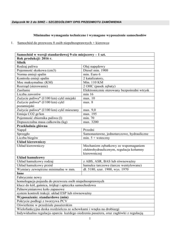 Załącznik Nr 2 do SIWZ – SZCZEGÓŁOWY OPIS PRZEDMIOTU ZAMÓWIENIA Minimalne wymagania techniczne i wymagane wyposażenie samochodów 1. Samochód do przewozu 8 osób niepełnosprawnych + kierowca: Samochód w wersji standardowej 9-cio miejscowy – 1 szt. Rok produkcji: 2016 r. Silnik Rodzaj paliwa Olej napędowy Pojemność skokowa (cm3) Diesel min. 1900 Norma emisji spalin min. Euro 6 Kontrola emisji spalin 2 katalizatory, Moc maksymalna: (KM) Min. 110 KM Rozrząd (sterowanie) 2 OHC (pasek zębaty) Zasilanie Elektronicznie sterowany bezpośredni wtrysk Liczba zaworów min 16 Zużycie paliwa* (l/100 km) cykl miejski max. 10 Zużycie paliwa* (l/100 km) cykl max. 8 pozamiejski Zużycie paliwa* (l/100 km) cykl mieszany max. 9,0 Emisja CO2 gr/km max. 195 Pojemność zbiornika paliwa (l) min. 70 Dopuszczalna masa całkowita (kg) max. 3200 Przekładnia główna Napęd Przedni Sprzęgło Samonastawne, jednotarczowe, hydrauliczne Liczba biegów min. 5 + wsteczny Układ kierowniczy Układ kierowniczy Mechanizm zębatkowy ze wspomaganiem elektrohydraulicznym, regulacja kolumny kierowniczej Układ hamulcowy Układ hamulcowy rodzaj z ABS, ASR, BAS lub równoważny Układ hamulcowy przód hamulce tarczowe (tarcze wentylowane) Wymiary zewnętrzne minimalne w mm. dł. 5180, szer. 1900, wys. 1970 Inne Fabrycznie nowy homologacja pojazdu do przewozu osób niepełnosprawnych klucz do kół, gaśnica, trójkąt i apteczka samochodowa Pełnowymiarowe koło zapasowe system kontroli trakcji: układ ESP lub równoważny Wyposażenie: standardowe (min) Pokrycie podłogi z tworzywa PCV Oświetlenie w przedziale pasażerskim Wielofunkcyjna deska rozdzielcza ze schowkami i wnęka na drobiazgi Indywidualna regulacja oparcia każdego siedzenia pasażera, oraz zagłówki z regulacją 1 wysokości Centralny zamek z pilotem Wspomaganie kierownicy Klimatyzacja manualna z recylkulacją powietrza w kabinie, tylna klimatyzacja z agregatem grzewczym Dysze nawiewu powietrza dla pasażerów tylnych siedzeń Elektrycznie podgrzewana szyba przednia (Quickclear) atermiczna, elektrycznie podnoszone i opuszczane szyby (lewa i prawa) w przedziale kierowcy. Szyby atermiczne, przyciemniane w przedziale pasażerskim. Boczne lusterka regulowane elektrycznie i podgrzewane Regulacja ustawienia świateł Światła przednie halogeny przeciwmgielne i tylna przeciwmgielna, światła doświetlające zakręty, światła do jazdy dziennej Układy bezpieczeństwa HSA, LAC, EBA, EBL, ROM Immobiliser fabryczny + Autoalarm Fotel kierowcy z dodatkową regulacją wysokości i podłokietnikiem Poduszka powietrzna kierowcy i pasażera Przeszklone drzwi boczne przesuwne z lewej i prawej strony samochodu oraz stopnie boczne ułatwiające wejście. Tylne drzwi dwuskrzydłowe przeszklone (180°) z trzecim światłem stop ogrzewane szyby i wycieraczki Tempomat Radio + CD + USB + Bluetooth oraz mikrofon dla kierowcy lub pasażera kompatybilny z nagłośnieniem samochodu, regulacja radia w kierownicy Obrotomierz, komputer pokładowy Podwójny akumulator i system star stop Chlapacze tył i przód, trójkąt ostrzegawczy, gaśnica, dywaniki gumowe Zapewnienie serwisu przez sieć Autoryzowanych Stacji Obsługi Kolor nadwozia alternatywnie lakier: biały/czerwony/niebieski/brązowy Kolumna kierownicza z regulacją Adaptacja samochodu do przewozu osób niepełnosprawnych: Lp. Opis zabudowy 1. W drugim i trzecim rzędzie niezależnie wypinane fotele z regulowanymi oparciami, zagłówkami oraz z trzypunktowymi bezwładnościowymi pasami bezpieczeństwa (z możliwością szybkiego demontażu). 2. Oznakowanie zgodne z przepisami o ruchu drogowym (oklejenie samochodu emblematami informującymi o przewozie osób niepełnosprawnych, ostrzegawcze kierunkowskazy dachowe. 3. Dokumentacja do rejestracji samochodu (badanie techniczne, oświadczenie producenta zabudowy itp.). *) wg z dokumentacji technicznej producenta 2 2. Samochód do przewozu osób niepełnosprawnych na wózku inwalidzkim, który po adaptacji posiadał będzie miejsca do przewozu 7 osób niepełnosprawnych plus wózek inwalidzki – 1 szt. Samochód w wersji standardowej 9-cio miejscowy – 1 szt. Rok produkcji: 2016 r. Silnik Rodzaj paliwa Olej napędowy Pojemność skokowa (cm3) Diesel min. 1900 Norma emisji spalin min. Euro 6 Kontrola emisji spalin 2 katalizatory, Moc maksymalna: (KM) min. 110 KM Rozrząd (sterowanie) 2 OHC (pasek zębaty) Zasilanie Elektronicznie sterowany bezpośredni wtrysk Liczba zaworów min. 16 Zużycie paliwa* (l/100 km) cykl miejski max. 10 Zużycie paliwa* (l/100 km) cykl max. 8 pozamiejski Zużycie paliwa* (l/100 km) cykl mieszany max. 9,0 Emisja CO2 gr/km max. 195 Pojemność zbiornika paliwa (l) min. 70 Dopuszczalna masa całkowita (kg) max. 3200 Przekładnia główna Napęd Przedni Sprzęgło Samonastawne, jednotarczowe, hydrauliczne Liczba biegów Min. 5 + wsteczny Układ kierowniczy Układ kierowniczy Mechanizm zębatkowy ze wspomaganiem elektrohydraulicznym, regulacja kolumny kierowniczej Układ hamulcowy Układ hamulcowy rodzaj z ABS, ASR, BAS lub równoważny Układ hamulcowy przód hamulce tarczowe (tarcze wentylowane) Wymiary zewnętrzne minimalne w mm. Dł. 5180, szer. 1900, wys. 1970 Inne Fabrycznie nowy homologacja pojazdu do przewozu osób niepełnosprawnych klucz do kół, gaśnica, trójkąt i apteczka samochodowa Pełnowymiarowe koło zapasowe system kontroli trakcji: układ ESP lub równoważny Wyposażenie: standardowe (min) Pokrycie podłogi z tworzywa PCV Oświetlenie w przedziale pasażerskim Wielofunkcyjna deska rozdzielcza ze schowkami i wnęka na drobiazgi Indywidualna regulacja oparcia każdego siedzenia pasażera, oraz zagłówki z regulacją wysokości Centralny zamek z pilotem Wspomaganie kierownicy Klimatyzacja manualna z recylkulacją powietrza w kabinie, tylna klimatyzacja z agregatem grzewczym 3 Dysze nawiewu powietrza dla pasażerów tylnych siedzeń Elektrycznie podgrzewana szyba przednia (Quickclear) atermiczna, elektrycznie podnoszone 