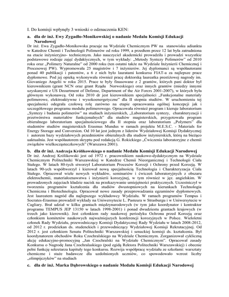 I. Do komisji wpłynęły 3 wnioski o odznaczenia KEN: a. dla dr inż. Ewy Zygadło-Monikowskiej o nadanie Medalu Komisji Edukacji Narodowej Dr inż. Ewa Zygadło-Monikowska pracuje na Wydziale Chemicznym PW na stanowisku adiunkta w Katedrze Chemii i Technologii Polimerów od roku 1999, a przedtem przez 12 lat była zatrudniona na etacie inżynieryjno- technicznym. Jako nauczyciel akademicki prowadziła i prowadzi wszystkie podstawowe rodzaje zajęć dydaktycznych, w tym wykłady: „Metody Syntezy Polimerów” od 2010 roku oraz „Polimery Naturalne” od 2000 roku (ten ostatni także na Wydziale Inżynierii Chemicznej i Procesowej PW). Wypromowała 25 magistrów i 7 inżynierów. Jej dyplomanci są współautorami ponad 40 publikacji i patentów, a 6 z nich było lauratami konkursu FIAT-a za najlepsze prace dyplomowe. Pod jej opieką wykonywała również pracę doktorską laureatka prestiżowej nagrody im. Giovaniego Angelii w roku 2015. Prace te były finasowane z 2 grantów, których pani doktor był kierownikiem (grant NCN oraz grant Rządu Norweskiego) oraz innych grantów (miedzy innymi uzyskanymi z US Deoartment of Defense, Department of the Air Forcrs 2001-2007), w których była głównym wykonawcą. Od roku 2010 dr jest kierownikiem specjalności „Funkcjonalne materiały polimerowe, elektroaktywne i wysokoenergetyczne” dla II stopnia studiów. W uruchomieniu tej specjalności odegrała czołową rolę zarówno na etapie opracowania ogólnej koncepcji jak i szczegółowego programu modułu polimerowego. Opracowała również program i kieruje laboratorium „Syntezy i badania polimerów” na studiach inżynierskich, „Laboratorium syntezy, charakteryzacji i przetwórstwa materiałów funkcjonalnych” dla studiów magisterskich, przygotowała program obieralnego laboratorium specjalnościowego dla II stopnia oraz laboratorium „Polymers” dla studentów studiów magisterskich Erasmus Mundus w ramach projektu M.E.S.C. - Materials for Energy Storage and Conversion. Od 10 lat jest jednym z liderów Wydziałowej Komisji Dydaktycznej i autorem bazy wydziałowych przedmiotów obieralnych dla studiow inżynierskich, którą na bieżąco uaktualnia. Jest współautorem skryptu pod redakcją G. Rokickiego „Ćwiczenia laboratoryjne z chemii związków wielkocząsteczkowych” (Warszawa 2001). b. dla dr inż. Andrzeja Królikowskiego o nadanie Medalu Komisji Edukacji Narodowej Dr inż. Andrzej Królikowski jest od 1972 r. pracownikiem naukowo-dydaktycznym na Wydziale Chemicznym Politechniki Warszawskiej w Katedrze Chemii Nieorganicznej i Technologii Ciała Stałego. W latach 80-tych stworzył Laboratorium Procesów Korozji i Ochrony przed Korozją. W latach 90-ych współtworzył i kierował nową specjalnością Technologia i Charakteryzacja Ciała Stałego. Opracował wiele nowych wykładów, seminariów i ćwiczeń laboratoryjnych z obszaru elektrochemii, materiałoznawstwa i inżynierii korozyjnej, w tym również w jęz. angielskim. W prowadzonych zajęciach kładzie nacisk na przekazywanie umiejętności praktycznych. Uczestniczył w tworzeniu programów kształcenia dla studiów dwustopniowych na kierunkach Technologia Chemiczna i Biotechnologia. Opracował nowe zasady przeprowadzania egzaminów dyplomowych. Jest laureatem nagród dla najlepszego wykładowcy Wydziału. W ramach programów Tempus i Socrates-Erasmus prowadził wykłady na Uniwersytecie L. Pasteura w Strasburgu i w Uniwersytecie w Cagliary. Brał udział w kilku grantach międzynarodowych (w tym jako koordynator i kontraktor programu TEMPUS JEP 13150 w latach 1998-2001) i ponad dwudziestu grantach krajowych (w trzech jako kierownik). Jest członkiem rady naukowej periodyku Ochrona przed Korozją oraz członkiem komitetów naukowych najważniejszych konferencji korozyjnych w Polsce. Wieloletni członek Rady Wydziału, przewodniczący Komisji Dydaktycznej Rady Wydziału w latach 2008-2012, od 2012 r. prodziekan ds. studenckich i przewodniczący Wydziałowej Komisji Rekrutacyjnej. Od 2012 r. jest członkiem Senatu Politechniki Warszawskiej i senackiej komisji ds. kształcenia. Był koordynatorem obchodów Roku Czochralskiego na Wydziale Chemicznym. Zorganizował cykliczną akcję edukacyjno-promocyjną „Jan Czochralski na Wydziałe Chemicznym”. Opracował zasady Konkursu o Nagrodę Jana Czochralaskiego (pod egidą Rektora Politechniki Warszawskiej) i obecnie pełni funkcję sekretarza kapituły tego konkursu. Rozwija współpracę wydziału ze szkołami: warsztaty chemiczne i staże badawcze dla uzdolnionych uczniów, co spowodowało wzrost liczby „olimpijczyków” na studiach c. dla dr inż. Marka Dąbrowskiego o nadanie Medalu Komisji Edukacji Narodowej Dr inż. Marek Dąbrowski jest zasłużonym i doświadczonym pracownikiem naukowo-dydaktycznym Uczelni z ponad 25-letnim stażem pracy. W latach 1980-2015 brał udział w wielu opracowaniach naukowych/technologicznych. Ma ponad 700 opracowań technologicznych nowych związków dla firmy ALDRICH. Współpracę międzynarodową z firmą ALDRICH prowadzi od 20 lat (ok. 100tys$ przychodu rocznie) pod kierunkiem prof. J. Serwatowskiego. W ramach tej współpracy wykonywane są liczne prace dyplomowe i doktorskie. Dr inż. M. Dąbrowski niewątpliwie posiada bardzo duży wkład w stworzenie unikatowej jednostki politechnicznej jaką jest Laboratorium Małych Technologii. Jest wzorowym nauczycielem akademickim, który wniósł bardzo znaczący wkład do rozwoju kształcenia młodzieży w macierzystej Uczelni. Od 1988 roku prowadzi zajęcia dydaktyczne z laboratorium z chemii fizycznej dla wielu studentów na Wydziale Chemicznym i Biotechnologii. Prowadzi ćwiczenia audytoryjne z Chemii Fizycznej na Wydziale Chemicznym. Ma opiekę techniczną nad 5 ćwiczeniami laboratoryjnymi, zmodernizował wiele stanowisk laboratoryjnych w ciągu ostatnich 20 lat. Wykazuje inicjatywę w tworzeniu nowych ćwiczeń i jest autorem nowego Laboratorium Małych Technologii, gdzi