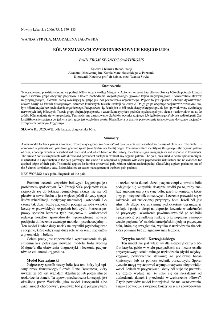 Nowiny Lekarskie 2006, 75, 2, 179–183 WANDA STRYŁA, MAGDALENA JAŁOWSKA BÓL W ZMIANACH ZWYRODNIENIOWYCH KRĘGOSŁUPA PAIN FROM SPONDYLOARTHROSIS Katedra i Klinika Rehabilitacji Akademii Medycznej im. Karola Marcinkowskiego w Poznaniu Kierownik Katedry: prof. dr hab. n. med. Wanda Stryła Streszczenie W opracowaniu przedstawiono nowy podział bólów krzyża według Maigne’a. Autor ten omawia trzy główne obszary bólu dla potrzeb klinicznych. Pierwsza grupa obejmuje pacjentów z bólem pochodzenia kręgosłupowego (głównie krążki międzykręgowe i powierzchnie stawów międzykręgowych). Główną cechą określającą tę grupę jest ból pochodzenia organicznego. Pojęcie to jest opisane i obecnie dyskutowane, a także bazuje na faktach historycznych, obrazach klinicznych, testach i reakcji na leczenie. Druga grupa obejmuje pacjentów z rozlanym i stałym bólem krzyża bez pochodzenia organicznego. Przypuszcza się, że nie jest to ból pochodzący z kręgosłupa, ale jest spowodowany dysfunkcją nerwowych dróg bólowych. Trzecia grupa obejmuje pacjentów z czynnikami ryzyka o podłożu psychosocjalnym, ale nie ma dowodów na to, że źródło bólu znajduje się w kręgosłupie. Ten model ma zastosowanie dla bólów odcinka szyjnego lub lędźwiowego z/lub bez radikulopatii. Zakwalifikowanie pacjenta do jednej z tych grup jest względnie proste. Klasyfikacja ta ułatwia postępowanie terapeutyczne dotyczące pacjentów z zespołami bólowymi kręgosłupa. SŁOWA KLUCZOWE: bóle krzyża, diagnostyka bólu. Summary A new model for back pain is introduced. Three major groups (or “circles”) of pain patients are described for the use of clinicians. The circle 1 is comprised of patients with pain from genuine spinal (mainly discs or facets) origin. The main feature identifying this group is the organic pattern of pain, a concept which is described and discussed, and which based on the history, the clinical signs, imaging tests and response to treatments. The circle 2 consists in patients with diffuse and permanent back pain, without any organic pattern. The pain, presumed to be not spinal in origin, is attributed to a dysfunction in the pain pathways. The circle 3 is comprised of patients with clear psychosocial risk factors and no evidence for a spinal origin of their pain. This model applies for lumbar or cervical pain, with or without radiculopathy. Classifying a given patient to one of the 3 circles is relatively easy. It should allow an easier management of the back pain patients. KEY WORDS: back pain, diagnosis of the pain. Problem leczenia zespołów bólowych kręgosłupa jest problemem społecznym. We Francji 50% pacjentów zgłaszających się do lekarza reumatologa skarży się na ból pleców, a nawet liczba ta jest większa jeżeli dotyczy specjalistów rehabilitacji, medycyny manualnej i osteopatii. Leczenie tak dużej liczby pacjentów pociąga za sobą wysokie koszty w przewlekłych zespołach bólowych. Potrzeba poprawy sposobu leczenia tych pacjentów i konieczności redukcji kosztów spowodowały wprowadzenie nowego podejścia do leczenia zwanego modelem psychosocjalnym. Ten model kładzie duży nacisk na czynniki psychologiczne i socjalne, które odgrywają dużą rolę w leczeniu pacjentów z przewlekłym bólem. Celem pracy jest zapoznanie i wprowadzenie do piśmiennictwa polskiego nowego modelu bólu według Maigne’a dla ułatwienia diagnostyki i leczenia pacjentów ze zmianami kręgosłupa. Model Kartezjański Najprostszy sposób oceny bólu jest ten, który był opisany przez francuskiego filozofa Rene Descartesa, który uważał, że ból jest sygnałem aktualnego lub potencjalnego uszkodzenia tkanek. Ta typowo mechaniczna koncepcja jest określona przez Waddella jako model kartezjański albo jako „model chorobowy”, ponieważ ból jest przypisywany do uszkodzenia tkanek. Jeżeli pacjent cierpi z powodu bólu podejmuje się wszystkie dostępne środki po to, żeby znaleźć anatomiczną przyczynę bólu, jeżeli to konieczne także przy pomocy technik obrazowych. Leczenie prowadzi się w zależności od znalezionej przyczyny bólu. Jeżeli ból jest silny lub długo się utrzymuje jednocześnie ograniczając funkcje i pacjent cierpi na depresję, leczenie w zależności od przyczyny uszkodzenia powinno uwolnić go od bólu i przywrócić prawidłową funkcję oraz poprawić samopoczucie pacjenta. W modelu kartezjańskim jedyna przyczyna bólu, którą się uwzględnia, wynika z uszkodzenia tkanek, która powinna być zdiagnozowana i leczona. Krytyka modelu Kartezjańskiego Ten model nie jest właściwy dla niespecyficznych bólów krzyża, gdzie w wielu przypadkach nie można ustalić przyczynowego strukturalnego uszkodzenia (dyski międzykręgowe, powierzchnie stawowe) na podstawie badań klinicznych lub za pomocą technik obrazowych. Sporadycznie mogą występować asymptomatyczne nieprawidłowości. Jednak w przypadkach, kiedy ból staje się przewlekły często wydaje się, że staje się on niezależny od uszkodzenia tkanek i przechodzi w „schorzenie bólowe”. Z tych powodów model kartezjański nie ma zastosowania, a nawet powoduje zawyżone koszty leczenia spowodowane Wanda Stryła, Magdalena Jałowska 180 nie przynoszącymi skutku wizytami u chirurga, badaniami obrazowymi, leczeniem, operacjami. Ostatecznie nie zapobiega on rozwojowi przewlekłego bólu, który jest najgorszą odmianą zespołu bólowego kręgosłupa. Model psychosocjalny Model psychosocjalny był wprowadzony przez Waddella. Obecnie jest on szeroko akceptowany i rozumiany jako standardowy. Miał on wpływ na główne kliniczne wytyczne dotyczące zespołu bólowego kręgosłupa. Pochodzenie zespołu bólowego kręgosłupa Kluczowym pojęciem jest dysfunkcja tkanek miękkich (mięśni, powięzi), które powodują powstanie bólów krzyża. Pod wpływem teorii osteopatycznej, model psychosocjalny zaprzecza, że największą rolę w indukcji bólu odgrywa kręgosłupo
