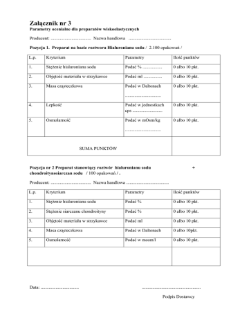Załącznik nr 3 Parametry ocenialne dla preparatów wiskoelastycznych Producent: ................................... Nazwa handlowa ..................................... Pozycja 1. Preparat na bazie roztworu Hialuronianu sodu / 2.100 opakowań / L.p. Kryterium Parametry Ilość punktów 1. Stężenie hialuronianu sodu Podać % ................. 0 albo 10 pkt. 2. Objętość materiału w strzykawce Podać ml ................ 0 albo 10 pkt. 3. Masa cząsteczkowa Podać w Daltonach 0 albo 10 pkt. ............................... 4. Lepkość Podać w jednostkach cps .......................... 0 albo 10 pkt. 5. Osmolarność Podać w mOsm/kg 0 albo 10 pkt. ............................... SUMA PUNKTÓW Pozycja nr 2 Preparat stanowiący roztwór hialuronianu sodu chondroitynosiarczan sodu / 100 opakowań / . + Producent: ................................... Nazwa handlowa ..................................... L.p. Kryterium Parametry Ilość punktów 1. Stężenie hialuronianu sodu Podać % 0 albo 10 pkt. 2. Stężenie siarczanu chondroityny Podać % 0 albo 10 pkt. 3. Objętość materiału w strzykawce Podać ml 0 albo 10 pkt. 4. Masa cząsteczkowa Podać w Daltonach 0 albo 10pkt. 5. Osmolarność Podać w mosm/l 0 albo 10 pkt. Data: ................................. ................................................... Podpis Dostawcy Sposób obliczania poszczególnych parametrów: Pozycja nr 1. 1. Parametr „stężenie hialuronianu sodu” - 10 pkt. otrzyma materiał wiskoelastyczny zawierający 1,0 % hialuronianu sodu, inne 0 pkt. 2. Za parametr „objętość strzykawki” – 10 pkt. zostanie przyznane materiałowi wiskoelastycznemu o objętości 0,85 ml, inna objętość otrzyma 0 pkt. 3. Za parametr „masa cząsteczkowa” – 10 pkt. zostanie przyznane masie cząsteczkowej 2,0 mln Daltona, inna masa cząsteczkowa otrzyma 0 pkt. 4. Za parametr „lepkość” największa ilość punktów zostanie przyznana jeżeli będzie ona wynosiła 280 000 mPa.s., za inną lepkość produkt otrzyma 0 pkt. 5. Za parametr „osmolarność” największa ilość punktów zostanie przyznana jeżeli będzie ona wynosiła 307 mOsm/kg, inna osmolarność otrzyma 0 pkt. Pozycja nr 2. 1. Parametr „stężenie hialuronianu sodu” - 10 pkt. otrzyma materiał wiskoelastyczny zawierający 1,7 % hialuronianu sodu, inne 0 pkt. 2. Parametr „stężenie siarczanu chondroityny” - 10 pkt. otrzyma materiał wiskoelastyczny zawierający 4% siarczan chondroityny, inne 0 pkt. 3. Za parametr „objętość strzykawki” – 10 pkt. zostanie przyznane materiałowi wiskoelastycznemu o objętości 1,0 ml, inna objętość otrzyma 0 pkt. 4. Za parametr „masa cząsteczkowa hialuroniau sodu” – 10 pkt. zostanie przyznane masie cząsteczkowej 1,7 mln Daltonów, inna masa cząsteczkowa otrzyma 0 pkt. 5. Za parametr „osmolarność” 10 pkt. zostanie przyznane jeżeli będzie ona wynosiła pomiędzy 260 a 330 mOsm/l, inne 0 pkt. Ilość punktów za ocenę techniczną stanowi suma punktów uzyskanych w pozycjach nr 1 i 2 zadania.